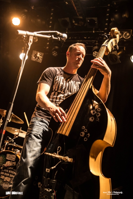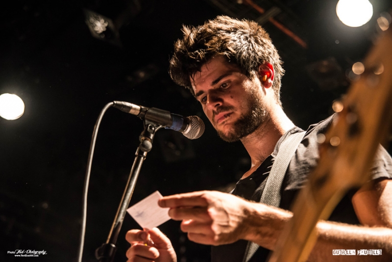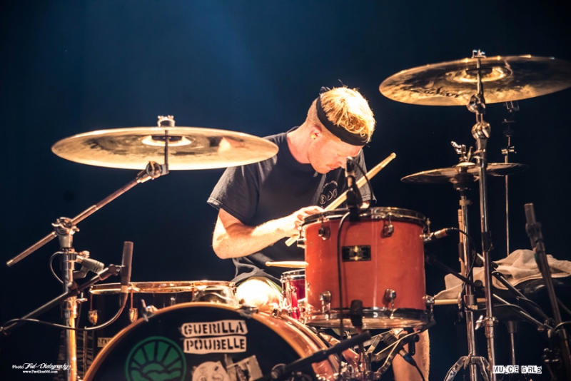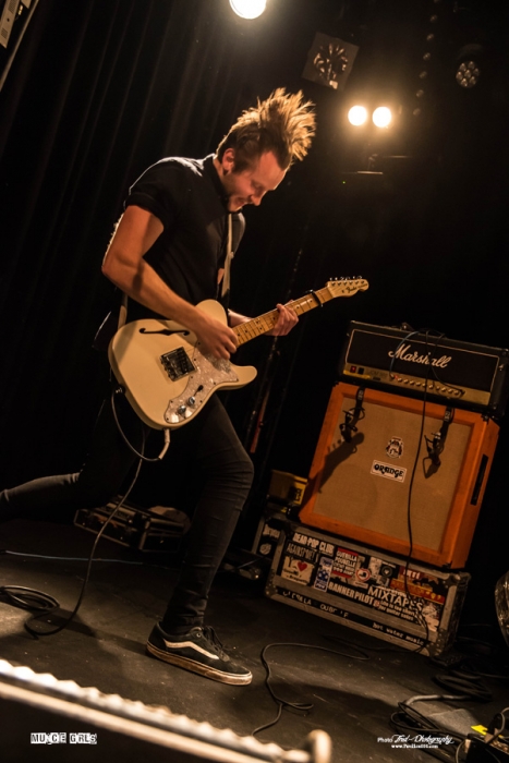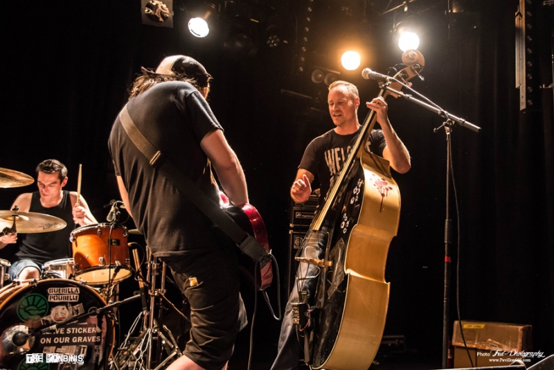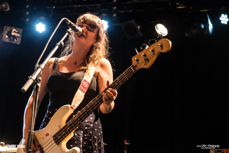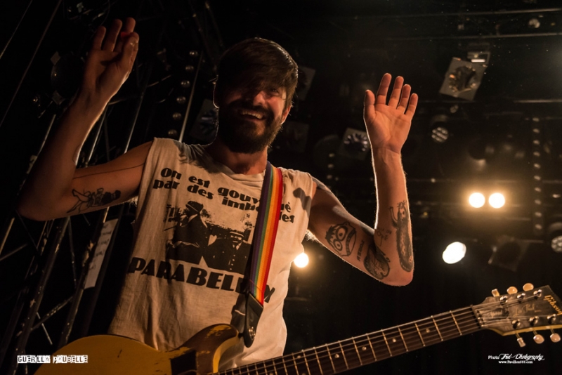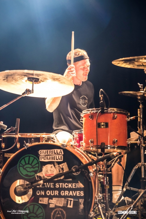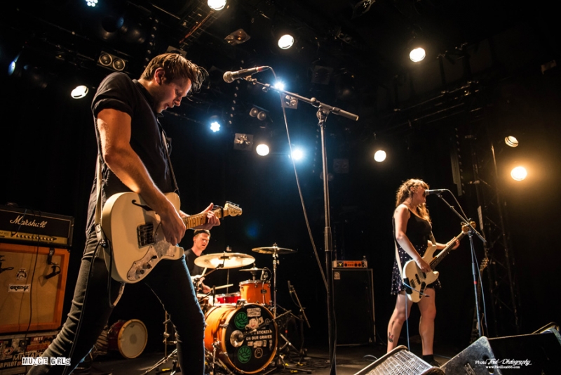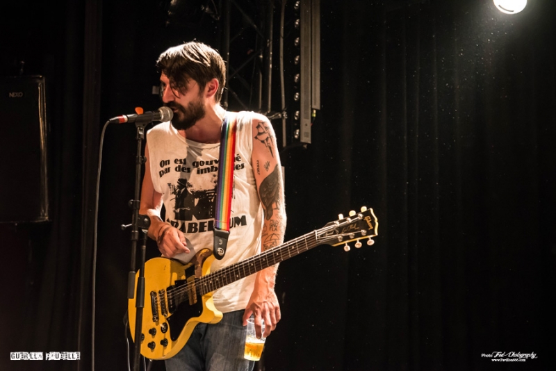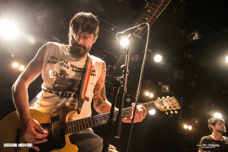 C’est donc à The Konbinis et leur punk rock marqué par les 90’s qu’incombe la tâche d’ouvrir le bal. A mi-chemin entre Blink 182 et Green Day, Les Rennais se démarque surtout de ces groupes par la présence d’une contrebasse très psychobilly. Ce contrebassiste n’est d’ailleurs pas un inconnu puisqu’il s’agit de Rico des Banane metalik, mais dans une version moins sanguinolente. Ce n’est pas le premier passage des Rennais en terre nantaise avec, entre autre, un passage l’an dernier sur las scène Michelet et on pourra à nouveau les voir au ferrailleur d’ici la fin de l’année en première partie de The Meteors. Un set principalement basé sur leur premier album « Plastic punks » sera offert ce soir dont « Losing game », »I don’t know what you want » ou « secret girl » ainsi que la reprise de T.a .t.u « all the things she said » un choix osé, mais plutôt fun finalement. Le tout donne un bon aperçu de ce que sait faire ce trio Rennais. On passe ensuite à Muncie girls qui arrive tout droit d’Exeter et qui est actuellement en tournée avec Guerilla Poubelle. Qui a dit qu’une fille ne pouvait pas jouer dans un groupe punk, en tout cas ce n’est sûrement pas eux et la belle Lande Hekt, par sa voix pop sucré, n’aura aucun mal à charmer le public Nantais venu apprécier leur punk rock aux accents pop. Leur premier album « From caplan to belsize » montre déjà un groupe intéressant et prometteur et par leur prestation de la soirée, on peut aussi dire que les trois jeunes gens possèdent aussi une belle énergie scénique. Un groupe à suivre et une belle découverte. Il ne faudra que quelques notes de « Punkrock is not job » pour mettre le ferrailleur sans dessus dessous. On se pousse, on saute, on hurle et ce pendant l’heure et demi que durera le concert des Parisiens. Certaine mauvaise langue qui écoutait Guérilla au début des années 2000 pourraient se dire « Ils existent encore Guérilla Poubelle », Eh oui ! » Toujours debout », comme dirait l’autre et toujours prêt à distiller leur mépris de la société de consommation et du système. Punk un jour, punk toujours ! On pourra d’ailleurs remarquer quelques crêtes un peu décrépies dans la salle, Punk is definitively not dead ! Si le Guérilla poubelle des début n’est plus, il n’y a plus que Till Lemoine du groupe d’origine, Ils continuent d’être productif avec la sortie d’un Ep Inferno, qui donne donc l’occasion au trio de parcourir la France pour promouvoir cette nouvelle offrande et surtout pour faire la fête. L’ex betteraves est en terrain conquis au hangar à banane, « Carcassonne », »seuls au pluriel » ou « l’amour est un chien de l’enfer » font partis des quelques brûlots distillés par la bande et sans que Till ne se mette à poil comme il aura pourtant été plusieurs fois demandé au cours du concert. Le dernier quart d’heure aura sûrement été le moment le plus bordélique, avec des reprises à l’arrache, façon fête de la musique, de standard de la chanson en mode guérilla poubelle en roue libre, Noir Désir, Nirvana etc… avec en final « Demain il pleut » histoire de bien finir la soirée. Un grand merci à l’asso Justine et au ferrailleur pour l’organisation de cette soirée mémorable. |
