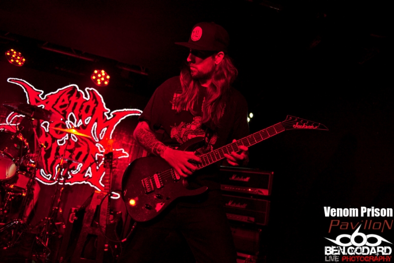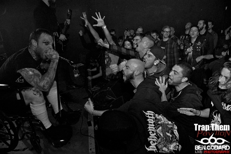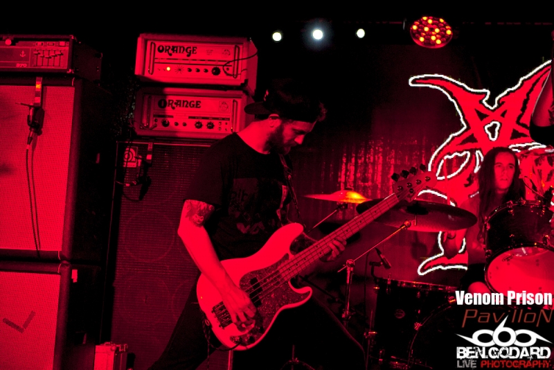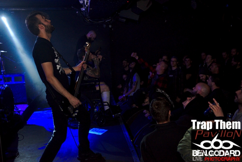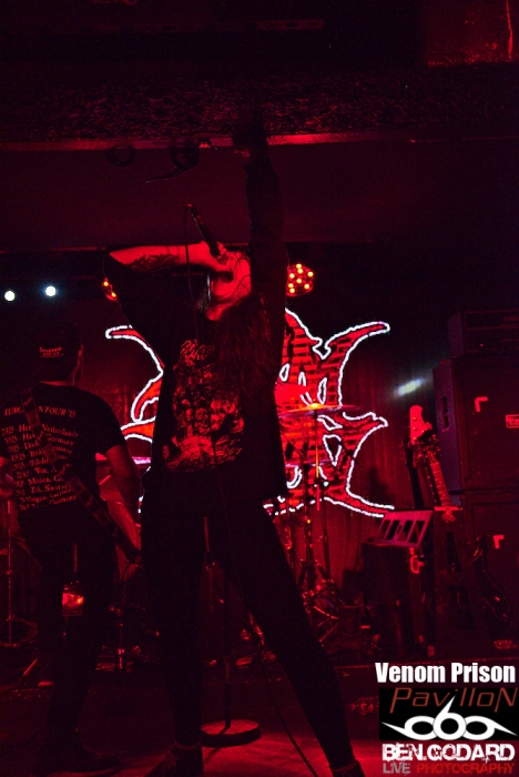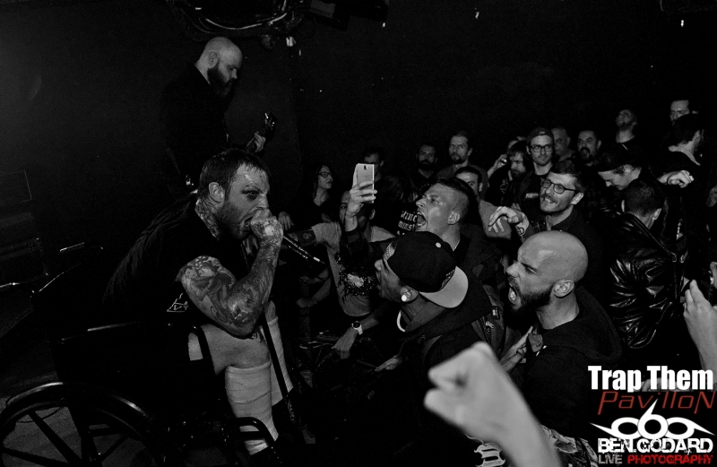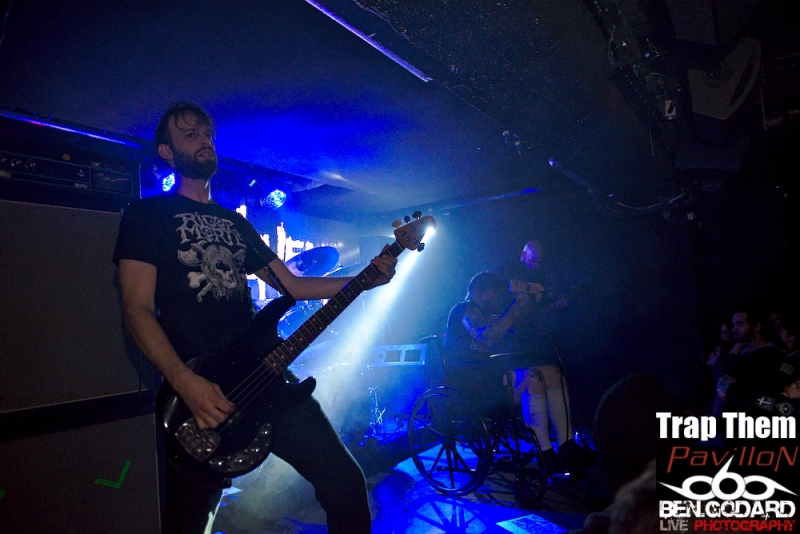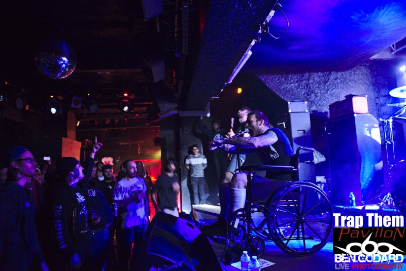 Ce soir la salle du Gibus est loin d’être comble pour accueillir nos anglais de Venom Prison. Ils viennent de sortir leur premier album « Animus » chez Prosthetic. Il peut être intéressant de savoir que leur style est souvent étiqueté comme « death/hardcore ». Et même si les riffs les plus hardcore sont en minorités, il faut savoir que Venom Prison jouit d’une certaine notoriété sur la scène hardcore française. Il faut dire qu’on a pu les voir lors d’affiches et festivals hardcore. Pourtant Venom Prison propose un death metal assez classique tout en mélangeant des riffs bien techniques. L’une des particularités de Venom Prison tient tout simplement du fait que le chant est féminin, mais ressort parfaitement masculin!! Mais le plus intéressant c’est lorsqu’on connaît l’engagement du groupe contre le sexisme et la misogynie. Oui, avec un titre comme « Perpetrator Emasculation », on comprend vite qu’il ne faut pas trop faire le malin et que Venom Prison prendra parti si besoin. Le set débute assez mollement bizarrement, on s’attend à voir une débauche d’énergie exemplaire mais il me semble que bassiste et batteur ont quelques légers problèmes pour se caler. Mais petit à petit, la machine déroule, ça part à fond, Larissa bouge de manière plus véhémente, les harmoniques artificiels donnent de l’agressivité et le show est bel et bien lancé. Pas beaucoup de communication avec le public, cela aurait peut-être permis d’enflammer le pit qui reste plutôt stoïque. Cela dit, le set était dans l’ensemble assez furieux et l’on souhaite vivement les revoir dans l’hexagone. Afin de rendre l’affiche bien écclectique, c’est Okkultokrati qui se présente pour la suite. Eux, viennent de sortir un LP, « Raspberry Dawn » très récemment. Leur musique vacille entre un sludge crust assez punk voire black par la voix. Le combo propose de petites ambiances psychédéliques grâce à leur claviériste. Le bassiste est vraiment celui qui se démarque par sa prestance et son envie de remuer est inégalable! Bien que l’on ne puisse pas enlever les qualités des membres du groupe, Okkultokrati tranche peut-être un peu trop avec les deux autres groupes. Cependant pas mal de personnes semblent être venues pour eux et restent assez réceptives face à ce son bien original. La tête d’affiche c’est Trap Them. Ce combo américain, qui vient de sortir « Crown Feral » chez Prosthetic aussi, avait laissé un message, sur les réseaux sociaux, assez clair comme quoi leur chanteur, Ryan McKenney s’était cassé cheville et talon mais qu’il serait présent pour le reste de la tournée. Cela promet! L’arrivée des artistes est assez surréaliste: notre blessé du soir est en fauteuil roulant et il faudra la force de 3-4 membres du staff pour l’installer sur scène. Le Bloodshed Fest (lieu du drame) n’a jamais mieux porté son nom à la vue des contusions et de l’oeil poché de notre frontman. Déjà, cela annonce bien la couleur , Trap Them n’est pas venu pour enfiler les perles, et ils ne sont pas prêts à renoncer à quoi que ce soit ! Après de très vives présentation, le set commence. Et là, misère, Ryan McKenney, gesticule dans tous les sens sur son fauteuil et braille comme si de rien n’était ! Bizarrement, les titres qui, sur l’album, peuvent paraître répétitifs sont beaucoup plus dissociés avec une basse bien présente. Le public est hyper présent et dépanne bien le chanteur lorsque celui-ci galère quelque peu avec ses bouteilles d’eau. Trap Them propose un set bien gras et sale mais que l’on apprécie tellement. La débauche d’énergie du chanteur semble tellement paradoxale avec son état de santé du moment ! Le concert se termine sur un dernier titre dévastateur et le public aura bien rendu justice à Trap Them en se démenant aussi d’une belle manière. Kongfuzi a su répondre aux fans en organisant cette belle affiche. Le mérite revient à Ryan McKenney qui, salement abîmé, a sorti une prestation assez dingue. Cela donne envie de voir ce que donne Trap Them, lorsque Ryan sera de nouveau disponible sur ses jambes ! Merci à Pavillon ainsi qu’à l’équipe du Gibus pour le pass photo |