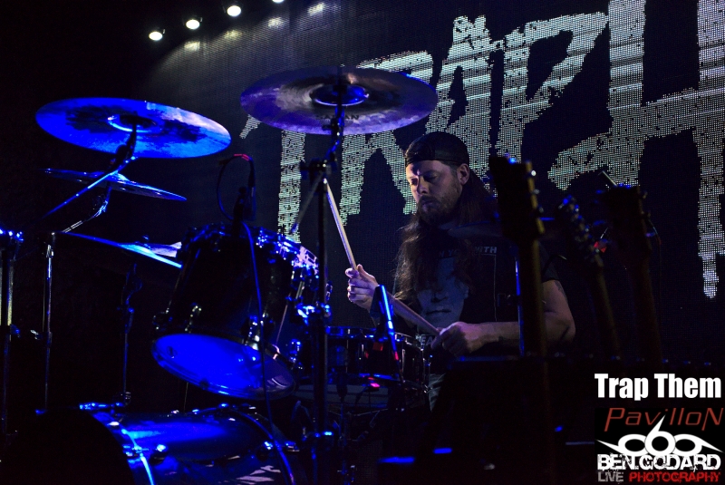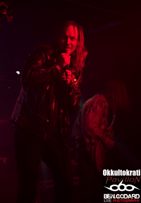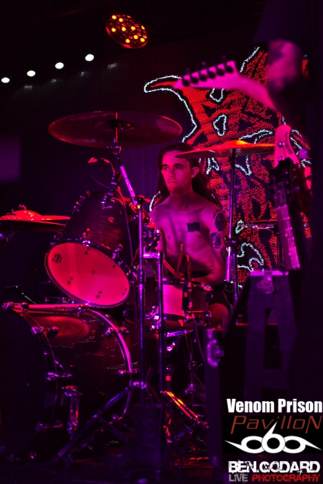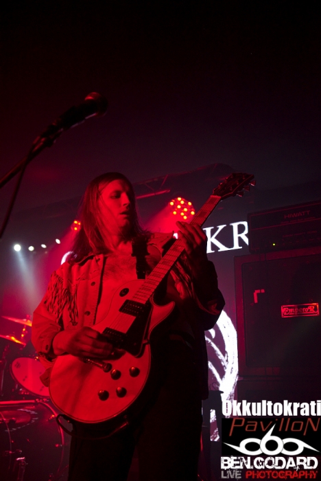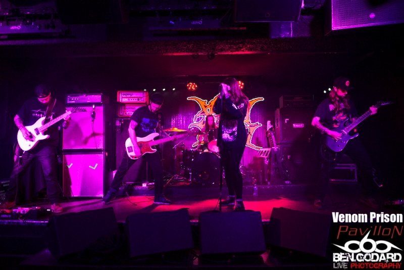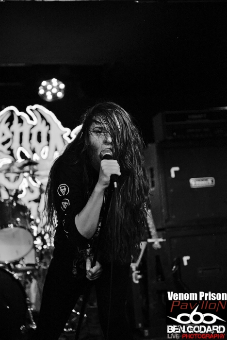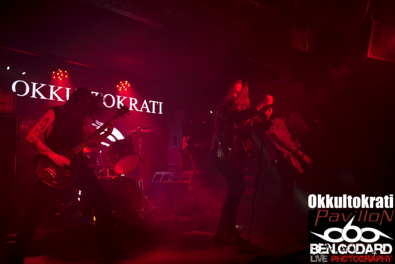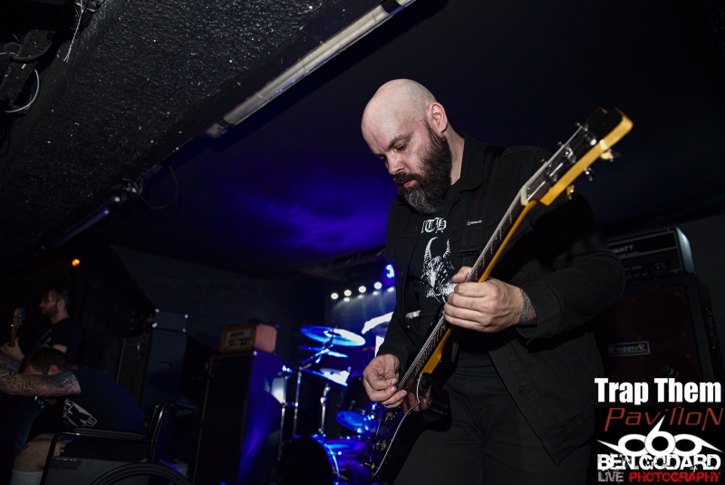 Ce soir la salle du Gibus est loin d’être comble pour accueillir nos anglais de Venom Prison. Ils viennent de sortir leur premier album « Animus » chez Prosthetic. Il peut être intéressant de savoir que leur style est souvent étiqueté comme « death/hardcore ». Et même si les riffs les plus hardcore sont en minorités, il faut savoir que Venom Prison jouit d’une certaine notoriété sur la scène hardcore française. Il faut dire qu’on a pu les voir lors d’affiches et festivals hardcore. Pourtant Venom Prison propose un death metal assez classique tout en mélangeant des riffs bien techniques. L’une des particularités de Venom Prison tient tout simplement du fait que le chant est féminin, mais ressort parfaitement masculin!! Mais le plus intéressant c’est lorsqu’on connaît l’engagement du groupe contre le sexisme et la misogynie. Oui, avec un titre comme « Perpetrator Emasculation », on comprend vite qu’il ne faut pas trop faire le malin et que Venom Prison prendra parti si besoin. Le set débute assez mollement bizarrement, on s’attend à voir une débauche d’énergie exemplaire mais il me semble que bassiste et batteur ont quelques légers problèmes pour se caler. Mais petit à petit, la machine déroule, ça part à fond, Larissa bouge de manière plus véhémente, les harmoniques artificiels donnent de l’agressivité et le show est bel et bien lancé. Pas beaucoup de communication avec le public, cela aurait peut-être permis d’enflammer le pit qui reste plutôt stoïque. Cela dit, le set était dans l’ensemble assez furieux et l’on souhaite vivement les revoir dans l’hexagone. Afin de rendre l’affiche bien écclectique, c’est Okkultokrati qui se présente pour la suite. Eux, viennent de sortir un LP, « Raspberry Dawn » très récemment. Leur musique vacille entre un sludge crust assez punk voire black par la voix. Le combo propose de petites ambiances psychédéliques grâce à leur claviériste. Le bassiste est vraiment celui qui se démarque par sa prestance et son envie de remuer est inégalable! Bien que l’on ne puisse pas enlever les qualités des membres du groupe, Okkultokrati tranche peut-être un peu trop avec les deux autres groupes. Cependant pas mal de personnes semblent être venues pour eux et restent assez réceptives face à ce son bien original. La tête d’affiche c’est Trap Them. Ce combo américain, qui vient de sortir « Crown Feral » chez Prosthetic aussi, avait laissé un message, sur les réseaux sociaux, assez clair comme quoi leur chanteur, Ryan McKenney s’était cassé cheville et talon mais qu’il serait présent pour le reste de la tournée. Cela promet! L’arrivée des artistes est assez surréaliste: notre blessé du soir est en fauteuil roulant et il faudra la force de 3-4 membres du staff pour l’installer sur scène. Le Bloodshed Fest (lieu du drame) n’a jamais mieux porté son nom à la vue des contusions et de l’oeil poché de notre frontman. Déjà, cela annonce bien la couleur , Trap Them n’est pas venu pour enfiler les perles, et ils ne sont pas prêts à renoncer à quoi que ce soit ! Après de très vives présentation, le set commence. Et là, misère, Ryan McKenney, gesticule dans tous les sens sur son fauteuil et braille comme si de rien n’était ! Bizarrement, les titres qui, sur l’album, peuvent paraître répétitifs sont beaucoup plus dissociés avec une basse bien présente. Le public est hyper présent et dépanne bien le chanteur lorsque celui-ci galère quelque peu avec ses bouteilles d’eau. Trap Them propose un set bien gras et sale mais que l’on apprécie tellement. La débauche d’énergie du chanteur semble tellement paradoxale avec son état de santé du moment ! Le concert se termine sur un dernier titre dévastateur et le public aura bien rendu justice à Trap Them en se démenant aussi d’une belle manière. Kongfuzi a su répondre aux fans en organisant cette belle affiche. Le mérite revient à Ryan McKenney qui, salement abîmé, a sorti une prestation assez dingue. Cela donne envie de voir ce que donne Trap Them, lorsque Ryan sera de nouveau disponible sur ses jambes ! Merci à Pavillon ainsi qu’à l’équipe du Gibus pour le pass photo |