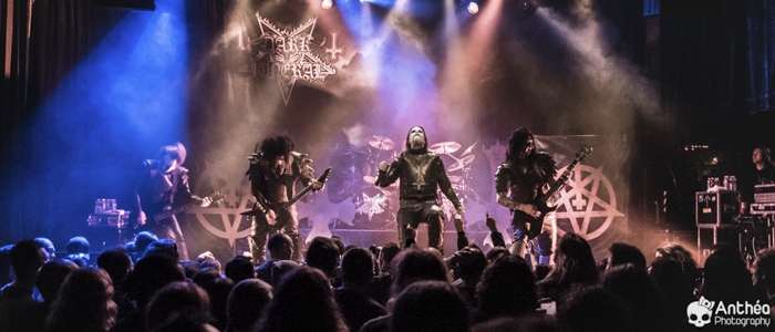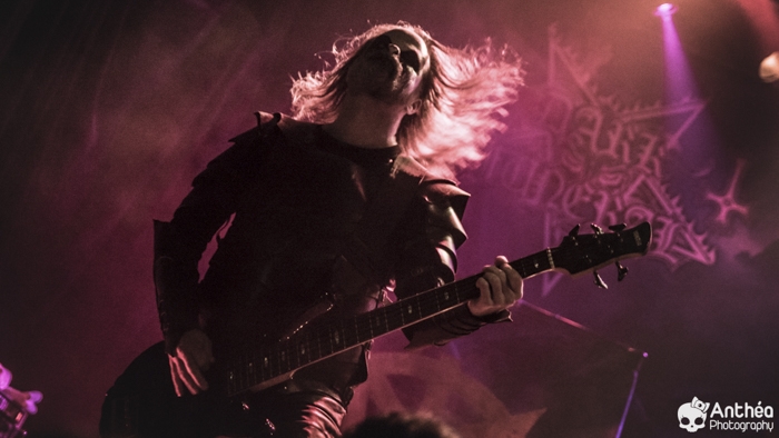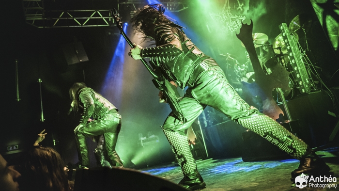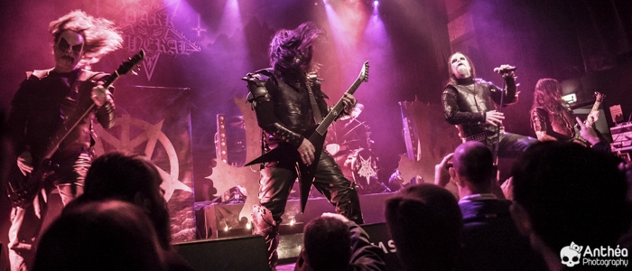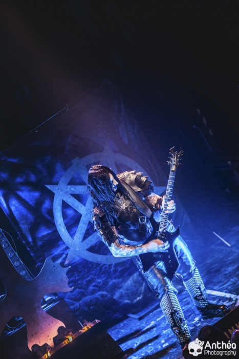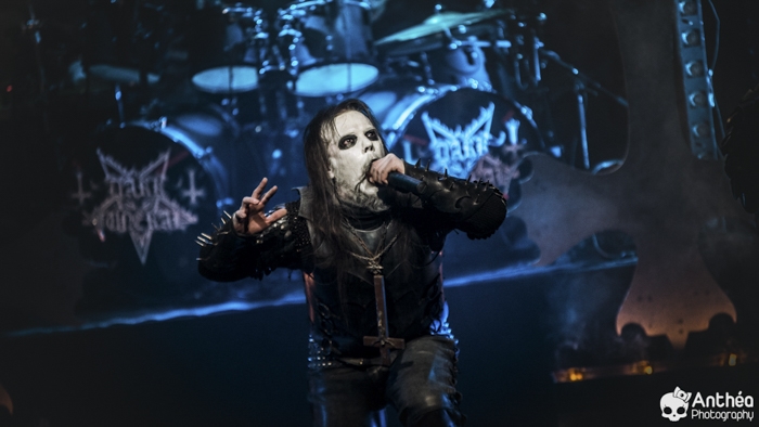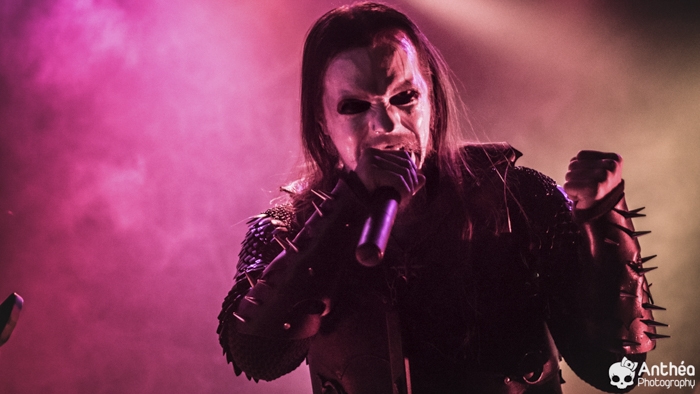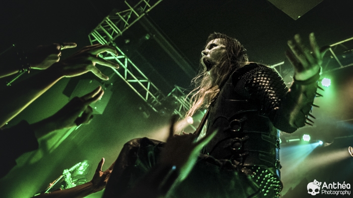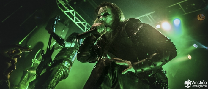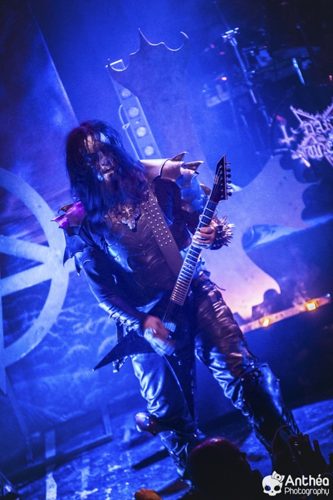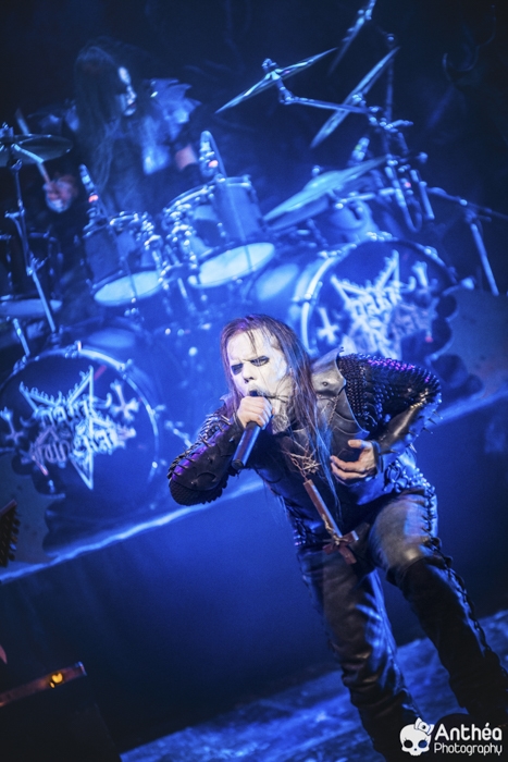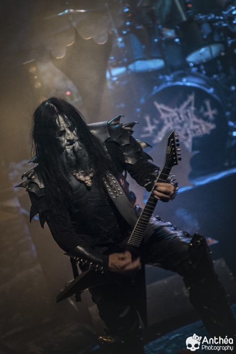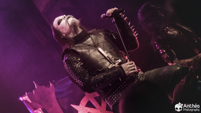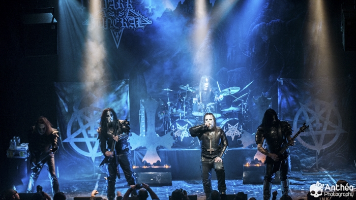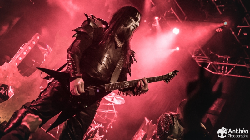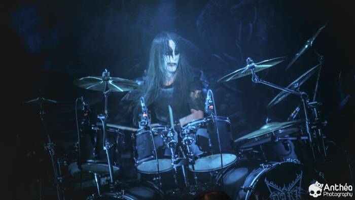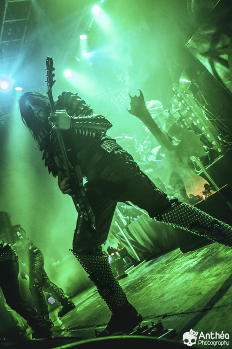La tournée « Shadows Over Europe » se conclue ce soir à Lyon et DARK FUNERAL semble déterminé à la conclure d'une manière efficace. On découvre une scène chargée de croix inversées et de pentagrammes. Afin de compléter l'ambiance, des bougies sont allumées sous les croix. DARK FUNERAL a travaillé son show, mais aussi ses costumes et son maquillage pour cette tournée afin de vous faire pénétrer au mieux dans l'ambiance de sa musique. Le groupe officie depuis pas mal d'années, 23 pour être exact et a connu pas mal de changements de line up. Des débuts il nous reste les deux guitaristes Chaq Mol et Lord Ahriman. Le chanteur Emperor Magus Caligula ayant quitté le groupe en 2014, il est désormais remplacé par Heljarmad qui lui succède plutôt bien. A la différence d'un KRISIUN, DARK FUNERAL ne fait pas le nuancé. Sa musique est clairement orientée vers le black metal extrême, rapide et bien produit. Le groupe a choisi de sortir des enregistrements caverneux pour aller enregistrer du côté de chez Peter TÄGTGRËN qui les suit depuis longtemps. Le résultat de cette production est forcément orienté vers quelque chose de clair, puissant et efficace. En concert, le groupe vous livre un flot extrême de black metal qui rapidement vous plonge dans une ambiance particulière. On couvre toutes les périodes du groupe par un choix de titre large. Le show est plutôt intéressant même si pour ma part le flot ininterrompu qui au bout d'un moment manque de nuances. Disons que sur la durée ce groupe manque un peu de rebondissements et c'est que j'ai toujours eu tendance à leur reprocher. Mais DARK FUNERAL a le mérite de garder son cap depuis ses débuts et ne se compromet pas. C'est un avantage qu'a cette formation, là où d'autres sont aller faire des tests à droite et à gauche pour finalement ne jamais vraiment en revenir, en se perdant tout simplement.