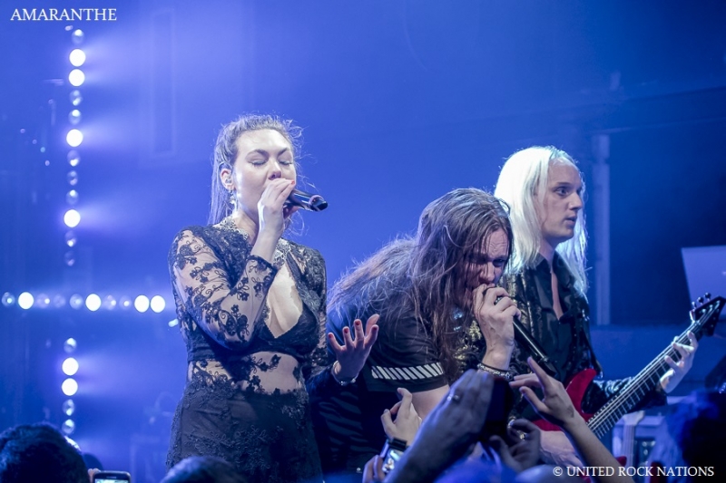 Amaranthe fait escale à Paname pour promouvoir son dernier album "Maximalism", avec dans ses bagages Sonic Syndicate et Smash into pieces. Les 450 places de la salle sont aux 3/4 remplies lorsque les jeunes et dynamiques Smash into pieces entrent en scène, ils produisent un métal électro alternatif très visuel, avec un écran qui projette des images et le batteur avec son masque à LED assez énigmatique. Ils sont jeunes, beaux gosses et leur set m'a assez convaincu, même si la salle a un peu de mal à se réveiller malgré leur musique efficace. Une belle découverte à voir sur une scène plus grande. Deuxième groupe à se produire ce soir, les Sonic Syndicate, qui défendent leur dernier album "Confession", j'avais d'ailleurs eu la chance d'interviewer Nathan, le charismatique frontman, seul non Suédois de la soirée d'ailleurs, et je suis curieux de le voir se produire sur scène tant les titres de l'albums sont efficaces. Le mec ne fait pas semblant ! Malgré une sono moyenne de sa voix, il se donne à fond, bondit partout sur la micro scène, harrangue le public qui commence à se réveiller vers la fin du set pour vraiment se donner sur le titre "Confession" repris en bouquet final. Malgré la sonorisation moyenne, et la salle transformée en hammam, un très bon set. Arrivent enfin Amaranthe et ses 3 chanteurs, la sublime Elize s'est parée de ses plus beaux atours pour séduire un public conquis d'avance. Ils défendent leur nouvel et 4ième album "Maximalism" sorti le 21 octobre dernier chez Spinefarm records enregistré par l'incontournable Jacob Hansen. Le set attaque direct par les 2 premiers titres du dernier album "Maximize" et "Boomerang" pour mettre la salle dans sa poche, Elize est souriante et communicative, Jacob et Henrik sont très en voix et le son est très bon. Leur musique, qu'on apprécie ou pas le genre, est ultra efficace et donne envie de bouger, dans un petit bain ultra chaud bouillant. Le set est une succession des tubes du combo, entrecoupée d'un solo de batterie d'anthologie signé mister Morten Lowe Sorensen. Une heure trente conclue par le méga hit planétaire "Drop dead cynical". La salle est trempée de sueur mais ravie, ce soir c'était un pack concert + Hammam, une belle soirée ! Merci à Roger Wessier. Crédit photo FredBebel et Peetlight Peetof. Setlist AMARANTHE : 1. Maximize 2.Boomerang 3.Hunger 4. Invincible 5. Lightyears 6. Trinity 7. True 8. Fury 9. Intro - Endlessy 10. DRUM SOLO 11. On The Rocks 12. Automatic 13. The Nexus 14. Amaranthine 15. Call Out My Name 16. Digital World 17. That Song 18. Dynamite 19. Drop Dead Cynical |