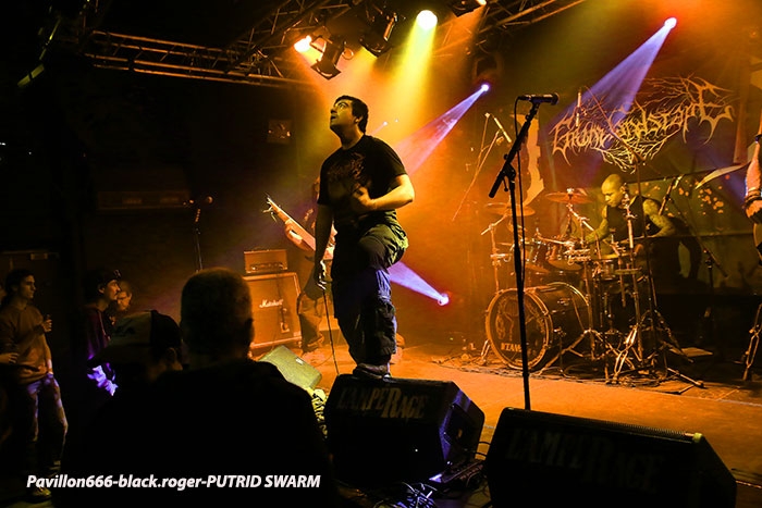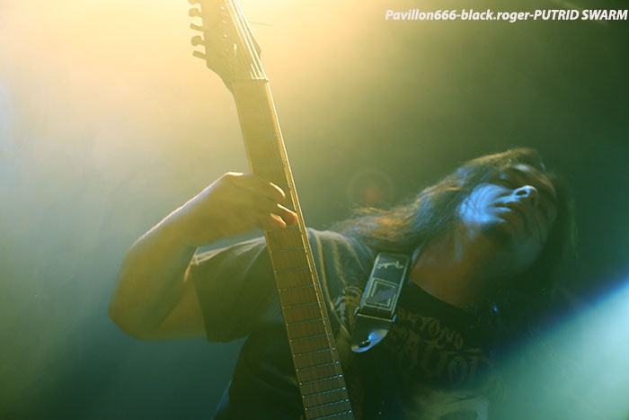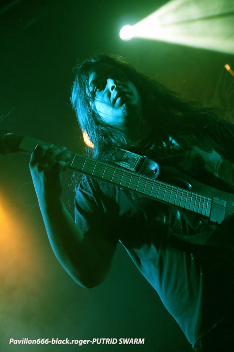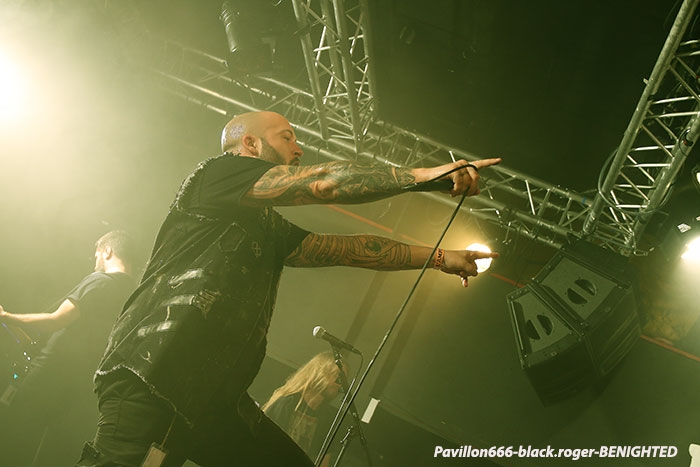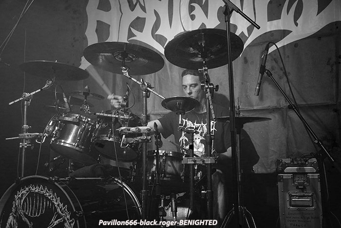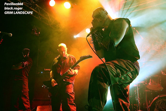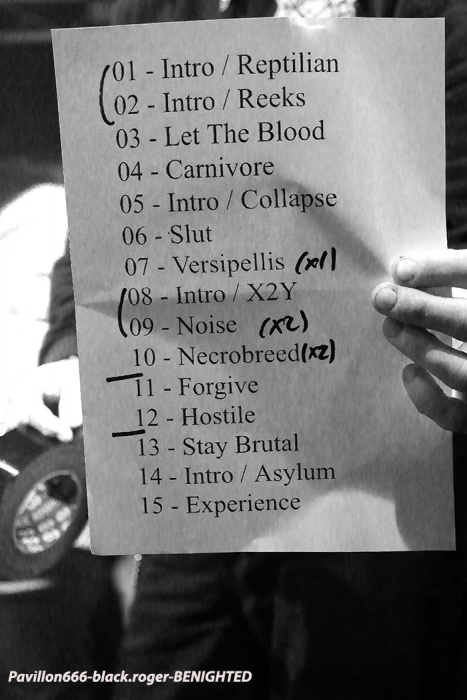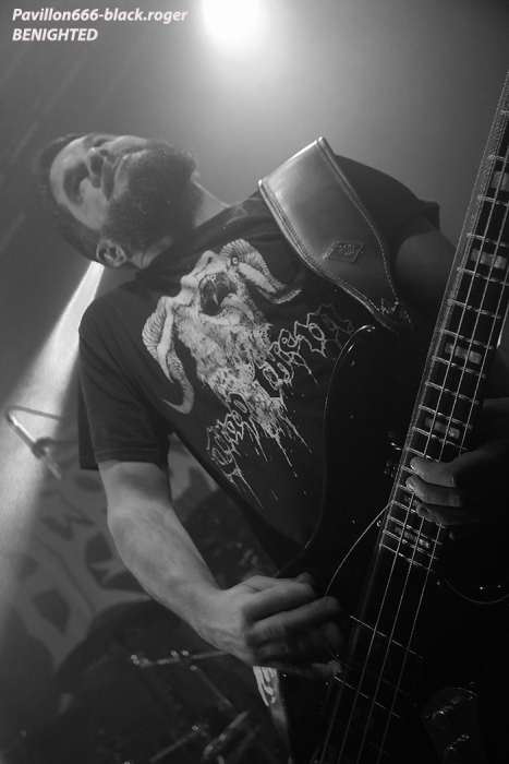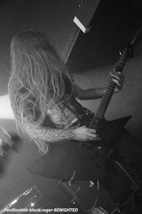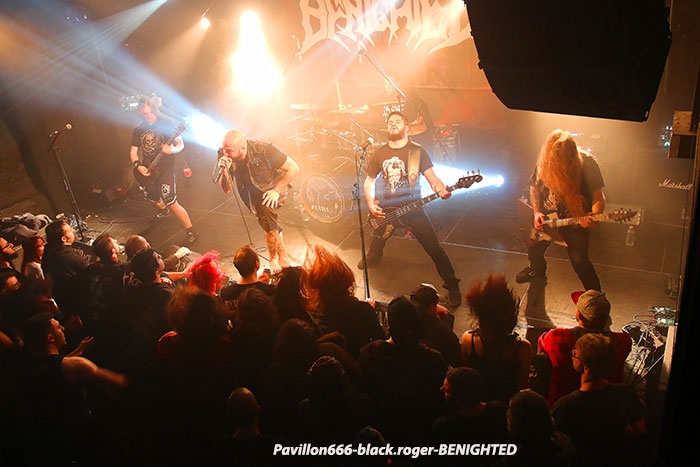 Il est à peine 20 heures 30 lorsque PUTRID SWARM lance les débats avec au menu du brutal death saupoudré de grind. Les quatre Grenoblois semblent être ravis de présenter leur musique en live devant un public réceptif. Les « repets » c’est bien, les concerts, c’est mieux, et ils sont donc remontés ce soir comme des « coucous ». Si vous aviez écouté leur démo deux titres auparavant, vous ne serez pas déçus ce soir par leur death sans concession, qui appuie là où ça fait mal (ou du bien c’est selon). Alors pas la peine de vous faire un long discours, le potentiel est là et ils ont assuré comme des bêtes, bravo les mecs vous revenez quand vous voulez. Du death au black il n’y a qu’un pas que nous franchissons allègrement avec la venue là devant nous de GRIM LANDSCAPE. Soudain, c’est la guerre, la haine se déverse en flot continu. Le quatuor nous propose un black sulfureux, rapide, guerrier et sans fioritures. Et c’est le choc visuel et musical, comment résister ! Il est vrai que ces musiciens ne sont pas nés de la dernière pluie acide avec notamment des membres de Nocturnal Depression et de That Old Black Magic. Alors, le paysage est soudain sombre (sic), l’ambiance électrique, la chorégraphie scénique provocante, les compositions accrocheuses en diable. Et en fin de set le groupe rallie tout le monde à sa cause avec la reprise du fameux titre « Orgamastron » de Motörhead, cqfd ! Set-list en photo. BENIGHTED n’est pas venu ce soir à Grenoble pour enfiler des perles, vous le saviez déjà. Il vient nous proposer des titres de son nouvel opus « necrobreed » objet d’une grosse tournée qui démarre là tout de suite sur les planches de l’Ampérage avec « Reptillian » titre phare (voir clip vidéo) de ce nouvel album. Mais que serait un show sanguinolant de Benighted sans « let the blood spill between my broken teeth », « slut », « stay brutal » ou encore « asylum cave » ? Alors, ça tabasse sec, c’est du non-stop pratiquement, vous êtes collés au plafond sans pouvoir redescendre, inutile de résister ces, gars- là ne vous font pas de cadeau. Tout est en place dans cette brutalité death/grind/gore et vous aimez ça rien qu’à voir les mouvements dans le pit, ça vole de partout, la sueur dégouline, mais où est donc passée ma godasse et mon smartphone ? Avec ce nouveau line-up, le groupe est maintenant bien opérationnel, pas de « couac », pas de faux plis, ça joue vite, ça joue fort et Julien contrôle la meute en donnant toujours de sa personne, quelle claque, quelle baffe, le groupe vous prend à la gorge et ne vous lâche plus. A la fin du show vous avez l’impression d’avoir passé sous un train lancé à grande vitesse. Merci le gang des Stéphanois, la machine Benighted est repartie de plus belle, mais en fait elle ne s’est jamais arrêtée, incroyable ! Set-list en photo. Soirée chaude donc à L’Ampérage, il ne pouvait en être autrement. Merci à Metallian Productions et merci à cette sympathique salle grenobloise pour l’accueil toujours apprécié. |