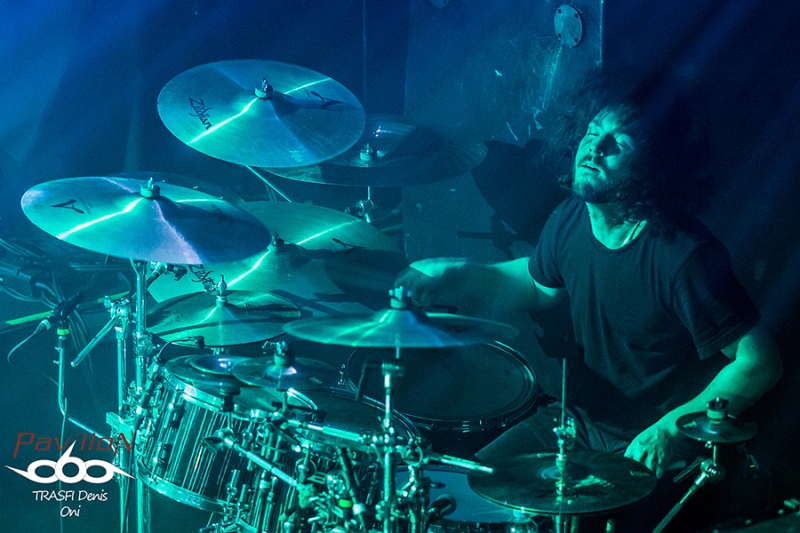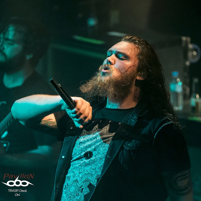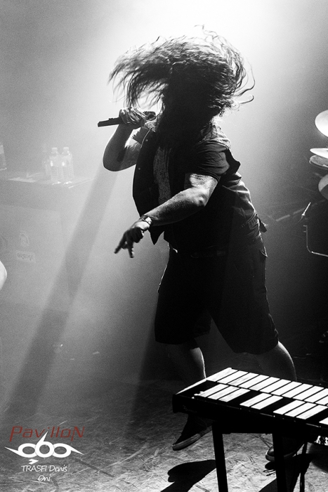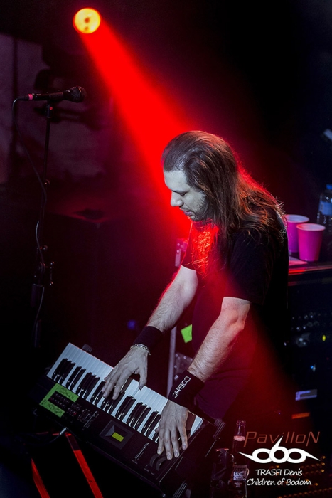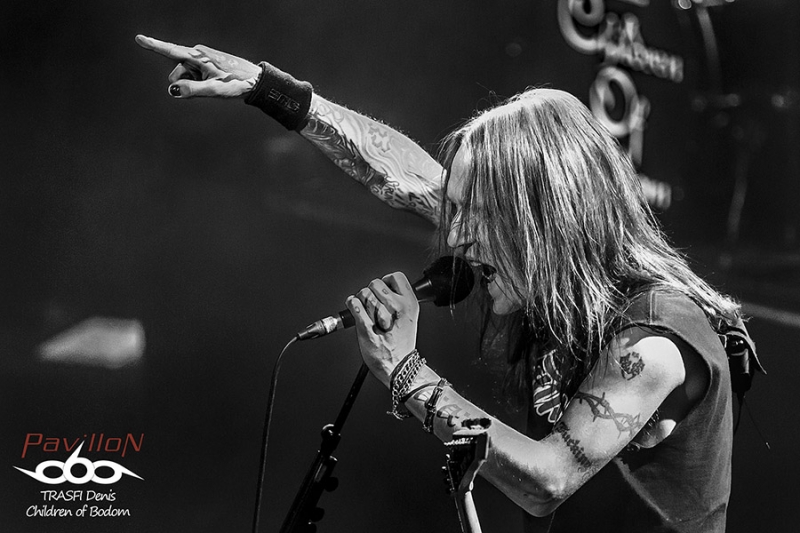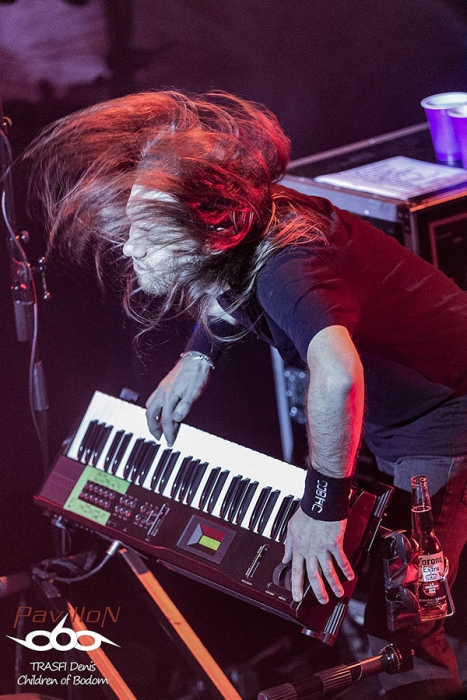 Après un changement de plateau, vient le tour d’Oni. Sur ce coup là on change complètement d’atmosphère. Oni envoi une grosse claque au public en leur jetant un son bien puissant et un chant guttural rocailleux. Groupe canadienils proposent un style plus proche du black métal avec des rythmiques de death. Les riffs et les solos s’envolent de tout bord mais le jeu scénique côté guitare et bass reste discret. Ce groupe dévoile 2 particularité. La première avec son chanteur imposant qui saute de partout tout en balançant un son bien puissant. Il assure le show. Deuxième particularité vient de la présence d’un instrument rare sur la scène du métal, un xylonsynthé !!! Le maître de l’instrument joue des baguettes dans tous les sens et s’acharne à la tâche. Malheureusement, on n’entend que trop peu le son de cet instrument singulier. Néanmoins le public accroche et le headbagging se mobilise de-ci de-là. Cette fois-ci c’est bon, le public est chaud pour accueillir Children of Bodom.