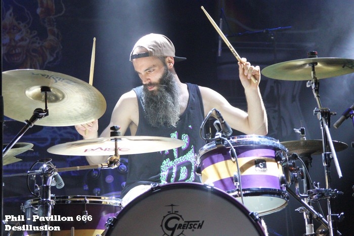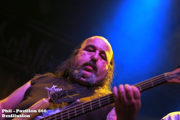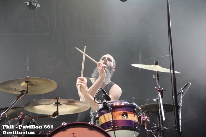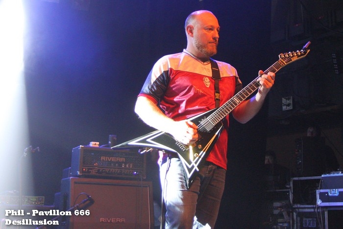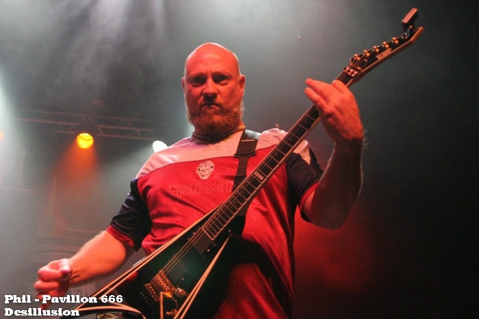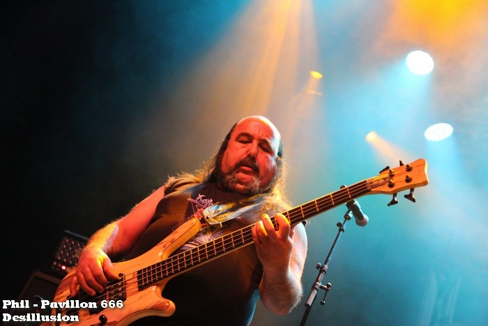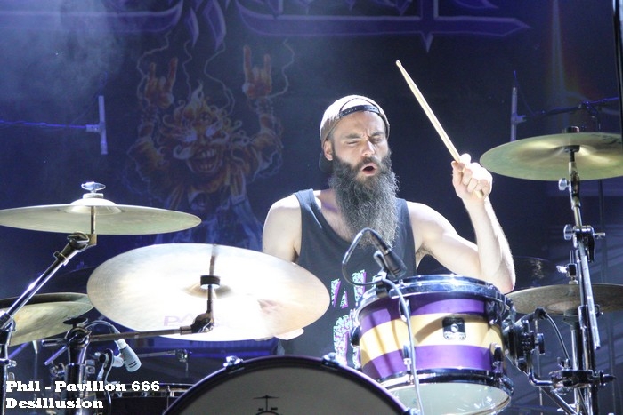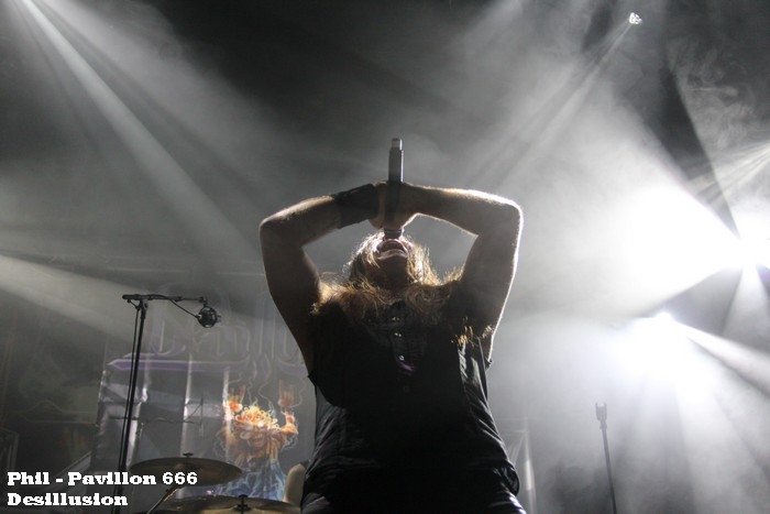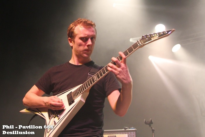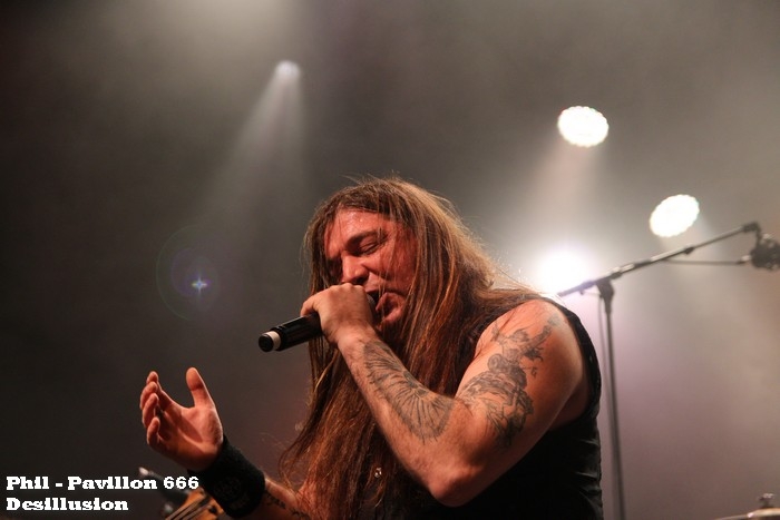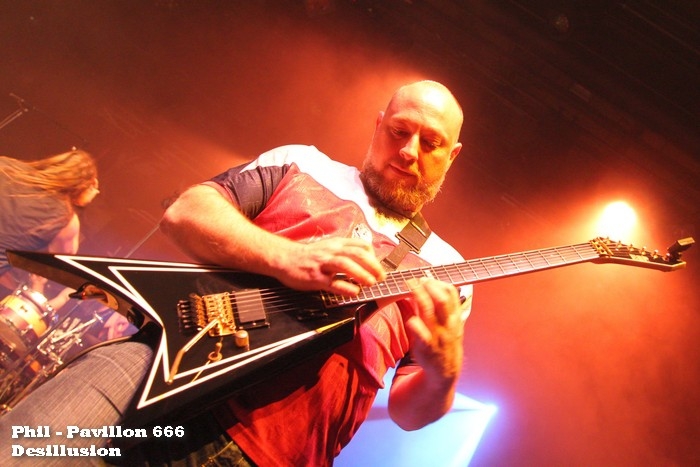 Lorsque Desillusion prend position sur les planches, l'assistance est déjà massée devant la scène. Celle-ci est prête à recevoir les riffs puissants et rythmiques énergiques du groupe. Evoluant en français, les membres ne peuvent et ne veulent renier leurs influences. Toutefois, les morceaux proposés ne font pas ressentir ces racines et ainés provenant des groupes cultes en la matière. L'ensemble est attirant, précis et maitrisé. La prestation scénique est animé essentiellement autour de son frontman (Jimmy) et de son bassiste (Yvon). Plus réservés, les deux guitaristes (Félix et Séb) sont plus statiques mais envoient tout autant. L'assise tenue par Maxime se veut dense et intense, le gardien des fûts sait malmené ses équipements avec précision.