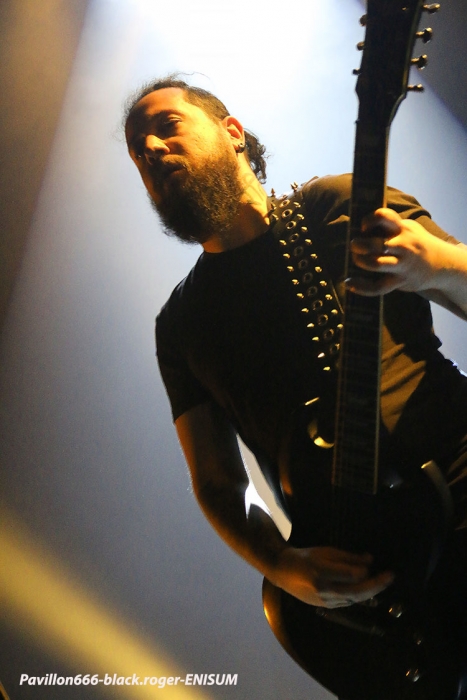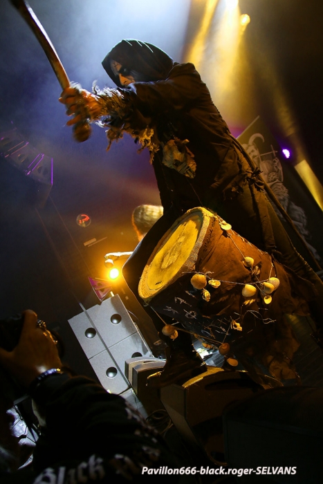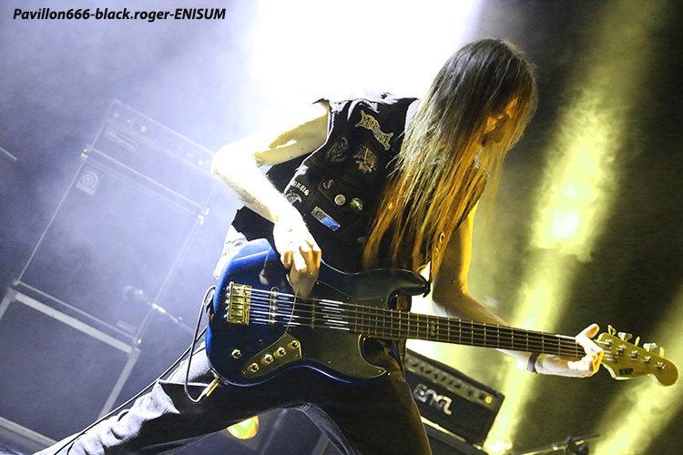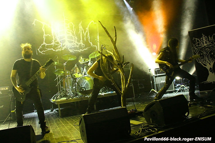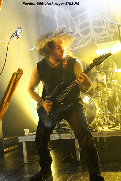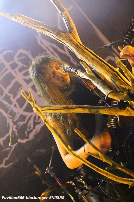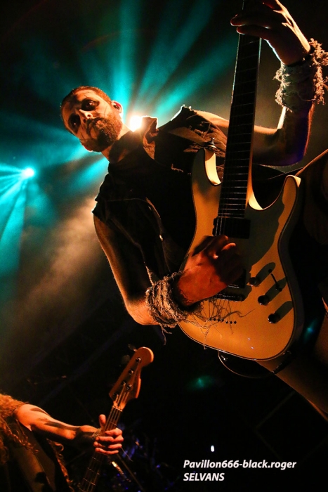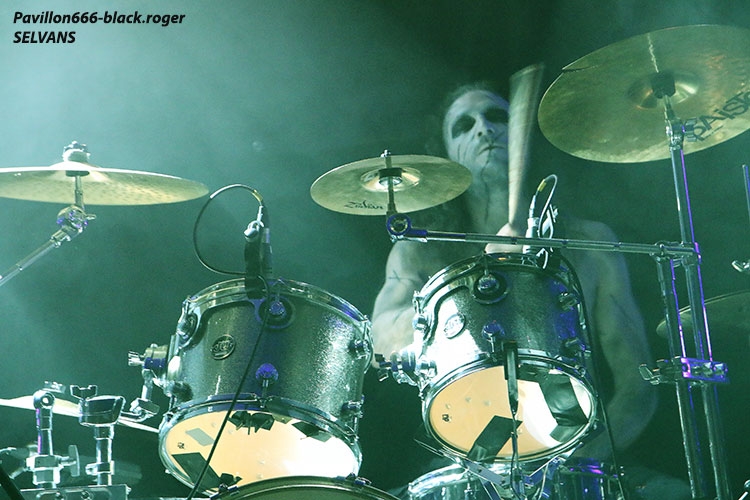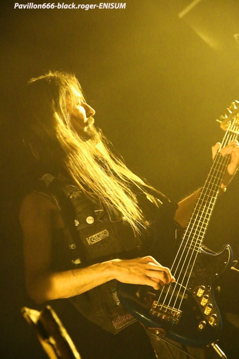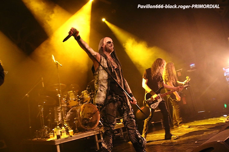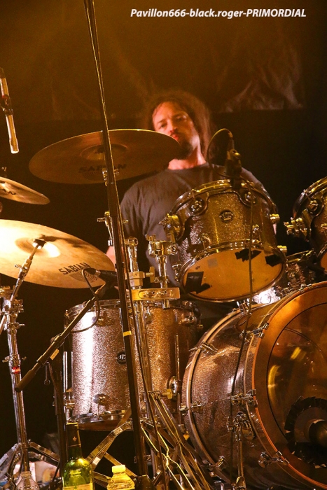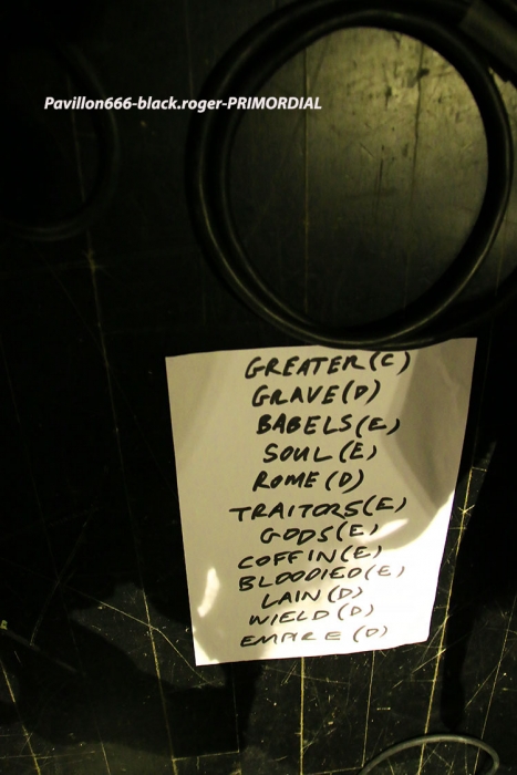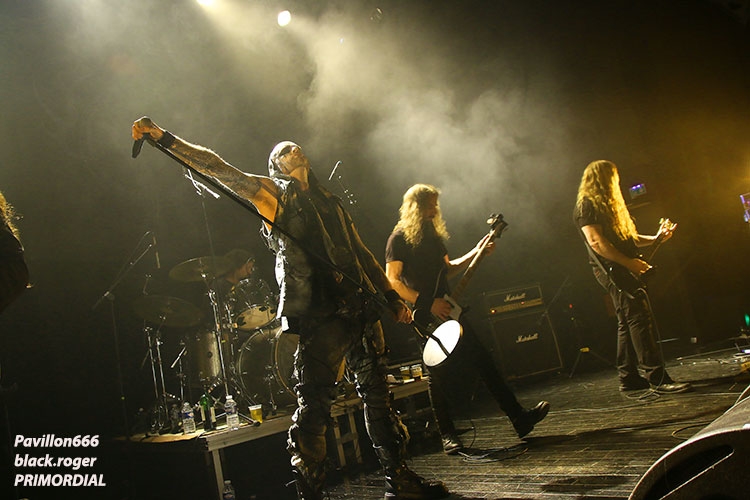 Cette ambiance créée justement par du black « ambiant » avec ceux du Val de Susa (Turin) ENISUM dans une veine dite « Arpatanian black-metal » dixit la formation. Ode à la nature donc, aux montagnes, aux torrents fougueux. Fougueux oui car les compositions ne nous enmmènent pas dans un ennui linéaire faite d’arpèges basiques, mais nous font découvrir des paysages brutaux dans des envois rapides semblant sans limite parfois. Les Piémontais tournent actuellement afin de nous présenter leur nouvel, et cinquième opus, intitulé « seasons of désolation » et il serait temps donc de découvrir et d’apprécier cette entité déviante du post-black avéré et aussi avant-gardiste quelque part. Belle découverte donc durant 1 heure de prestation mais peut-être un peu longue pour tous ceux qui n’apprécient pas forcément cette démarche dans sa globalité. Après les avoir vus en live il y a quelques mois, j’étais impatient d’assister à un nouveau show de nos amis Transalpins SELVANS. Leur pagan-black inspiré par un certain folklore italien dans une veine mystique faite de légendes ancestrales cachées au fond des forêts sombres notamment des Abruzzes où les loups règnent encore, est reconstitué live avec un certain côté théâtral propre à la culture italienne. Leur set de ce soir sera donc très mouvementé avec un frontman très démonstratif dans ses attitudes sur des tempos metal exacerbées dans une dimension black et occulte. Selvans a donc conquit le public du Jack-Jack ce soir à l’aide d’un set puissant et bien enlevé musicalement et visuellement parlant. Après un premier album éclatant intitulé « lupercalia » et un split cd avec Downfall Of Nur , avec aussi des prestations remarquées, Selvans est donc parti pour une certaine reconnaissance dans le milieu pagan-black et ce n’est que mérité. Dark, black, folk ? Non, simplement un metal particulier pour les Irlandais de PRIMORDIAL qui se sont forgé une identité propre depuis maintenant près de trente ans. Avec une discographie longue comme le bras, des prestations scéniques de hautes volées, que ce soit notamment au Hellfest, au Metaldays, Wacken et autres Brutal Assault et Bang your Head, ceux de Dublin méritent d’être vus en salle comme ce soir au jack-Jack de Bron avec des fans ultimes et des fidèles d’une certaine « celtitude » débordante au travers d’envolées mélancoliques, obscures, voire malsaines. Alan Averill mène sa troupe au combat, un combat qui nous interpelle sur des rythmes saccadés entrecoupés de mélopées saisissantes et sombres surgissant des ténèbres de la nuit, voire de la mort tout simplement. Alors, durant 1heure 30 Primordial a su nous interpeller grâce notamment aux titres « when greater men have fallen », « as rome burns », « gods to the godless », the coffin ships » et autre « empire falls ». Et ce fut bien, ce fut comme magique et morbide à la fois, le temps a passé si vite, le temps d’un rappel et c’est fini. Mais primordial n’a pas fini de nous inviter encore et encore à ses concerts toujours aussi puissants, toujours aussi fous, toujours aussi charismatiques tout simplement. Set-list en photo. Au final, soirée qui valait mille fois le déplacement et certains l’on bien compris. Nous ne remercierons jamais assez Rising Moon Prod, les trois groupes présents et le jack-Jack naturellement pour ce voyage d’un soir au pays du black fut-il pagan ou folk ! |