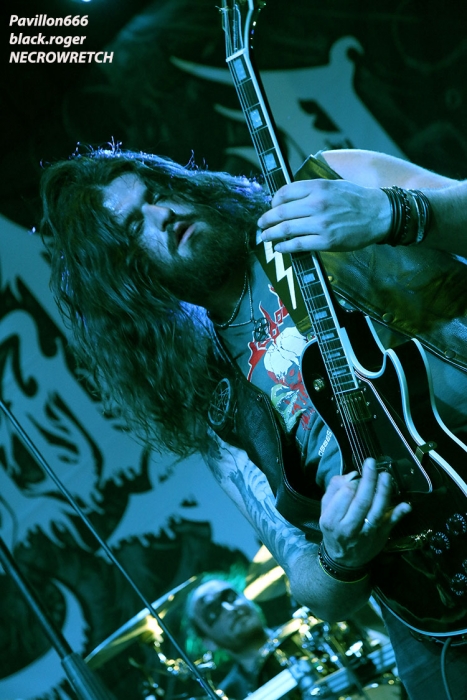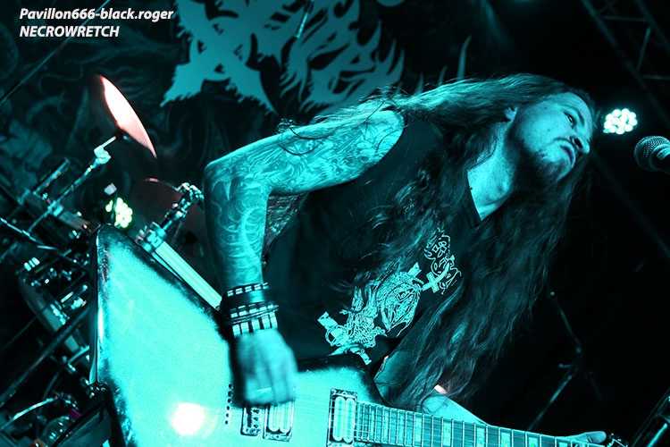 Retour au metal de la mort maintenant avec NECROWRETCH et son « putrid death-metal ». Voici un trio infernal qui tourne actuellement afin de nous présenter son dernier « méfait » « satanic slavery ». Alors place à l’agressivité, à la violence, à la brutalité, à la putridité donc. Tout droit sorti du cimetière de Valence dans la Drôme, Vlad et ses acolytes vont nous liquifier le cerveau avec des compositions directes et sans fioritures sur une vitesse incroyable malgré quelques breaks pour reprendre leur souffle. Set énorme pour tout amateur du genre, le public semble avoir bien adhéré à cette démarche dévastatrice.
