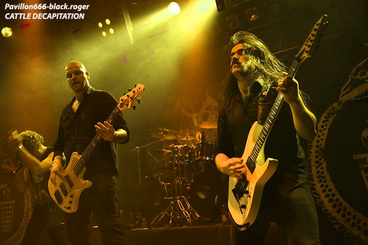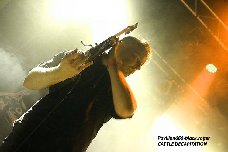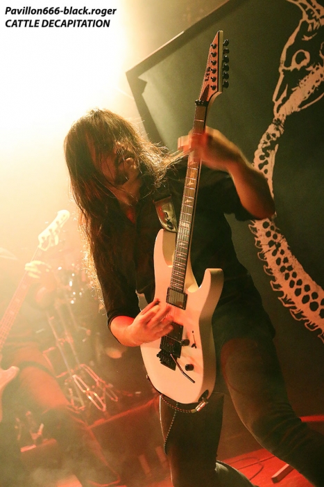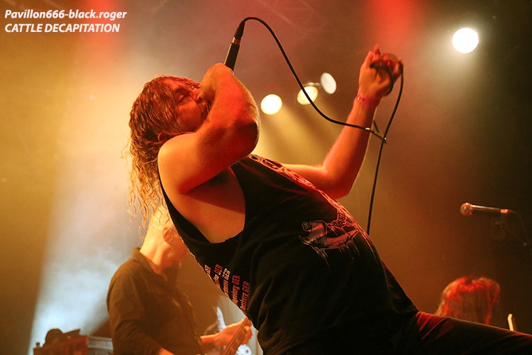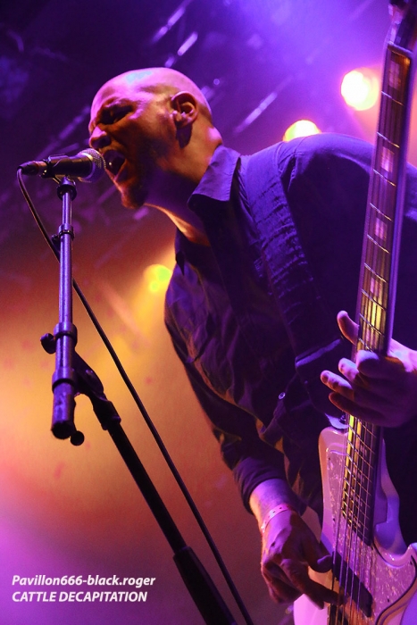 Les « ricains » de San-Diego en Californie, CATTLE DECAPITATION vont-ils pouvoir relever le défi après la tornade scénique de leurs compatriotes ? Oui, enfin pas tout à fait, car leur set se situe peut-être dans un autre registre plus progressif pourrait-on dire. Mais quand même après vingt années d’élucubrations sonores extrêmes, il était temps que ce groupe joue en tête d’affiche pour une tournée. C’est chose faite et ce soir nous apprécions leur démarche enragée et engagée, verte évidemment. Cattle Decapitation n’est pas content des agissements de notre belle société à mette à la poubelle et nous le fait savoir…brutalement en flirtant allègrement avec le grind et la power-violence. Et le calme avant l’orage chez eux c’est du death vicieux et malsain qui part dans tous les sens à l’aide d’accélérations inouïes. Chaud et froid donc, quand le réchauffement climatique s’attaque à la glace du pôle nord pourrait-on dire… Mais je m’égare, Cattle Decapitation arrive à décaper nos conduits auditifs de façon méchamment brutale mais en épiçant le tout de mélodies empoisonnées. Le public a bien adhéré ce soir et a même réclamé un rappel, exécuté bien sûr, merci les gars vous revenez quand vous voulez !