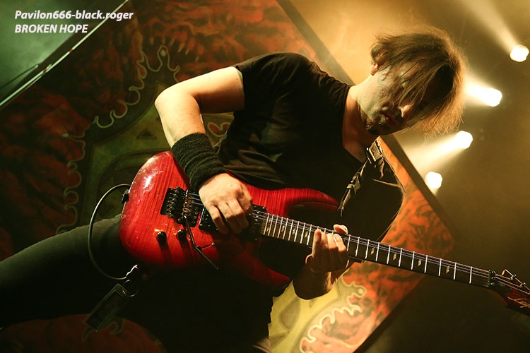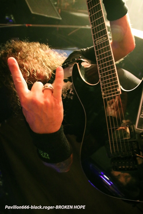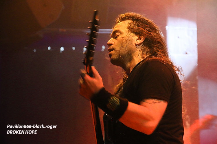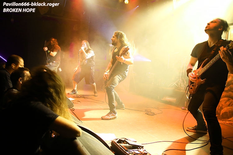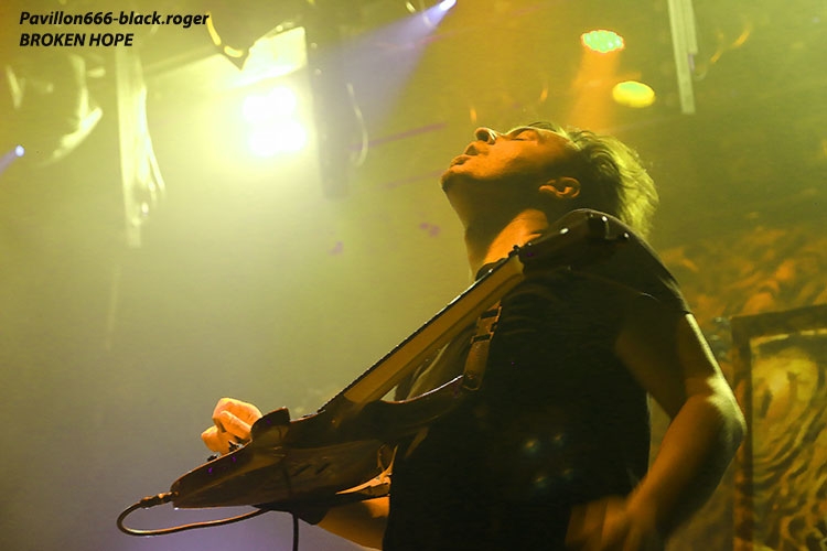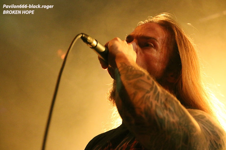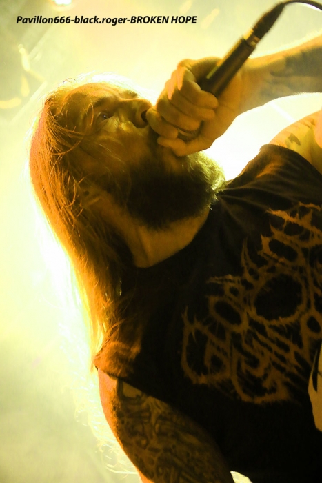 Et puis, et puis, nous allons encore monter d’un cran avec la venue sur scène là tout de suite, des death-metalleux de Chicago, vétérans de la scène extrême US, BROKEN HOPE. Et leur set va se révéler le plus mortel et accrocheur de cette soirée il n’y a pas photo. Combo présent sur la scène death depuis presque trente ans on ne présente plus ces bouchers du metal-de-la-mort-qui-tue, qui eux nous présentent un nouveau méfait en cette année 2017, son nom, « mutilated and assimilated » tout un programme je ne vous fait pas un dessin. Et en live notre matière grise en prend un coup, nos oreilles aussi. Quant à leur présence sur les planches elle est monstrueusement efficace. Tout est en place, tout est glauque, tout est d’une précision chirurgicale dans les envois, incroyable ! Comment ai-je pu louper ce groupe en concert depuis tout ce temps ? En tous cas ce soir nous nous sommes régalés avec leur brutal death millésimé et implacable.