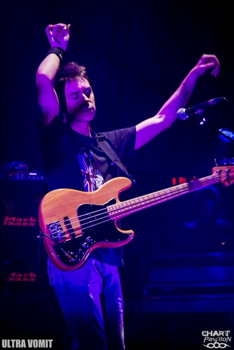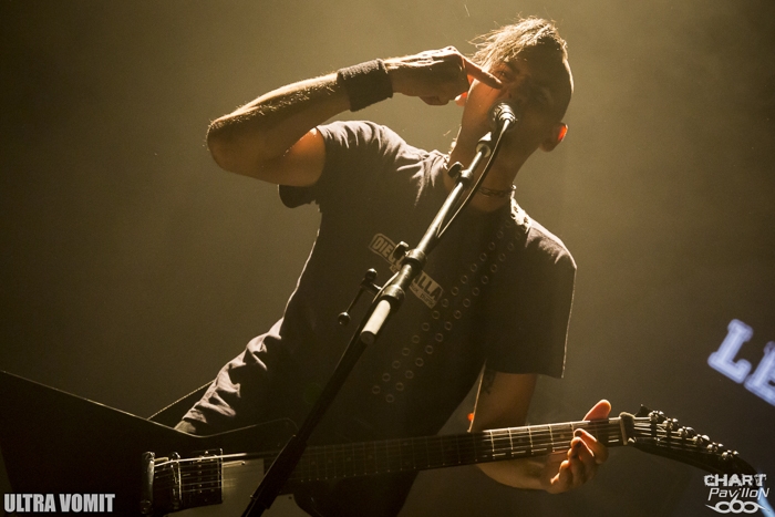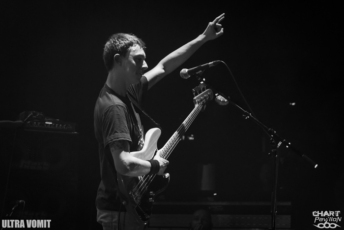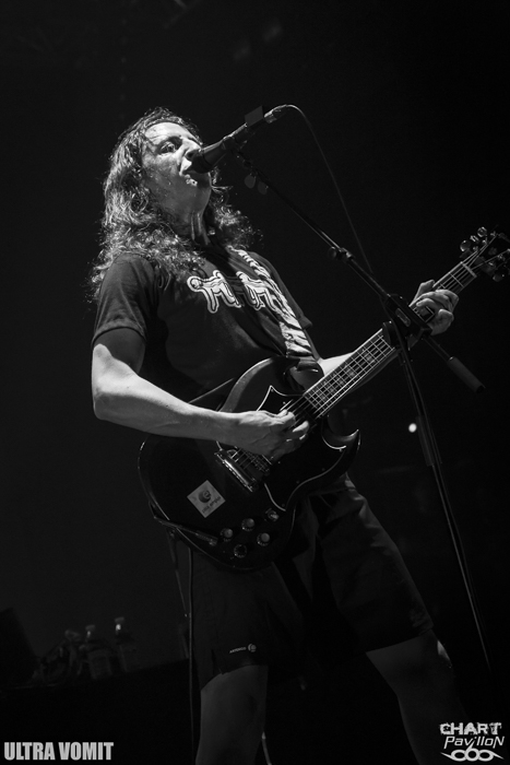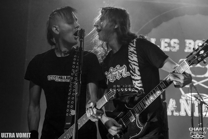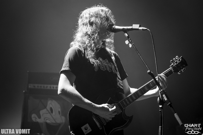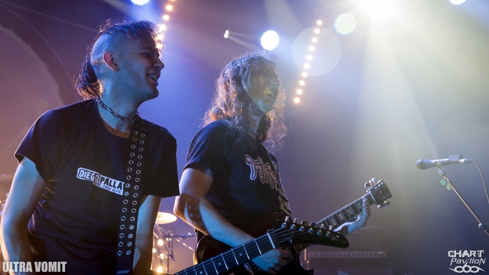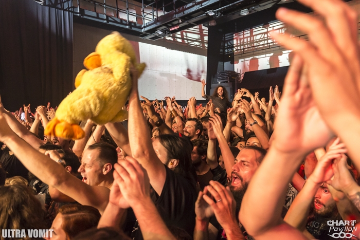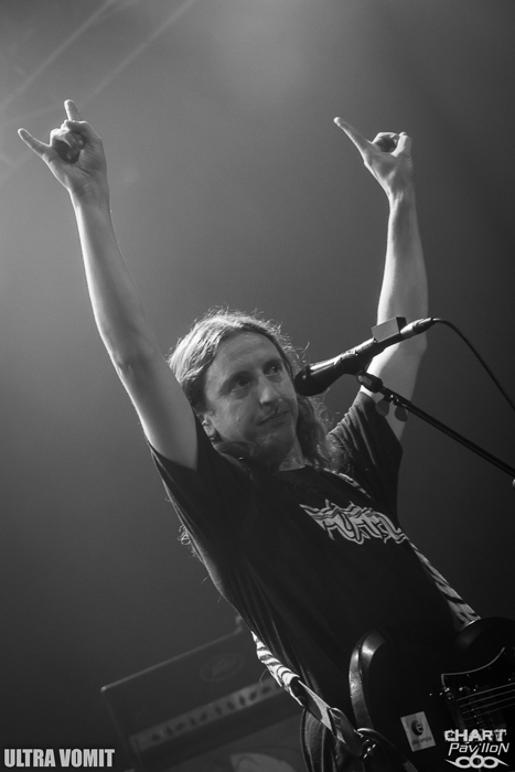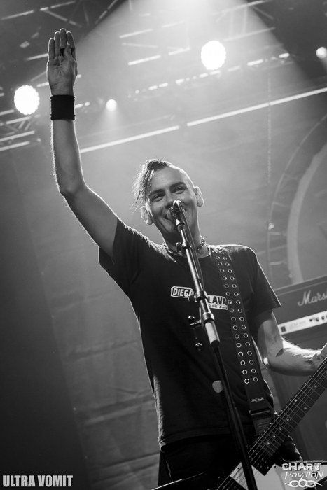 On peut parler de retour en ce qui concerne ULTRA VOMIT. Cela faisait depuis 2008 et « Ojectif : Thunes » que le groupe n'avait plus rien sorti de neuf. Depuis le départ du bassiste Pierre JACOU pour BLACK BOMB A, le groupe était resté plus ou moins en stand by. On l'avait néanmoins retrouvé sur scène avec l'arrivée de Mathieu BEAUSSON. Il faut dire aussi que l'univers de la parodie n'est pas si simple. Une fois que l'on a parodié les plus gros, pas facile de retrouver de l'inspiration. Il faut donc aller chercher du nouveau. ULTRA VOMIT a pris son temps et c'est avec de nouvelles parodies que le groupe débarque avec son nouvel opus « Panzer Surprise ! » en avril 2017. De la nouveauté il y en a avec des nouvelles parodies musicales de RAMMSTEIN, GOJIRA, IRON MAIDEN, AC/DC... De quoi ravir les fans qui s'ennuyaient depuis pas mal de temps déjà. Sur scène ULTRA VOMIT n'a rien perdu de son savoir faire. Avec un son énorme, fidèle à son album et aux groupes qu'il cible, c'est avec beaucoup d'humour que le groupe agence son spectacle. Les moyens techniques sont là avec un fond de scène vidéo qui vous annoncent les titres en animation des morceaux. Niveau set-list nous retrouvons donc ULTRA VOMIT tels que nous les avions laissés avec quelques petits rafraîchissements supplémentaires.