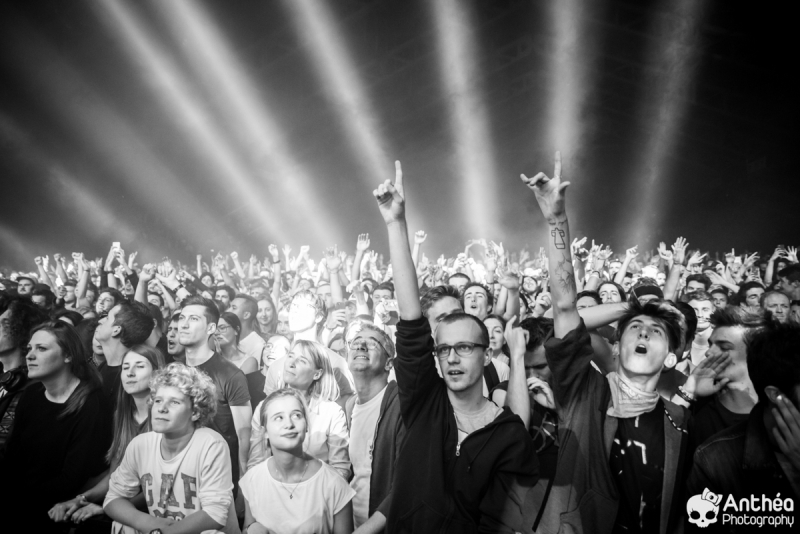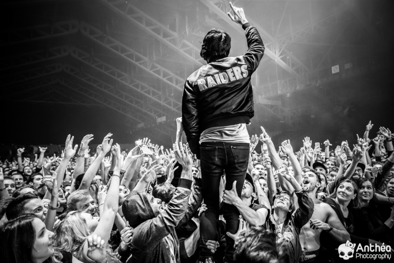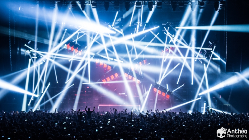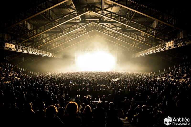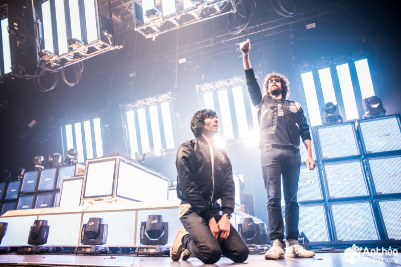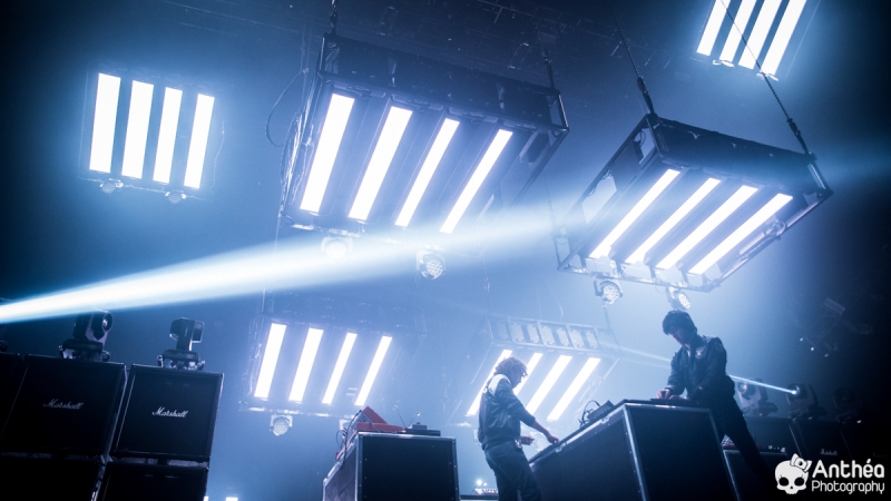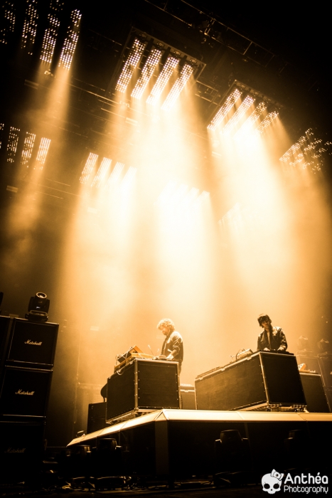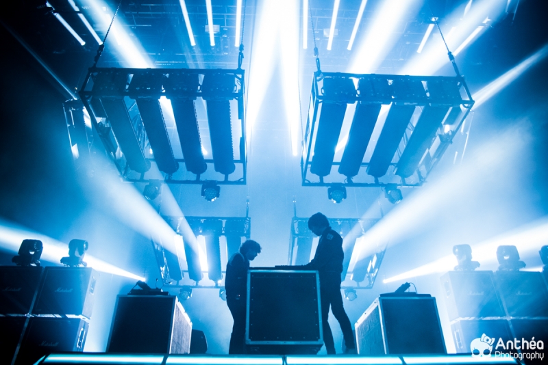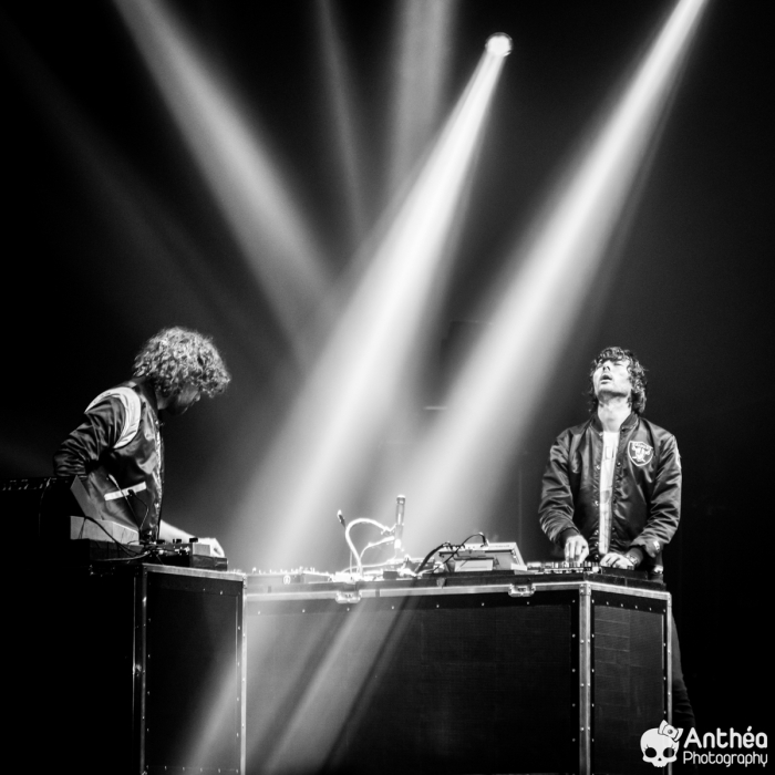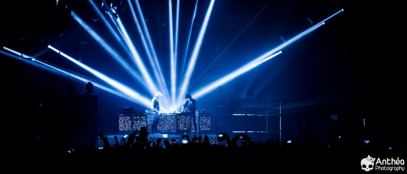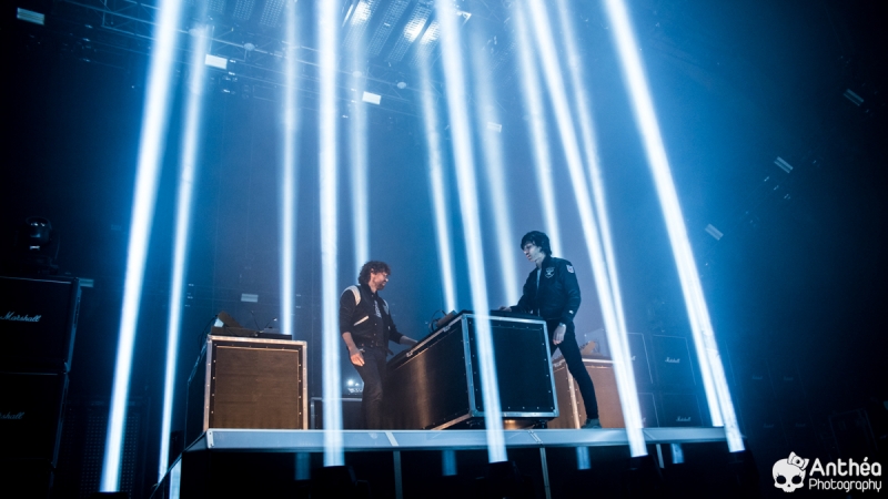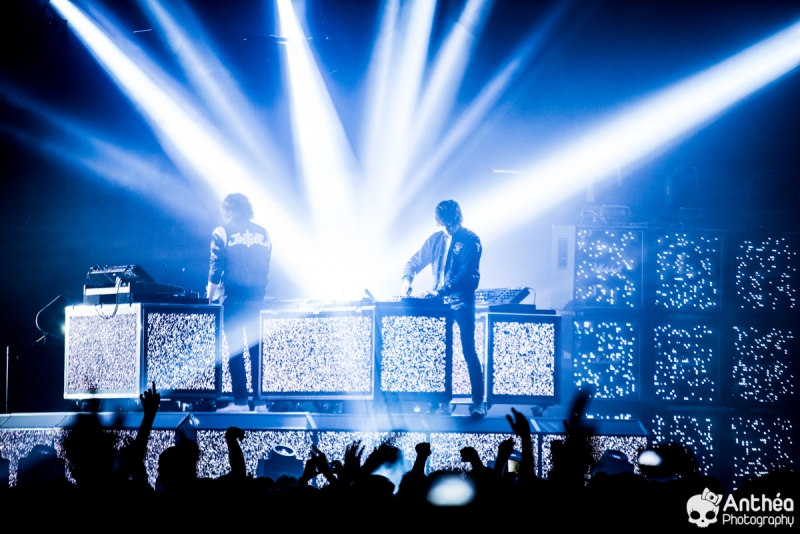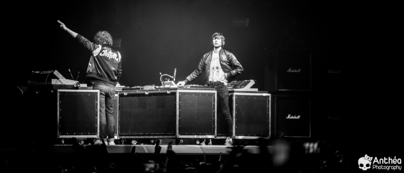 By Les Derniers Couchers – 7000 personnes Il y a { énormément } de monde dehors alors que les basses explosent déjà pour le break précédent Justice. C'est un public détendu et plutôt jeune qui arrive tranquillement afin de se déhancher paisiblement sur le pur son du duo parisien pour leur tournée " Woman World Tour " . Let's Go ! Arrivée dans la salle, ambiance déjà bien posée. Pas de break entre la première partie qui a terminé son set et Justice, ça mixe au milieu de la salle, il est encore tôt et nous avons comme l'impression de nous retrouver dans une boîte de nuit géante. Le public est déjà déchainé, genre des gosses qui attendent le père Noël. Justice arrive tranquillement sur scène. Une scène sobre mais efficace, Une croix lumineuse présente, mais pas en continu comme sur la tournée précedente. Ne pas de fier aux scènes sobres, parce que l'ingé light est clairement le 3 ° membre du groupe. La scène et le duo prend vie avec des jeux de lumières sublimes et très pointus. Début du show avec l'incontournable " Safe & Sound " qui fait claquer le son de basse dans la Halle. Dans le Pit le sol tremble carrément, je n'ai jamais vu ça ici. Incroyable. Xavier De Rosnay & Gaspard Augé ne laissent paraître que peu au départ, ils n'ont pas de basse ou de guitare entre les mains, mais leurs platines. Mais cela n'enlève rien au charme du show, qui, encore une fois est renforcé par un jeu de lumière bluffant. Enchaînement de purs titres, je prends le large afin de voir toute l'ampleur de loin. Le public est survolté, bras en l'air, à caresser les faisceaux lumineux. L'ensemble est juste parfait. Et se régènère sans cesse. Les basses tabassent la halle et lient ce show impeccable. Fin de show après plus d'une douzaines de titres enchaînés et mixés ? Même pas. Les 2 confrères se retrouvent perchés sur une passerelle de la Halle, au dessus de public et non loin de la scène. Sobre et classe à la fois. Ils finiront sur scène tranquillement, puis Xavier, plutôt en forme viendra finir le show par un bain de foule grandement apprécié des fans dans un état d'euphorie maximum après un set parfait. C'est un show qui se termine comme la cerise sur le gâteau, sans gout amer, avec le smile et le peps qu'on retrouve dans leurs titres. A voir absolument, pour tout amateur de musique en général, car, il ne faut pas de fier aux platines, elles cachent de jolis jeux subtiles et des morceaux de trucs qui en rappellent d'autres. Et, si vous n'êtes pas épileptiques, vous en prendrez aussi plein les mirettes avec un jeu parfait. Je le souligne. Alors Justice, on dit Oui ! Set List : 1. Safe And Sound 2. DANCE 3. Canon / LOVE SOS 4. Genesis / Phantom 5. Phantom / Pleasure / New Jack 6. Civilization / Heavy Metal / DVNO 7. Stress 8. LOVE SOS 9. Alazam ! / Fire / Love SOS 10. Waters of Nazareth 11. Phantom PT-2 / We Are Your Friends 12. Chorus 13. Audio, Video, Disco -------RAPPEL ------ 14. Stop 15. Randy 16. DANCE Pt-2 17. Safe & Sound |