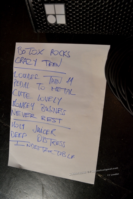 A 21h précises, ce sont les régionaux de ELEVEN LOUDER qui ont l'honneur d'ouvrir la séance. Ils viennent de Dijon, de Chalon-sur-Saône et de Bourg-en-Bresse et pratiquent depuis 2010 un « speedrock'n roll », tendance punk, qui convient parfaitement à l'esprit d'une telle soirée. Nos quatre gaillards ont plus d'une centaine de concerts à leur actif. Aurélien, dit « Punk », torse nu, arpente la scène micro en main, il interprétera dans un set de 30 minutes une dizaine de titres (voir set-list en photo ci-dessous), quelle puissance, quelle énergie chez ce Bourguignon ! Quant à Simon, le Bressan, il n'est pas seulement le brillant batteur du groupe, mais aussi l'animateur d' 11 LOUDER. Avec Martin à la guitare et Adrien à la basse, 11 LOUDER ne tardera pas à créer l'ambiance dans la fosse. Le public,heureux d'être là, n'est pas avare d'applaudissements, notamment lorsque le chanteur s'agenouille sur la scène, puis descend dans l'arène et enfin dédie une belle chanson à MOTÖRHEAD et à son leader Lemmy décédé il y a deux ans. On enchaîne par un petit circle-pit improvisé, suivi d'un bref pogo. Punk se renverse une canette sur la tête avant de conclure le set – court mais intense- par le joli morceau « Indestructible ». Une vraie émotion se dégage d'11 LOUDER, groupe qui mérite l'accueil qui lui a été réservé ici, ce soir.
