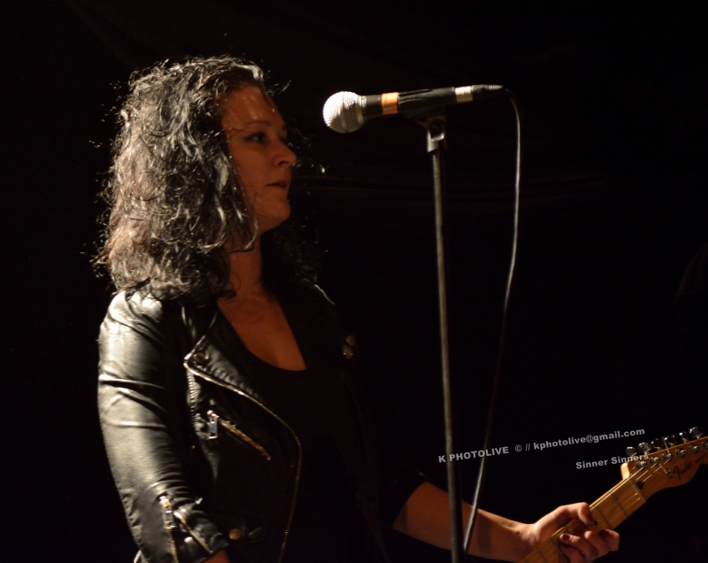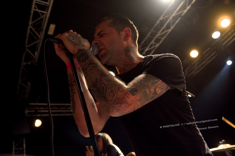 Changement de plateau, et à 22h les six membres de SINNER SINNERS investissent la scène. D'illustres inconnus, entend-on. Pas pour longtemps...Dans cette formation californienne, trois guitares et un clavier. En 2009, Steve Thill, un Français, et sa compagne Sam, une jeune Hollandaise, en couple à la scène comme à la ville, se sont expatriés à Los Angeles où naîtra SINNER SINNERS, groupe inscrit aujourd'hui chez Cadavra Records. Ce sextette joue ce qu'on pourrait nommer « punk garage », avec un zeste de metal, parfois appelé aussi « Horror punk », mais Steve, le chanteur et frontman, ancien de SUPPOZITORS, estime à tort ou à raison que les mots « punk » et « metal » « font peur aux gens ». Pour mieux connaître SINNER SINNERS, on pourrait également ajouter que Steve a eu l'occasion de rencontrer ou de fréquenter dans la grande ville de Californie, de près ou de loin, des membres d'AC-DC, des SEX-PISTOLS, Lemmy Kilmister et même le chanteur d'EAGLE OF DEATHMETAL ! On se souvient du sinistre 13 novembre 2015 au Bataclan.