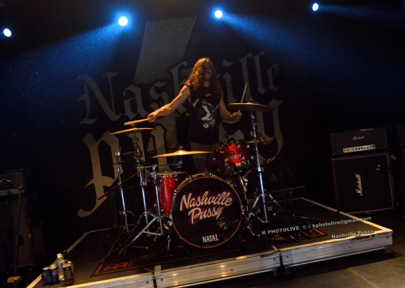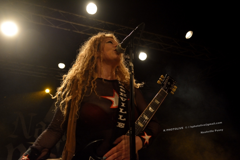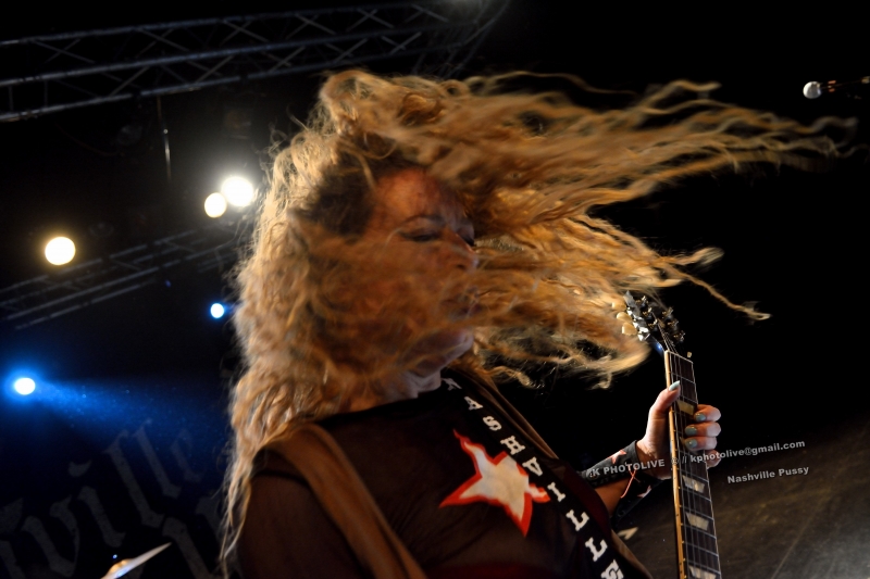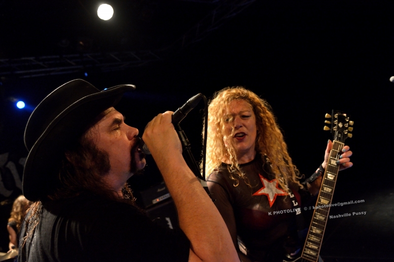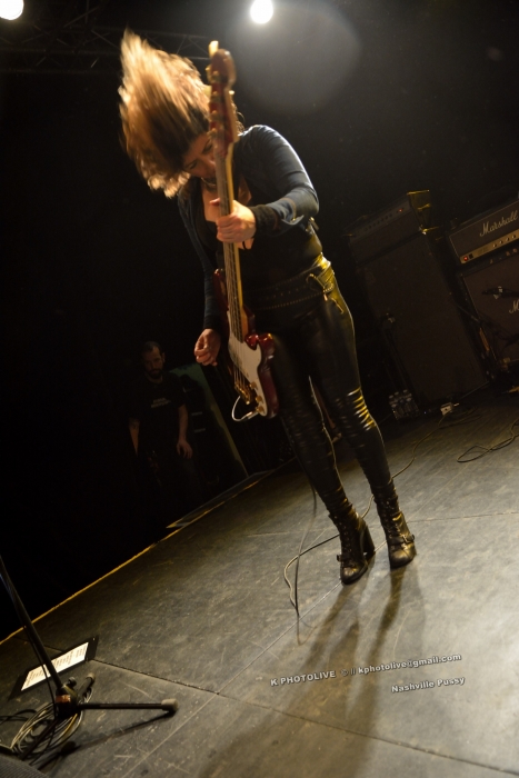 Deux hommes, deux femmes, peu après 23 heures, le quatuor de NASHVILLE PUSSY est accueilli sous les acclamations du public. « Are you ready ? », s'écrie Blaine Cartwright, le chanteur, frontman, fondateur du groupe US en 1996. Ils nous viennent d'Atlanta, capitale de la Géorgie et ont déjà eu l'occasion de se produire dans notre région, en particulier au Sylak. On aime ou on n'aime pas NASHVILLE PUSSY dont le seul nom suffit à déclencher les rires et dont les textes ou les comportements souvent provocateurs sont à prendre au deuxième, au troisième...degré. Il s'agit en réalité d'un groupe de hardrock sudiste (dénomination officielle), un peu touche à tout, qui s'identifie à son leader, Blaine, l'homme à la casquette et à l' éternel blouson étoilé, entouré de Ruyth Suys, sa blonde épouse, guitariste, parfois imprévisible, et de la brune Bonnie Buitrago, bassiste, plus sérieuse, mais capable de sourire au public. Le batteur, lui, a été longtemps Jérémy Thompson, depuis peu remplacé par Ben Thomas, excellent dans sa discipline.