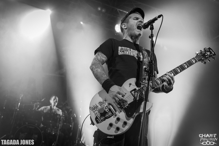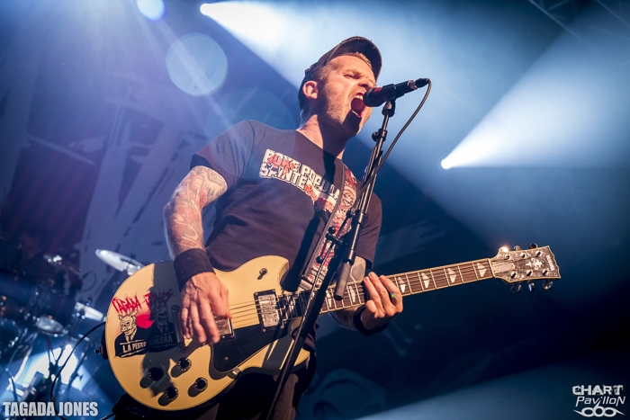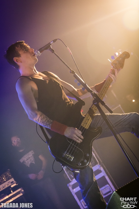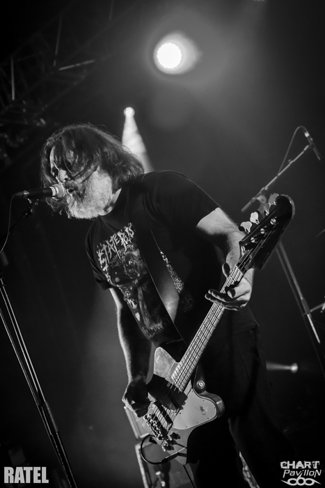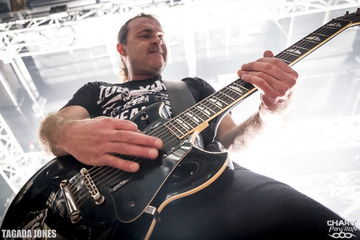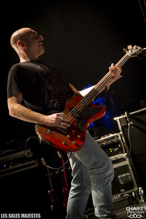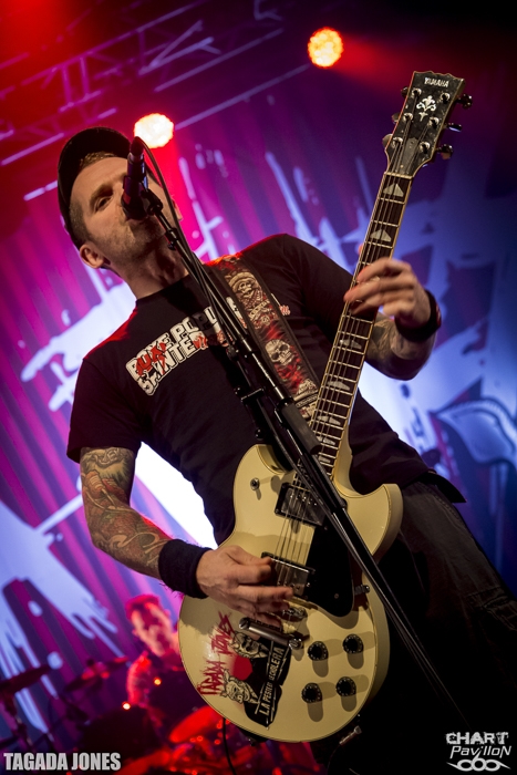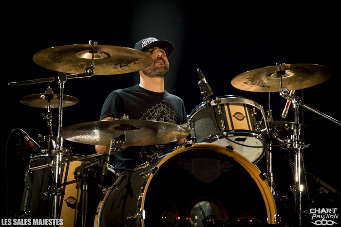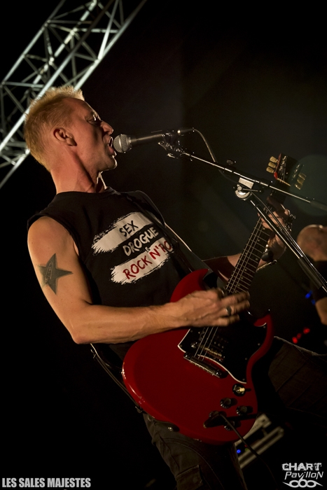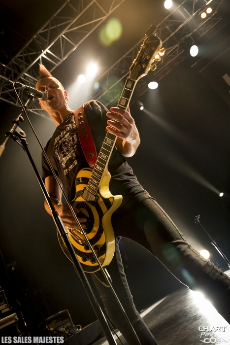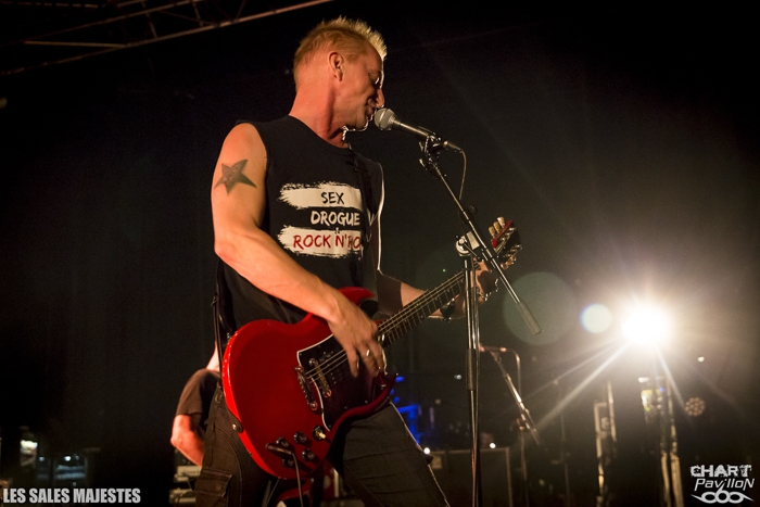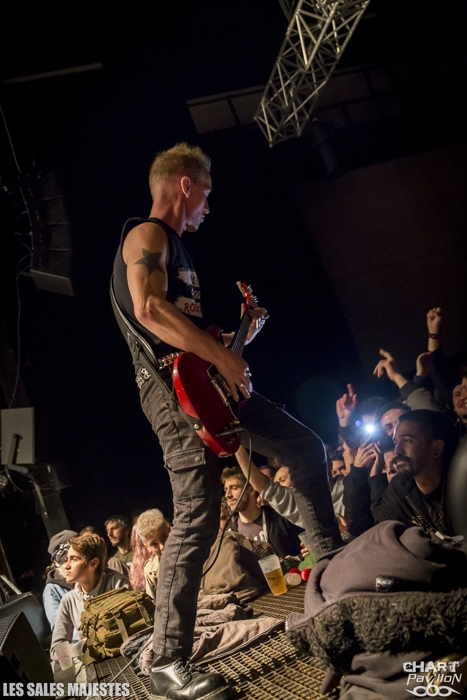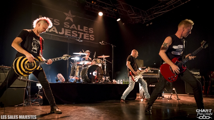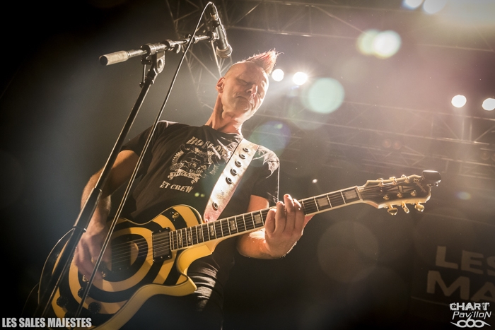 On ouvre les hostilités avec un groupe stéphanois comme le veut la tradition. Il s'agit pour moi d'une découverte car jamais auparavant je n'avais entendu parler de RATEL. Le fait est que la découverte est bonne. Le groupe officie dans un style qui ne surprend personne ce soir. On fait un bon dans le temps avec un retour aux années 80/90, l'époque où le punk rock envahissait les MJC comme le hip hop le fit un peu plus tard. RATEL assure le job avec dextérité. Les inspirations sont bonnes et le show s'en ressent fortement. L'adhésion du public est rapide et incontestable. Voici donc un nouveau groupe qui sorti du circuit underground de la ville a des choses à dire et à montrer. C'est plutôt réjouissant. Affaire à suivre donc et groupe à revoir. LES SALES MAJESTES s'empare de la scène au son de « Camarade ». Ce groupe originaire des Hauts-de-Seine est actif depuis 1988 même si son premier album remonte à 1995. Même s'il fait partie d'une génération plus récente de punks, LES SALES MAJESTES est très clairement influencé par les groupe de la première génération. On retrouve l'esprit de la fin des années 70 tant au niveau musical que dans ses paroles. On ne retrouve malheureusement dans le groupe que Yves CESSINAS comme membre fondateur, le line up ayant connu des remaniements importants entre 2014 et 2015. Arno Futur, le chanteur du groupe a quitté LES SALES MAJESTES en 2014 laissant le micro à son frère jumeau aussi guitariste du groupe, Yves CESSINAS. Mais tout cela n'enlève rien à la musique du groupe. Celle-ci est toujours aussi efficace et engagée qu'elle peut l'être. Et forcément en concert à Saint-Étienne, ville aux racines fortement ouvrières et donc marquée par le punk, la sauce prend très vite. Les crêtes qui sont de sortie rejoignent très vite la fosse pour s'en donner à cœur joie. La forte identité punk du groupe se répercute dans son public, forcément. Et tout se joyeux monde passe une bonne heure de concert de la meilleure façon qui soit. A peine les dates de LE BAL DES ENRAGES bouclées, TAGADA JONES retournait en studio pour donner suite à son album « Dissident » paru en 2014. Cette année 2017 sortait donc « La Peste et le Choléra ». La tournée ne pouvait qu'arriver très vite. Cette sensation que le groupe ne lâchera rien quoiqu'il arrive se confirme à nouveau avec cette tournée. Cette impression que le groupe est suractif ces dernières années est elle aussi très forte. Mais cela importe peu au final et ce pour plusieurs raisons. La qualité musicale se voit fortement poussée vers le haut. TAGADA JONES progresse musicalement. Joby Joba derrière ses fûts gagne en force et en précision d'une manière certaine. Cela donne sur scène des bases solides et puissantes au niveau rythmique. On compte aussi sur Waner à la basse pour son jeu et sa prestance sur scène. Alors forcément avec des bases aussi solides Niko et Stef à la guitare n'ont plus qu'à se laisser porter. Et sur scène cela devient franchement impressionnant. Dès l'introduction et le premier morceau « Envers et Contre Tous » on sait que nous avons à faire à du lourd, du très gros. Le son est impeccable avec une puissance rare. Si je soulignais le fait en introduction que TAGADA JONES sortait du simple punk/rock c'est que depuis toujours le groupe a su s'inspirer de choses diverses et les intégrer à sa musique. Ainsi, on flirte parfois avec une petite dose de metal, une très légère touche d'indus à la MINISTRY et quelques petites autres choses de ci de là. C'est léger mais cela permet au groupe d'élargir son champ musical et le pousser vers un public plus large. Et ce concert me fait l'effet d'un rouleau compresseur. Cela faisait déjà un moment que je n'avais pas ressenti cela en concert. C'est compact et incisif. Les nouveaux morceaux se mêlent parfaitement aux anciens « Zéro de Conduite », « Yec'hed Mad », « Le Feu aux Poudres »... mais très bizarrement on commence à ressentir comme un très léger fossé face à la puissance et à la maîtrise dans les nouvelles compositions. Peut-être que l'actualité a suffisamment énervé le groupe, et il y a de quoi, pour lui donner la force de sortir de ses gonds et exploser le plafond. En tout cas, TAGADA JONES est monté haut et cette heure et quart de concert qui se conclue par un vibrant medley en hommage aux regrettés Schultz et Sven de PARABELLUM aura largement tenu ses promesses. TAGADA JONES est au top de sa forme et il est urgent d'aller les voir. Merci au Fil pour son organisation et son accueil. Merci aussi aux groupes qui prennent le temps avant et après le concert d'aller rencontrer leur public. Ce lien particulier qu'entretiennent ces musiciens ne fait que renforcer la bonne ambiance qui règne dans ce type de concert. |