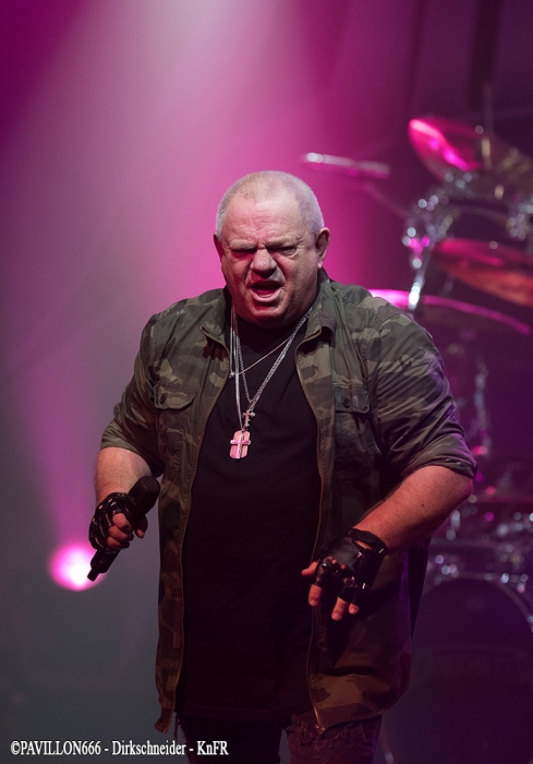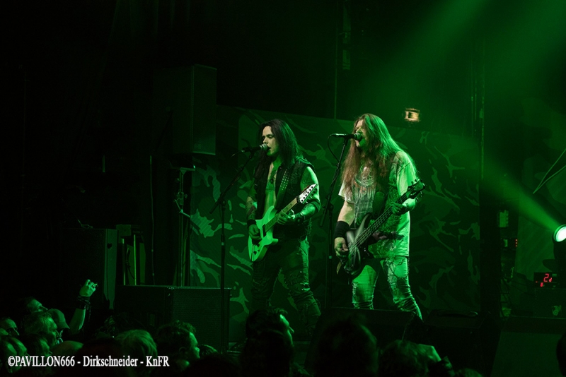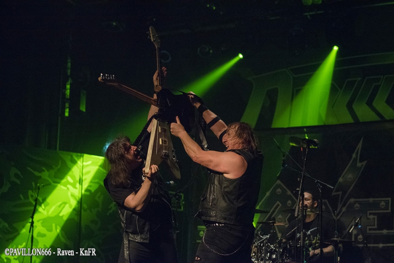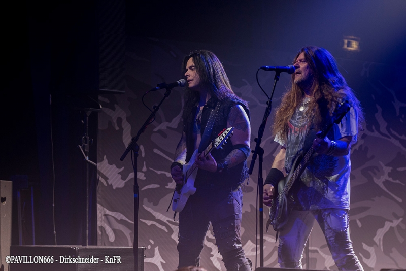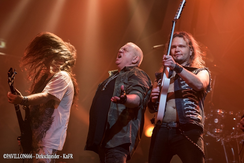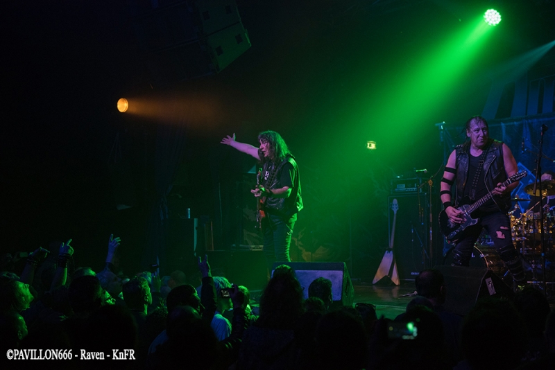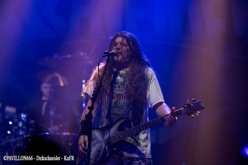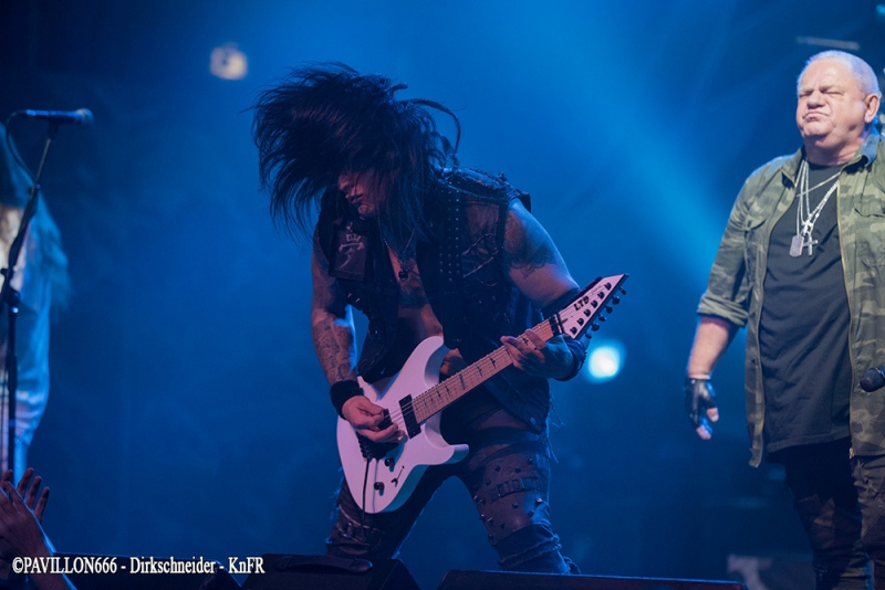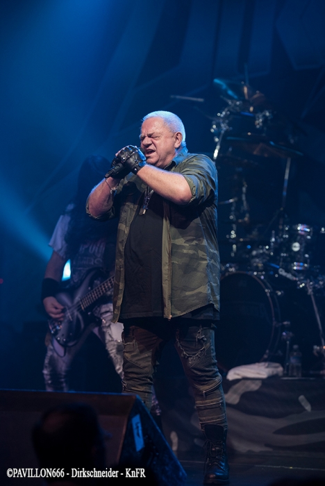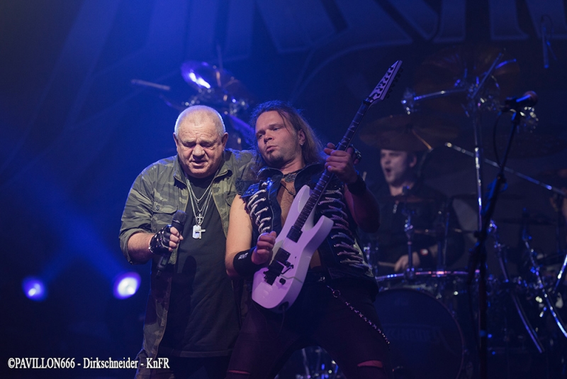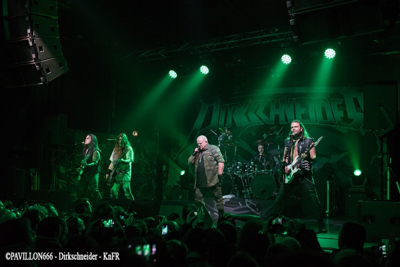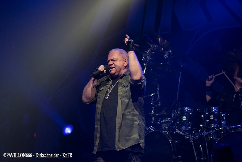 La salle n’affichait pas complet… loin de là, 400/450 personnes, alors que sa capacité est de 800, un concert un mercredi, avec le froid, et la pluie, ça n’arrange pas les affaires. 19h15, c’est l’heure pour RAVEN de monter sur scène, un vieux groupe britannique formé en 1974 (considéré, par certains comme les pionners du NWOBHM) par les frères John et Mark Gallagher, respectivement chanteur/bassiste et guitariste, et officiellement ‘Joe Hasselvander’ à la batterie, mais hier soir, mystère, c’était je pense un batteur de remplacement, jeune, une trentaine d’année assez fin, avec des lunettes, absolument pas le profil de Hasselvander. Petit set d’une 40taines de minutes, mené tambour battant : All for One, Hung, Drawn & Quartered, Rock Until You Drop, On and On, medley : Break the Chain / It's a Long Way to the Top (If You Wanna Rock 'n' Roll) / Symptom of the Universe, Crash Bang Wallop. En toute franchise, j’avais l’impression d’assister à un mix entre Anvil & Spinal Tap, tant ils ne se prennent pas au sérieux sur scène, ils continuent les pitreries comme s’ils avaient encore 20ans (de jouer aux épées avec leur guitare et basse), mais derrière cette simplicité et cette bonne humeur, ce groupe déborde d’énergie (on se demande à quoi ils carburent, pour avoir autant la pêche), des rythmiques très rapide, je rangerai ce groupe dans la catégorie « Speed ou Thrash », et après il faut apprécier -par contre- la voix très aigu de John, certaines personnes du public se sont d’ailleurs repliés au Bar durant une partie de leur prestation, car vocalement c’est assez particulier, même avec les boules Quies, ça vrille un peu les tympans. Le batteur, était par contre assez effacé… ce qui permettait à Mark de ne pas se faire voler la vedette, et d’attirer toutes les attentions sur son jeu de scène, ses solos endiablés, ou ses clowneries. Le point d’orgue de leur prestation, à bien sur été la courte reprise d’AC/DC, « It’s a long way to the top » beaucoup plus pêchu, et d’un coup toute La Loco c’est réveillé, jusqu'à la fin de leur prestation. Petit break de 30 minutes, le temps de virer le plateau de Raven, et de finir l’installation de la scène de Dirkschneider, une scène assez minimaliste vus la taille de la salle, et malheureusement pas de pyrotechnique non plus , un large backdrop Dirkschneider en fond, et des toiles camouflages sur les cotés de la scène, et pour la jupe du praticable de Sven. Sa batterie ne sera dévoilé qu’une fois les lumières éteintes. Une impressionnante batterie pour le fils d’Udo, un peu dans le style du kit surdimensionné de Nicko McBrain. 20h30, la salle est plongée dans le noir… les allemands vont arriver. Les lumières passent aux vert (dans tous les sens du terme), Andrey Smirnov (guitare), Bill Hudson (guitare), Fitty Wienhold (basse), Sven Dirkschneider (batterie) attaquent direct sur «The Beast Inside» (album Death Row)… avant que Mr Udo Dirkschneider ne fasse son entrée par l’arrière gauche de la scène, évidemment habillé de la tête aux pieds en treillis de l’armée. Et c’est parti pour 120 minutes de titres d’ACCEPT (sur lesquels Udo chantait bien entendu). Des les premières notes, ca commence à pogoter sévère dans le pit, bien content d’être à l’abri avec le matos, dans les coursives, et aussi de surplomber la fosse, pendant les rappels, 1 personne réussira même l’exploit de slamer et de faire le tour complet de la fosse. Ce soir leur set-list est principalement axée sur les albums « Objection Overruled » (5 titres), Balls to the Wall (4 titres), et Russian Roulette (3 titres). Le patron sur scène, c’est bien Udo bien campé sur ses 2 jambes, toujours au centre de la scène, c’est lui qui siffle son équipe quand il a besoin d ‘être entouré au milieu de la scène, pour faire un bel alignement de musicos… comme sait aussi très bien le faire Helloween, et ils se courbent tous avec une grand synchronisation, ça fait toujours son effet visuel. Cette formation est extrêmement efficace, comme un char Panzer, ils déroulent leur longue set-list, n’hésitant pas à remonter presque aux sources avec son album « Breaker » pour le plus grand bonheur du public, rien ne peux plus les arrêter, quand ils sont lancés. Sven avec sa double grosse caisse sait se faire entendre, et donner le tempo, pendant qu’Andrey & Bill font fuser les notes de leur 6-cordes, ou se lancent dans des battles de taping. Fitty à la basse lui se fera plus discret, plus effacé, préférant rester sur son coté gauche, ayant presque le même âge qu’Udo, il se mouvra moins que les 2 jeunes guitaristes. Au bout d’une heure, nous aurons droit à 6 minutes de répit avec « Amamos La Vida » (avec un ballet de lights assez bien réussi), et sitôt le ‘slow’ terminé, la machine Dirkschneider redémarre gentiment avec ‘Stove Evil’, avant de ré-envoyer la grosse artillerie sur ‘Breaker’ un vieux titre de 1981. J’adore les solos de guitares, Andrey et Bill excellent en la matière, mais peux être qu’il y en avait trop souvent . Par contre j’aurai aimé avoir un solo de batterie de Sven le fiston d’Udo. Au bout 90 minutes… c’est déjà l’heure des rappels, mais ils joueront 4 titres… pendant presque 30 minutes. Avec tout d’abord un « Princess of the dawn » de 10 minutes, ou Udo se fera une joie de faire participer et chanter le public, un Metal Heart de presque 7 minutes ou nous aurons droit à un énième solo de guitare de Andrey, et ou le public s’époumonera une nouvelle fois, a coup de « Hoh hoooh hoho-hohooooo », et bien sur un grand final repris en chœur avec son public sur le titre « Balls to the Wall ». Danke Schon Paris, Auf Wiedersehen. Set List : The Beast Inside (Death Row) Aiming High (Russian Roulette) Bulletproof (Objection Overruled) Midnight Mover (Metal Heart) Slaves to Metal (Obj