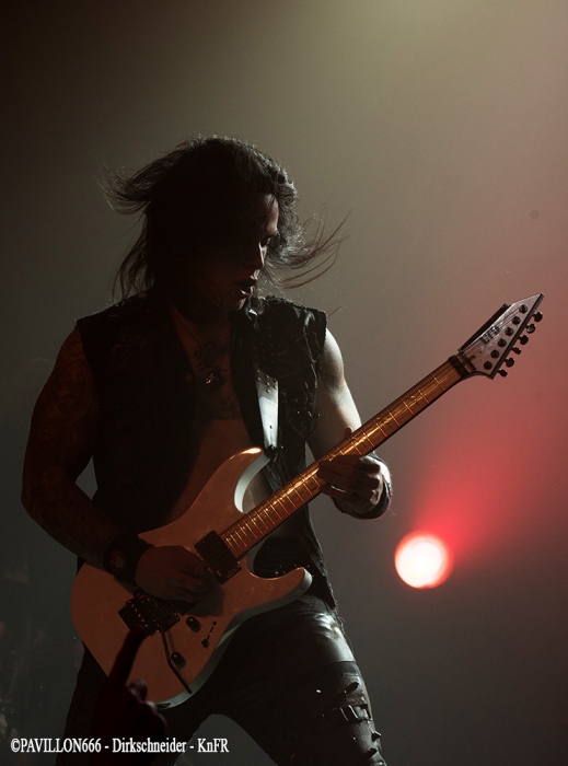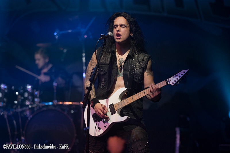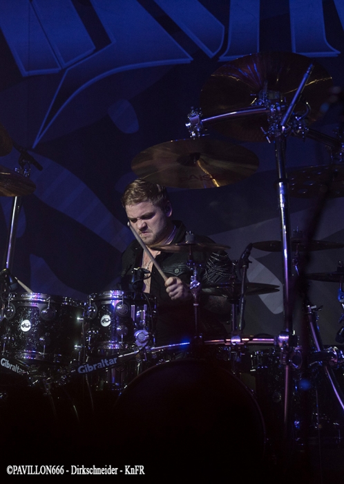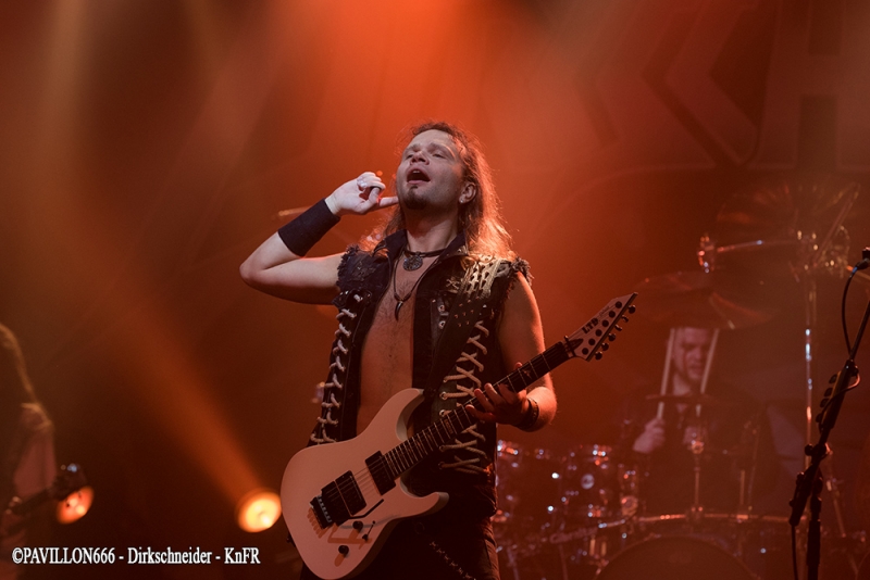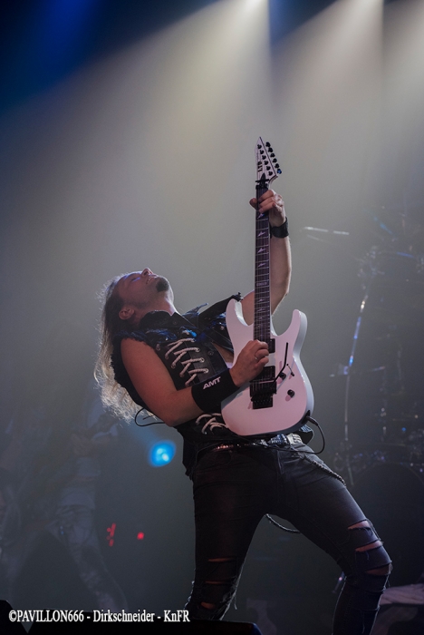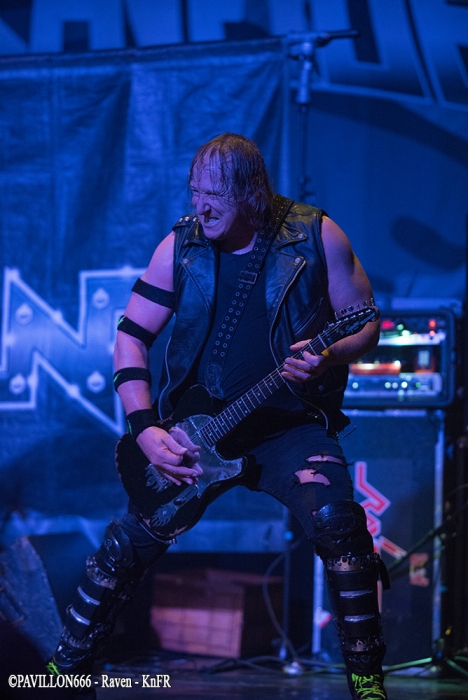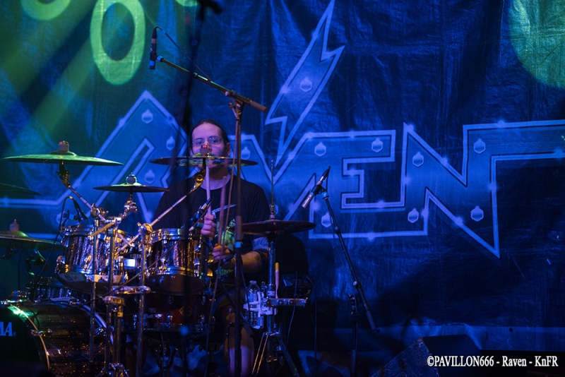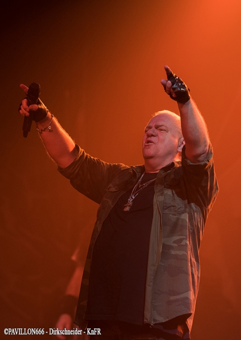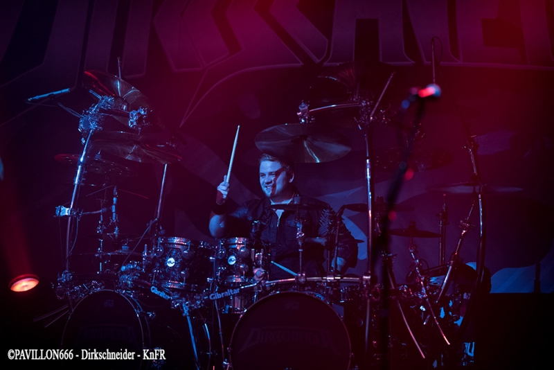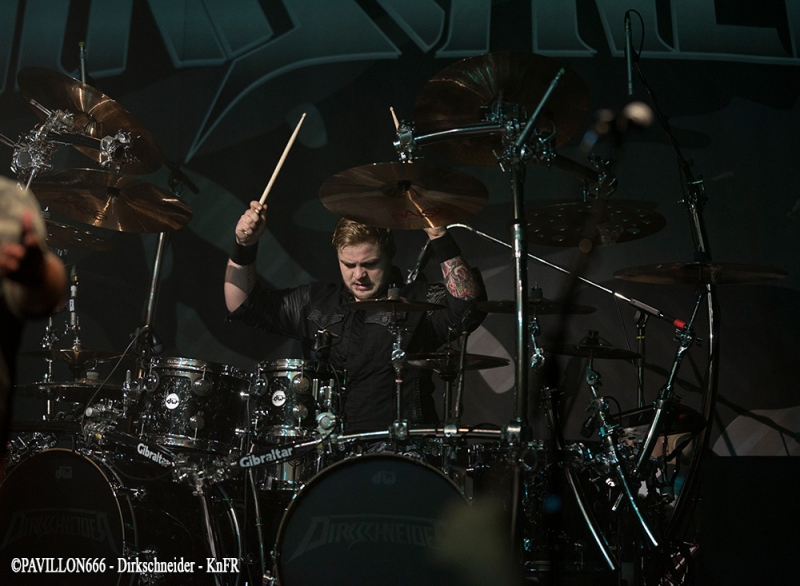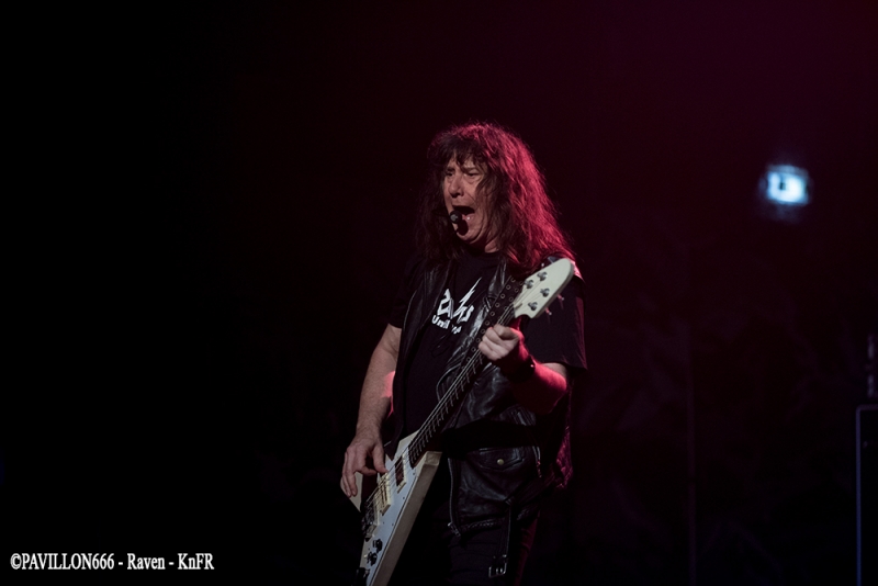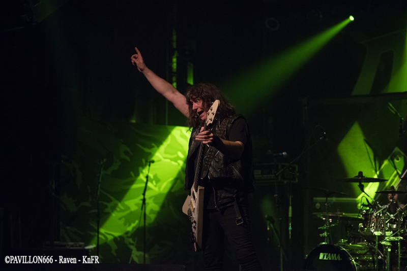 La salle n’affichait pas complet… loin de là, 400/450 personnes, alors que sa capacité est de 800, un concert un mercredi, avec le froid, et la pluie, ça n’arrange pas les affaires. 19h15, c’est l’heure pour RAVEN de monter sur scène, un vieux groupe britannique formé en 1974 (considéré, par certains comme les pionners du NWOBHM) par les frères John et Mark Gallagher, respectivement chanteur/bassiste et guitariste, et officiellement ‘Joe Hasselvander’ à la batterie, mais hier soir, mystère, c’était je pense un batteur de remplacement, jeune, une trentaine d’année assez fin, avec des lunettes, absolument pas le profil de Hasselvander. Petit set d’une 40taines de minutes, mené tambour battant : All for One, Hung, Drawn & Quartered, Rock Until You Drop, On and On, medley : Break the Chain / It's a Long Way to the Top (If You Wanna Rock 'n' Roll) / Symptom of the Universe, Crash Bang Wallop. En toute franchise, j’avais l’impression d’assister à un mix entre Anvil & Spinal Tap, tant ils ne se prennent pas au sérieux sur scène, ils continuent les pitreries comme s’ils avaient encore 20ans (de jouer aux épées avec leur guitare et basse), mais derrière cette simplicité et cette bonne humeur, ce groupe déborde d’énergie (on se demande à quoi ils carburent, pour avoir autant la pêche), des rythmiques très rapide, je rangerai ce groupe dans la catégorie « Speed ou Thrash », et après il faut apprécier -par contre- la voix très aigu de John, certaines personnes du public se sont d’ailleurs repliés au Bar durant une partie de leur prestation, car vocalement c’est assez particulier, même avec les boules Quies, ça vrille un peu les tympans. Le batteur, était par contre assez effacé… ce qui permettait à Mark de ne pas se faire voler la vedette, et d’attirer toutes les attentions sur son jeu de scène, ses solos endiablés, ou ses clowneries. Le point d’orgue de leur prestation, à bien sur été la courte reprise d’AC/DC, « It’s a long way to the top » beaucoup plus pêchu, et d’un coup toute La Loco c’est réveillé, jusqu'à la fin de leur prestation. Petit break de 30 minutes, le temps de virer le plateau de Raven, et de finir l’installation de la scène de Dirkschneider, une scène assez minimaliste vus la taille de la salle, et malheureusement pas de pyrotechnique non plus , un large backdrop Dirkschneider en fond, et des toiles camouflages sur les cotés de la scène, et pour la jupe du praticable de Sven. Sa batterie ne sera dévoilé qu’une fois les lumières éteintes. Une impressionnante batterie pour le fils d’Udo, un peu dans le style du kit surdimensionné de Nicko McBrain. 20h30, la salle est plongée dans le noir… les allemands vont arriver. Les lumières passent aux vert (dans tous les sens du terme), Andrey Smirnov (guitare), Bill Hudson (guitare), Fitty Wienhold (basse), Sven Dirkschneider (batterie) attaquent direct sur «The Beast Inside» (album Death Row)… avant que Mr Udo Dirkschneider ne fasse son entrée par l’arrière gauche de la scène, évidemment habillé de la tête aux pieds en treillis de l’armée. Et c’est parti pour 120 minutes de titres d’ACCEPT (sur lesquels Udo chantait bien entendu). Des les premières notes, ca commence à pogoter sévère dans le pit, bien content d’être à l’abri avec le matos, dans les coursives, et aussi de surplomber la fosse, pendant les rappels, 1 personne réussira même l’exploit de slamer et de faire le tour complet de la fosse. Ce soir leur set-list est principalement axée sur les albums « Objection Overruled » (5 titres), Balls to the Wall (4 titres), et Russian Roulette (3 titres). Le patron sur scène, c’est bien Udo bien campé sur ses 2 jambes, toujours au centre de la scène, c’est lui qui siffle son équipe quand il a besoin d ‘être entouré au milieu de la scène, pour faire un bel alignement de musicos… comme sait aussi très bien le faire Helloween, et ils se courbent tous avec une grand synchronisation, ça fait toujours son effet visuel. Cette formation est extrêmement efficace, comme un char Panzer, ils déroulent leur longue set-list, n’hésitant pas à remonter presque aux sources avec son album « Breaker » pour le plus grand bonheur du public, rien ne peux plus les arrêter, quand ils sont lancés. Sven avec sa double grosse caisse sait se faire entendre, et donner le tempo, pendant qu’Andrey & Bill font fuser les notes de leur 6-cordes, ou se lancent dans des battles de taping. Fitty à la basse lui se fera plus discret, plus effacé, préférant rester sur son coté gauche, ayant presque le même âge qu’Udo, il se mouvra moins que les 2 jeunes guitaristes. Au bout d’une heure, nous aurons droit à 6 minutes de répit avec « Amamos La Vida » (avec un ballet de lights assez bien réussi), et sitôt le ‘slow’ terminé, la machine Dirkschneider redémarre gentiment avec ‘Stove Evil’, avant de ré-envoyer la grosse artillerie sur ‘Breaker’ un vieux titre de 1981. J’adore les solos de guitares, Andrey et Bill excellent en la matière, mais peux être qu’il y en avait trop souvent . Par contre j’aurai aimé avoir un solo de batterie de Sven le fiston d’Udo. Au bout 90 minutes… c’est déjà l’heure des rappels, mais ils joueront 4 titres… pendant presque 30 minutes. Avec tout d’abord un « Princess of the dawn » de 10 minutes, ou Udo se fera une joie de faire participer et chanter le public, un Metal Heart de presque 7 minutes ou nous aurons droit à un énième solo de guitare de Andrey, et ou le public s’époumonera une nouvelle fois, a coup de « Hoh hoooh hoho-hohooooo », et bien sur un grand final repris en chœur avec son public sur le titre « Balls to the Wall ». Danke Schon Paris, Auf Wiedersehen. Set List : The Beast Inside (Death Row) Aiming High (Russian Roulette) Bulletproof (Objection Overruled) Midnight Mover (Metal Heart) Slaves to Metal (Obj