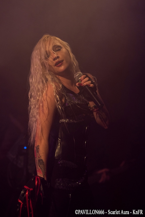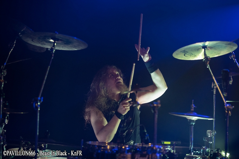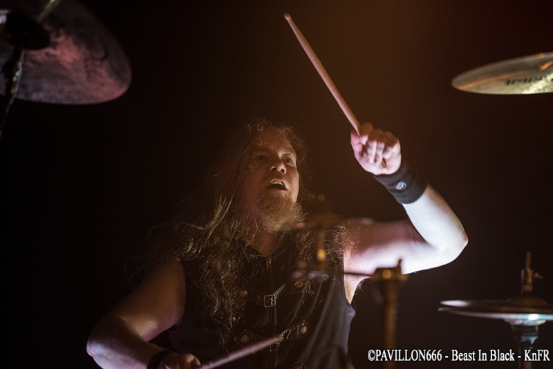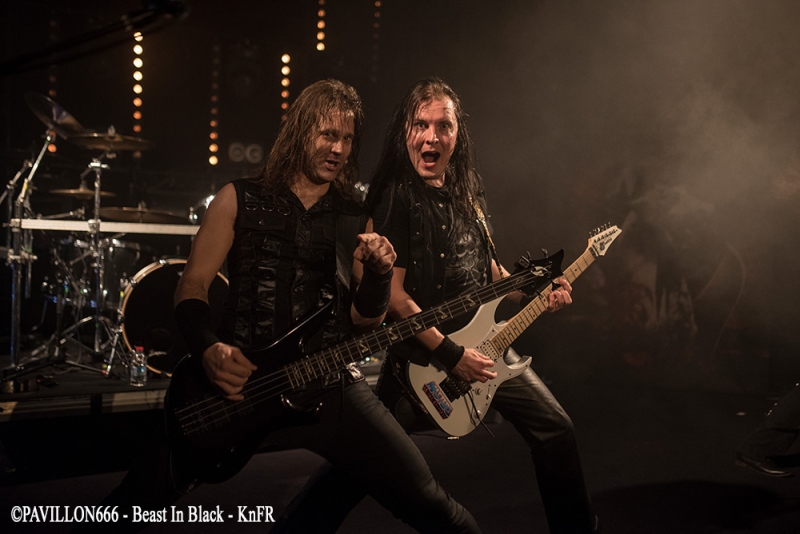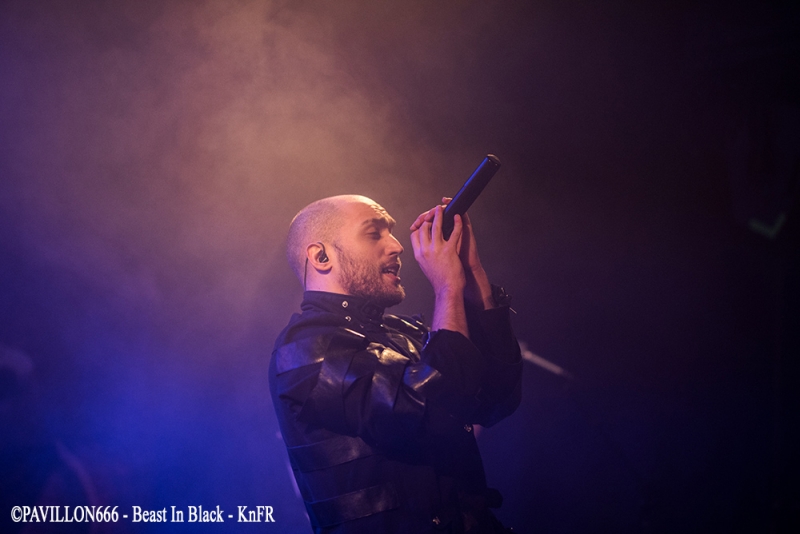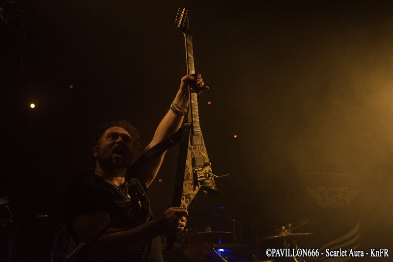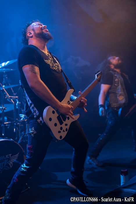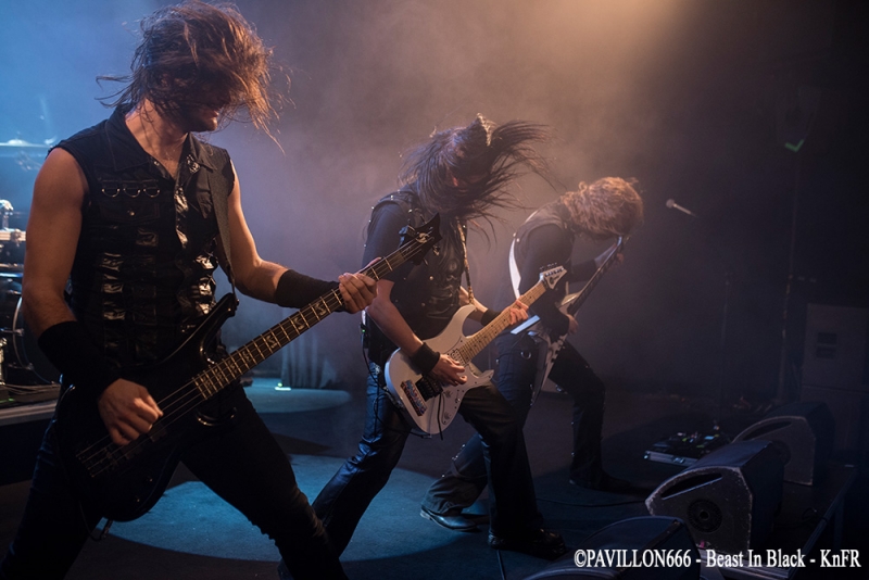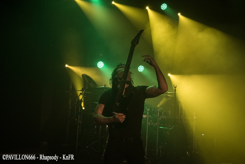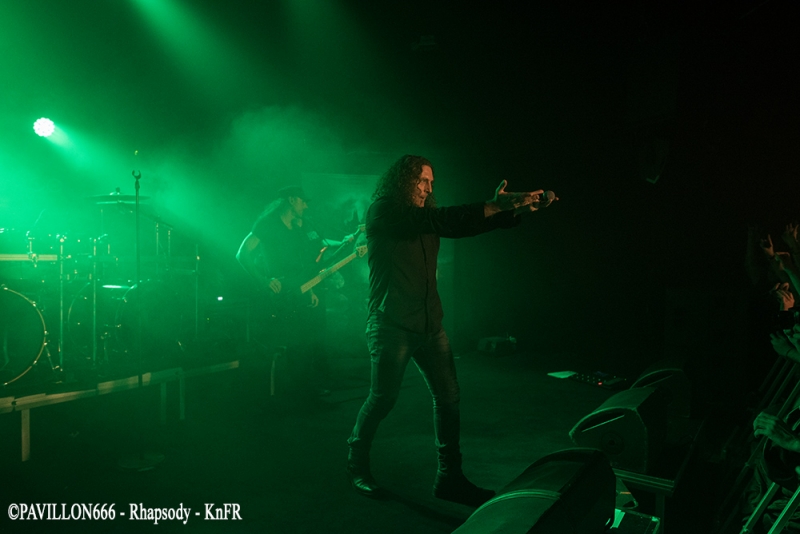 Mais avant de plonger dans l’univers des « Symphony of Enchanted Lands », nous avons tout d’abord droit à un jeune groupe originaire de Bucarest « Scarlet Aura » formé en 2014, avec la charismatique Aura au chant (ressemblance à Gwen Stefani), Mihai à la guitare, Catalin à la basse, et enfin Sorin à la batterie. Ce groupe propose un univers qui oscille entre le rock mélodique et hard mélodique, ils puisent leur influences dans des groupes comme Maiden, Helloween, et Nightwish. Aura soigne particulièrement son entrée sur scène, en portant des immenses ailes d’anges, et c’est avec grâce & légèreté qu’elle évolue sur scène, toujours avec le sourire, une voix bien puissante, mais qui peux aussi devenir très charmeuse/très douce, ou carrément chanter dans un mégaphone pour produire d’autres effets, à sa gauche Mihai un redoutable tueur armé de guitares Jackson, dont une « Jenna Jameson » signature upgradé avec des EMG81-85 délivre un son puissant et très incisif… sa gestuelle/attitude ressemblait souvent à du Kerry King. Tout comme Aura, Mihai peux parfois se transformer en frontman, et prendre possession de la scène, pour des redoutables solos. Du fait qu’Aura bougeait beaucoup sur scène, le bassiste restait un peu à sa place, c’est dommage, car je n’ai pu profiter de Catalin qui était complètement à droite sur la scène, et du fait que le Trabendo était complet, je ne pouvais bouger de ma place à l’extrême gauche de la scène. Bizarrement nous avons pas eu accès au pit-presse, étant donné qu’il y avait des pédaliers tout au bord de la scène (condamné à toujours avoir le même angle de vue). Le batteur était lui par contre complètement noyé dans les fumées, c’est un peu regrettable pour le visuel. La prestation de « Scarlet Aura », était magnifique, la magie opérant presque instantanément, avec une bonne section rythmique basse/batterie, les lights et le son assez bon. Ils ont proposé un set assez court d’une 30taines de minutes avec 6 chansons : Immortal In Your Eyes, The Beast Within Me, My Own Nightmare, une très belle reprise des Cranberries « Zombie » pour rendre hommage à « Dolores O’ Riordan » et Color Blind pour finir. A noter que « Zombie » est issue du dernier album du groupe « Memories », album exclusivement de reprises. Ils ont chaleureusement été ovationné par le public à la fin du concert, ce qui est un très bon point pour eux. « Scarlet Aura » restera une très belle découverte, et c’est avec plaisir que je retournerai les voir. Un bref changement de plateau, et c’est l’heure de « Beast In Black » de prendre possession des lieux. C’est un groupe Finlandais formé en 2015 par « Anton Kabanen » l’ancien guitariste de « Battle Beast » qui viens nous présenter son nouvel album « Berseker », pochette qui je pense fait un petit clin d’œil aux couvertures de Manowar… On retrouve « Yannis Papadopoulos » au chant (ou plutôt au Screaming), « Mate Molnar » à la basse, « Kasperi Heikkinen » & Anton aux guitares, et enfin un nouveau batteur « Atte Palokangas » aux fûts. Musicalement « Beast In Black » est une sorte de Métal Symphonique style Nightwish, avec un Yannis dans un look tres gothique, qui possède une voix très aigue (limite screaming), mais ce qui m’a dérangé le plus, c’est l’utilisation abusive de samples, de boucles de synthé, il se dégageait quelque chose de pas très naturel… C’est dommage cette surenchère, car Mate & Kasperi prenaient beaucoup de plaisir à prendre la pose, et à jouer avec les objectifs, d’autant plus que les lumières étaient très belle, Anton quant à lui était lui beaucoup plus statique à l’extrême droite de la scène, et Atte qui n’hésitait pas à faire le show : se frapper la tête, et baguette-pirouette en tout genre. Petite innovation, sur la chanson « Crazy, Mad, Insane » ils avaient un look très « Daft Punk » puisqu’ils portaient des lunettes noires (électronique à base de LEDs) sur lesquelles défilait les mots « Crazy », « Mad » & « Insane », j’avoue que le public à été surpris par cet effet visuel, mais également par la sonorité très « Dance/techno » de cette chanson, quel contraste avec le reste, ce titre tombe un peu, comme un cheveux sur la soupe. Carton rouge quand même sur « Eternal Fire » qui sent carrément le plagiat, du « Final Countdown » d’Europe, un peu dommage de pomper autant sur les autres :-( Ils auront joué 8 titres de leur dernier album : Beast In Black, Eternal Fire, Blood of a Lion, The Fifth Angel, Born Again, Crazy- Mad- Insane, Blind and Frozen, End of the World, le public n’a visiblement pas été très convaincu par leur prestation, puisque certains on déserté le pit, pour aller au ravitaillement, bar, merch… après avoir discuté avec quelque personnes de l’auditoire, les avis sont unanimes, visiblement on avaient parfois l’impression de toujours entendre le même morceau… et cerise sur le gâteau, cela ressemble comme 2 goutes d’eau à du « Battle Beast » le groupe qu’Anton à quitté. C’est enfin au tour des Italiens de monter sur scène, prestation qui réservera bien des surprises, ou pas… malgré une scène extrêmement très dépouillée, aucun backdrop, seulement 2 panneaux latéraux avec des illustrations. Première déception, quand on annonce le line-up d’origine, j’aurai aimé voir le groupe au complet, mais ou est donc « Alex Staropoli » le claviériste qui est pourtant le seul membre présent depuis le début du groupe en 1993 ??? réponse ca sera des bandes toute la soirée… chez Rhapsody le clavier est quand même une pièce maitresse, pour l’ambiance, les nappes de synthé. Sinon effectivement nous retrouvons toute le groupe qui était présent en 1997 quand le groupe a percé avec les 2 premiers albums « Legendary Tales » & « Symphony of Enchanted Lands ». Les ital