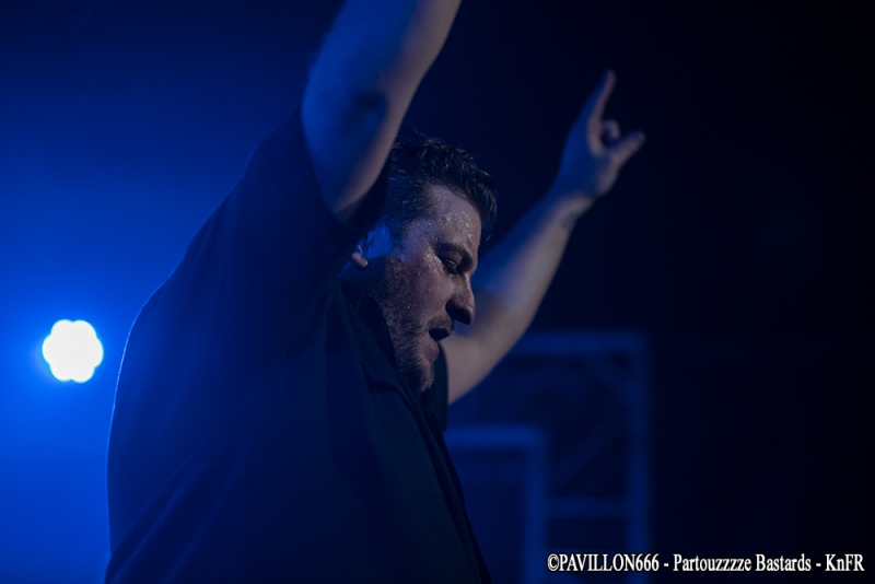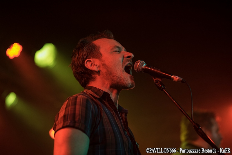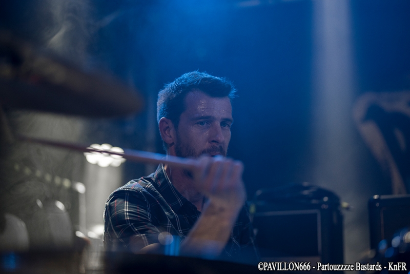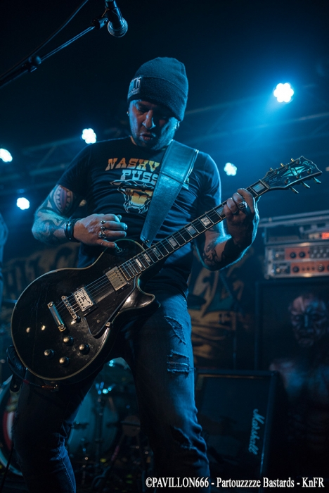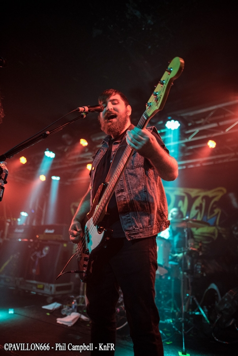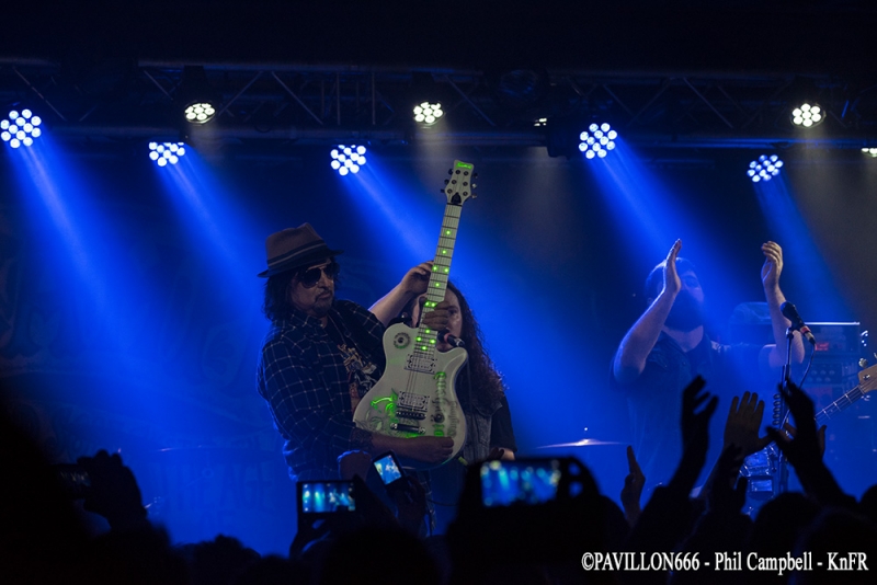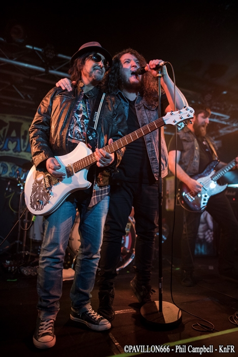 Avec un peu de retard, qui aura pour conséquence d’écourter leur prestation de 2 titres, c’est aux Français de « Partouzzzze Bastards » d’occuper le devant de la scène de la ‘Boule Noire’… Julien Bloch au chant, Arnaud Queudeville à la batterie, Denis Richard à la guitare, et enfin Yves Giraud à la basse avec une Rickenbacker s’il vous plait (il joue aussi avec les ‘ Fatals Picards’). Ils avaient déjà ouvert l’an dernier le 29 Janvier 2017 pour ‘Nashville Pussy’ au Batofar à Paris. C’est lors d’un concert de « Electric Mary » qu’ils ont eu le déclic, d’ailleurs ils n’hésitent pas à reprendre plusieurs de ses titres sur scène comme ‘Let Me Out’, ‘One Foot In The Grave’, ‘Gazoline’. Et pour rendre hommage à Lemmy, et faire un clin d’œil à Phil Campbell, ils s’attaquent sans problème à R.A.M.O .N.E.S. de Motörhead. Le public a adoré. C’est un joyeux bordel qui règne sur scène, car ils jouent surtout pour se faire plaisir sans trop se pendre la tête, et cette envie de fun/liberté se ressent dès les premières secondes, alternant des reprises de Electric Mary cité ci-dessus ou quelques compos personnelle… on reste quand même dans un registre assez Rock, chacun puisant des éléments dans son univers musical respectif (Clutch, Foo Fighters, RATM, Queens of Stone Age..), d’où le nom « Partouzzzze » puisqu’ils mélangent un peu tout, pour obtenir leur signature sonore, très rock. Arnaud & Yves assurent une solide section rythmique dans une symbiose remarquable, pendant que Julien et Denis partageant un mélange de joie, de rage, ou de folie communicative avec le public, et cela fonctionne très bien. Durant leur set, ils nous feront découvrir « : Kick me out, The words, Sing Alone, Lower Ground, Mister kill issue de leur dernier EP sortie l’an dernier. Quand ils quittent les planches, ils ont réussi à bien chauffer le public, qui est prêt à accueillir Phil Campbell. La scène pour l’ex-gratteux de Motörhead est bien décorée, large backdrop aux couleurs du groupe derrière la batterie, flags sur les baffles des Marshall, et petite estrade en bord de scène, pour avoir un piédestal et prendre de la hauteur lors des solos. Phil à crée son groupe avec ses fils : Todd à la guitare, Dane à la batterie, Tyla à la basse, et ‘Neil Starr’ (le seul qui ne fait pas partie de la famille) au chant, après la disparition de Lemmy de Motörhead. PC&TBS étaient là pour présenter leur nouvel album « The Age Of Absursity » sortie en Janvier 2018. Une set-list alternant une douzaine de titres de Motörhead, et 8 chansons de leur projet familial. Mais c’est sur « Big Mouth » que PC&TBS vont ouvrir les hostilités, même s’il manque la hargne de la basse de Lemmy, on reconnait entre 1000, la signature sonore de Phil dans ses riffs, et cela continue à sonner comme du bon vieux Motörhead. Pas le temps de souffler qu’il nous présente ‘Freak show’ un titre tres hard-rock sur-vitaminés avec de grosses rythmiques et bien sur encore des solos à la Phil Campbell ;-) Aux premières notes de « Deaf Forever » c’est l’hystérie dans la salle, bien que Neil Starr n’est pas le même organe vocal que Lemmy, si rauque, éraillé, si unique, il arrive néanmoins à la chanter à sa manière, histoire de garder sa propre personnalité, et ne pas chercher à plagier, ni imiter. Dans un autre style, c’est lui qui gesticule le plus sur scène, qui essaye de prendre possession de la scène, même si bien souvent , les yeux du public sont rivés vers la gauche de la scène, là ou officie Phil. Dane n’est pas Mikkey Dee, mais force est de constater qu’il arrive quand même à assurer derrière ses fûts, à tenir la cadence, même quand il faut envoyer du lourd. Ce concert sera l’occasion d’écouter des titres que Motörhead ne jouait plus trop souvent, comme « Born to Raise Hell » (B.O. du film ‘Airheads’ … ou Lemmy est en duo avec Whitfield Crane & Ice T) La présence d’une 2eme guitare en la personne de Todd avec son Epiphone SG équipé de triple humbucker, va permettre d’enrichir considérablement leur son, en créant de belle harmoniques, et une très grande complicité entre père et fils… Phil n’hésitera pas d’ailleurs à utiliser sa Framus Orgasmatron, avec le logo Motörhead sur le corps retro-éclairée par des leds vertes en incrustations, il possédait également une Flying V avec une finition acier sur le corps, et bien sur le logo de Motörhead gravé sur le corps. Le dernier fiston Tyla, même sans être équipé de Rickenbacker, ni jouer comme Lemmy (lui seul savait dompter la bouillie sonore de sa Rickenbacker, avec sa façon de jouer si particulière), arrivera à bien faire ronfler son instrument, à nous produire de belle et puissante ligne de basse, c’est le Campbell qui se fera le plus discret sur scène, qui n’ira pas s’aventurer sur le piédestal, contrairement à Phil & Todd. Mais PC&BS sont aussi capable de faire des titres plus bluesy tel que ‘Dark Days’ avec un zeste d’harmonica, très agréable à découvrir sur scène, un peu de douceur de temps en temps, avant de re-attaquer pied au plancher avec une très vieille chanson Hawkwind du temps ou Lemmy était leur bassiste (après être brièvement passé chez Sam Gopal), certainement le titre le plus connu « Siver Machine » . Après cette séquence nostalgique, un violent et brutal retour à la réalité résonne la ligne de basse de « Ace Of Spades », même s’il a été raccourcie à 3 minutes, ça headbang dur dans la fosse. Au bout de 1h20 c’est déjà l’heure des rappels, pour 4 titres, Just ‘Cos You Got the Power, Rock’n’Roll, Heroes (David Bowie) et Going to Brazil… La Boule Noire est « sans dessus dessous », il faisait très chaud dans le pit, et ça pogoter sévère. Après tout ça reste encore du « 49% Motherfucker, 51% Son Of A Bitch ». Lemmy p