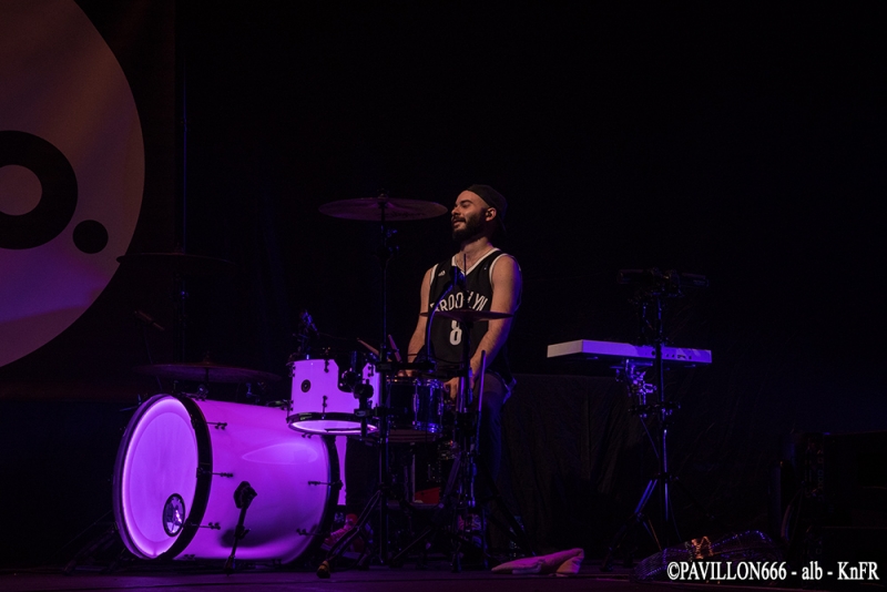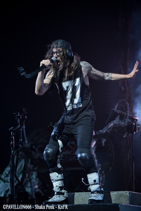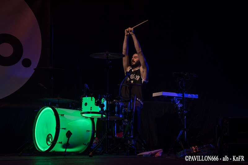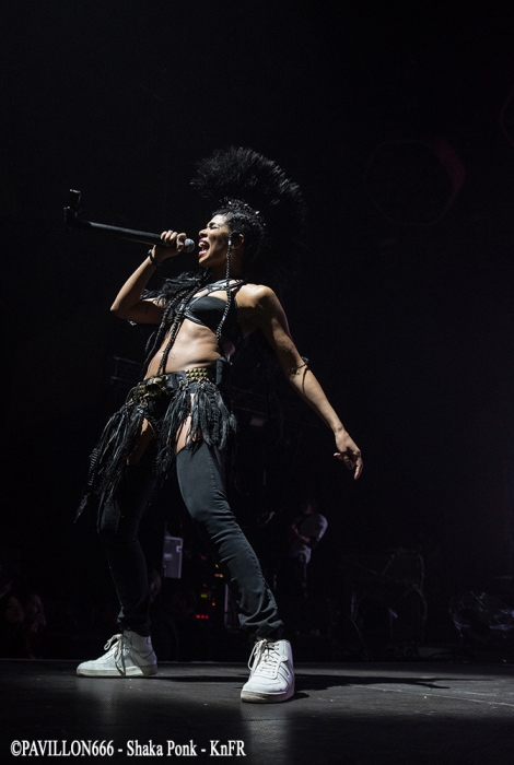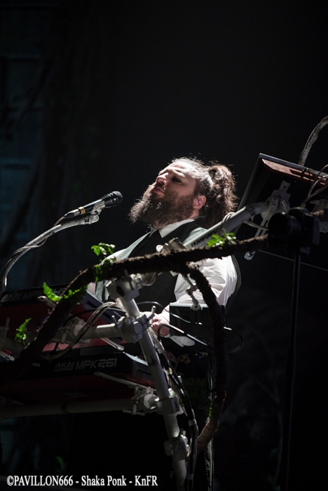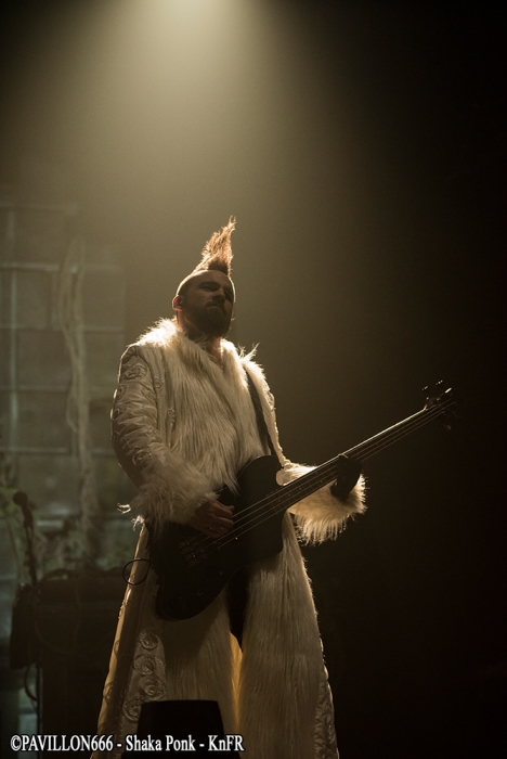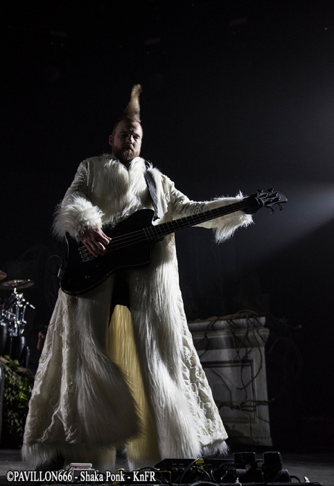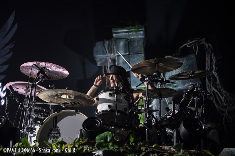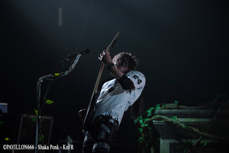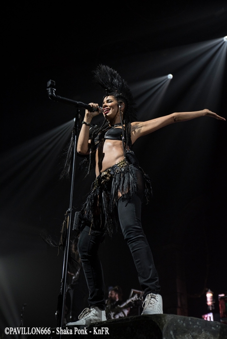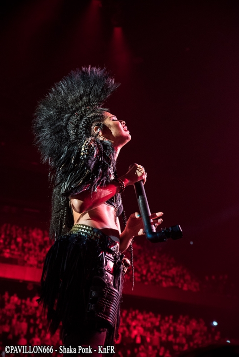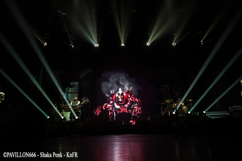 Ce Vendredi 23 Mars, 22 mille Monkeys sont présent dans la salle, la date affiche d’ailleurs complet. Ce n’était pas leur 1er passage, ils étaient déjà passés le 5 Juin 2012 à Paris-Bercy en 1ere partie de « Axl Rose & co. » A 20 heures, c’est le groupe d’Electro-Pop Français originaire de Reims « ALB » composé de ‘Clément Daquin’ aux claviers/chant/guitares et ‘Raphaël Jeanne’ à la batterie qui sont en charge d’ouvrir pour Shaka Ponk. Une scène très sobre, très minimaliste, un backdrop au centre de la scène, les claviers de Clément décalés sur le coté gauche, le kit de Raphaël à l’opposé sur le coté droit, les 2 musiciens se faisant face. Musicalement il faut aimer cette musique très électro, avec ses nombreux samples permettant à Clément de passer beaucoup de temps à tourner les potards dans tous les sens, voire hybride, quand Clément jouait en overdub avec sa Gibson SG, ou sa folk Taylor, mais par contre visuellement, d’un point de vue spectacle c’était très sympa, les claviers, la grosse caisse, la caisse claire, et le tom étaient retro-éclairés par un système de Leds avec vario, donc le résultat était très réussi, très bonne idée… un avant gout du déluge visuel qui allait débouler avec la tribu à Goz. Le point d’orgue de leur prestation, a incontestablement était leur titre le plus connus « Whispers in the Moonlight » (qu’ils avaient joué aux Victoires de la Musique en 2015) ou des milliers de personnes ont dégainés leur téléphone portable pour faire un ciel étoilé dans Bercy, c’était vraiment majestueux. Setlist : Ididudid, The Less I Know (The Better), Endless Together, Golden Chains, Whispers in the Moonlight, Never Miss You Au bout d’une petite ½ heure, il est temps de faire place nette sur le devant de la scène (la grosse artillerie étant caché par un rideau), et d’installer des micro supplémentaires 20h55 place à l’Electro-Rock de Shaka Ponk, « The White Pixel Ape Show Intro » commence à résonner dans les enceintes, on aperçoit une animation sur l’immense écran géant parfaitement intégré dans le décors : des ruines antiques envahies par la jungle, des piliers de temples, des lianes, du lierre qui s’enroule même autour des pieds des micros, et bien sur des rochers, des blocs de pierres… en 25 ans de concert, j’ai rarement vus une scène aussi belle, aussi travaillée dans le moindre détail… on se croirait chez les Aztèques ou Maya. Pendant que nous regardons ce film-animation (en image de synthèse) des « Singes de la sagesse » revus/corrigé et surtout réalisé par Frah & Ion (qui sont aussi infographistes), nous apercevons le bassiste Mandris avec son immense crête de Punk et habillé d’un long manteau de fourrure blanche, se mettre en place sur la droite de la scène, pendant que son acolyte Cyril guitariste alias C.C dans une panoplie de footballeur américain se positionne sur le coté gauche, puis c’est au tour de Mr kilt (enfin Steve) de s’installer à ses claviers, et Ion de prendre place derrière son kit. Les « Singes de la sagesse » s’énervent de plus en plus, et petit à petit, c’est Goz le gorille, mascotte du groupe qui apparait sur l’écran, les lumières virent au rouge, à l’élément feu, un arbre apparait en contre jour… les branches s’animent et c’est finalement Samaha qui se détache du décors, telle une ombre chinoise, pour rejoindre Frah. Et c’est partis pour le show…ils attaquent très fort avec ‘Killing Hallelujah’ qui provoque un raz de marée dans la fosse, le public est déjà en transe, pendant que sur scène Frah (fringué avec son pantalon noir renforcé avec des genouillères, sa grosse boucle de ceinture ‘tête de mort’, son casque audio sur les oreilles) progresse sur l’avancée de la scène, accompagné par Sam une très belle Amazone portant une crête iroquoise dans une tenue très sexy. Bien sur Frah ne peux s’empêcher de s’offrir son 1er bain de foule, son 1er slam sur cette 1ere chanson pour le plus grand bonheur des spectateurs dans les premiers rangs. On remarque, que les chorégraphies de Frah/Sam sont parfaitement synchronisé avec les effets visuels sur l’écran central, on pourrait croire que c’est l’anarchie sur scène, mais ce n’est qu’une illusion, ils savent parfaitement se positionner au bon endroit avec le bon timing. La setlist est savamment préparée alliant des chansons de leur nouvel opus « The Evol’ » et leurs tube live, et ca va enchainer pendant 2h30 dans un tourbillon de folies, de furie animale, de sueur, et même quand ils décident de calmer le jeu, l’émotion dans la voie de Sam sur le magnifique cover de Nirvana nous fait chavirer. Le public restera d’une réactivité exemplaire quand Frah demande au public s’il est prêt pour « une putain de fiesta », tel Moïse qui écarta les eaux de la mer rouge en levant les bras au ciel, Frah avec la même gestuelle demande au public de lui faire le sentier, pour rejoindre sa plateforme -éphémère- au milieu de la fosse, pour tel un chef indien, demander à son public, de faire un immense « Circle Pit », et c’est ainsi que plusieurs centaines de personnes se lancent dans cette grande ronde autour de leur Totem vivant : Frah. Comment aller du centre de la fosse, jusqu’au gradin (porte P), Frah à la solution, un slam, et quelques minutes plus tard, porté par la foule il arrive sain & sauf à destination, pendant que Sam resté pendant « The Party » sur scène, arrive à son tour sur le caisson désormais vacant, et c’est ainsi qu’ils vont nous interpréter, chacun à un point de Bercy « Smells Like Teen Spirit ». Et puis les artistes virtuels s’inviteront sur scène pour un « Battle Ion Vs Goz », puisque Mandris affrontera Lemmy Kilmister à la basse (sur ‘Ace Of Spades’ bien entendus), C.C se mesurera à Kurt Cobain, sans oublier Bowie & Prince. Cet interm