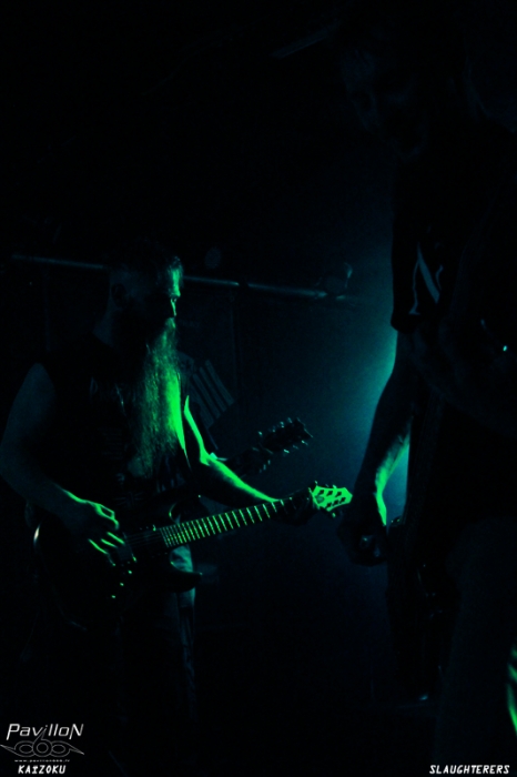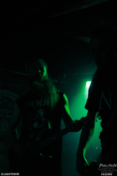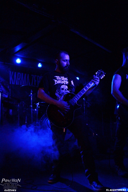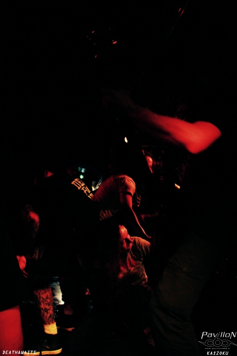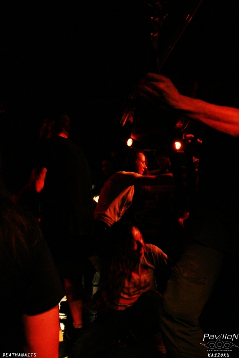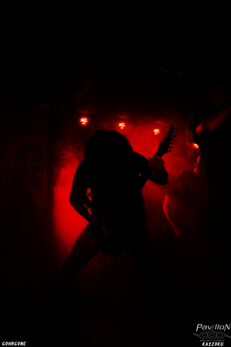 Une soirée de folie qui a commencé doucement avec Slaughterers qui aurait mérité plus de public ! Tant pis pour les retardataires, technique et groove étaient au rendez-vous. Le groupe habitué du Sylak nous a proposé un death bien pêchu mené par un chanteur guitariste soliste. Lourdeur, cris stridents transperçant la nuit, Slaughterers nous embarque dans une virée nocturne et nous envoûte. C'est carré, le public commence à remuer, la soirée est lancée. Arrivent ensuite Karma Zero. Le groupe de hardcore n'est pas venu pour enfiler des perles mais pour secouer le public avec assurance. Venus défendre son second album "Monsters", ces quatres Nantais ont déjà foulé les scènes du Hellfest et du Wacken et déploient ce soir-là autant d'énergie que devant des milliers de personnes. La salle s'est remplie depuis et c'est dans la chaleur que le public accueille Gohrgone. On est resté dans la région Rhône-Alpes, on est parti en Bretagne, c'est au tour de nos amis Parisiens de s'exprimer. Ambiance death à nouveau, on sent avec Gohrgone une expérience de la scène bien marquée à travers le registre lourd, puissant et très efficace proposé. Avec deux albums à son compteur Gohrgone s'affirme et souhaite accentuer sur scène ses inspirations mythologiques grecques déjà présentes dans ses textes mais qu'on ne retrouve pas dans le discours de son chanteur en verve entre chaque morceaux. L'ensemble n'en sera que plus cohérent et puissant. Le public a été loin de se changer en pierre pendant la prestation de Gohrgone et les cheveux tournoient dans tous les sens. Frénésie et sol inondé de bière, l'ambiance est là pour accueillir les rois de la soirée ! Avec son expérience en âge de se raser et d'avoir un scooter, Deathawaits nous montre qu'avec beaucoup de travail on peut s'accrocher et perdurer dans le métal. Le groupe aux multi influences death, thrash, hard et même grind a sorti il y a un an son troisième opus, "Solve Coagula", qu'il défend depuis sur les routes de France et d'Espagne. Ayant déjà partagé la scène avec des groupes internationaux à plusieurs reprises, une aisance avec le public s'est créée et perdure. Plus frais que jamais les cinq compères ont mis le feu à la scène ce soir-là avec groove et énergie ! Ils sont chez eux et ça se sent ! Le plaisir est aussi intense des deux côtés de la scène. Derrière ses fûts le groupe a accueilli récemment l'excellent Julien Ropert (It Came From Beneath) qui, toujours le sourire aux lèvres, a soutenu ses nouveaux camarades de jeu avec brio. La salle monte en chaleur, Flo au micro mène la danse et est rejoint par une bonne partie du public sur la scène que l'on fini par ne plus discerner ! Dur dur de prendre des photos, sans parler de la lumière difficile à apprivoiser, mais l'essentiel est de profiter ! Bref, ambiance grosse teuf entre potes, mais le tout avec technique, puissance et créativité, c'est ça Deathawaits. Une soirée dans une bonne ambiance à l'habitude du Rock'nEat que je remercie pour l'accueil toujours au top. Merci à Thibaut Bernard qui nous a offert un son de qualité dans nos esgourdes. Merci aux groupes pour avoir fait monter la mayo toute la soirée et bonne continuation pour la tournée! |