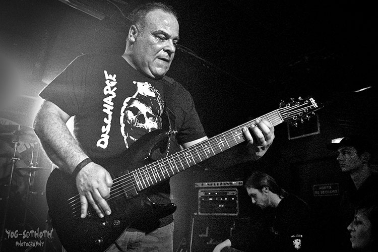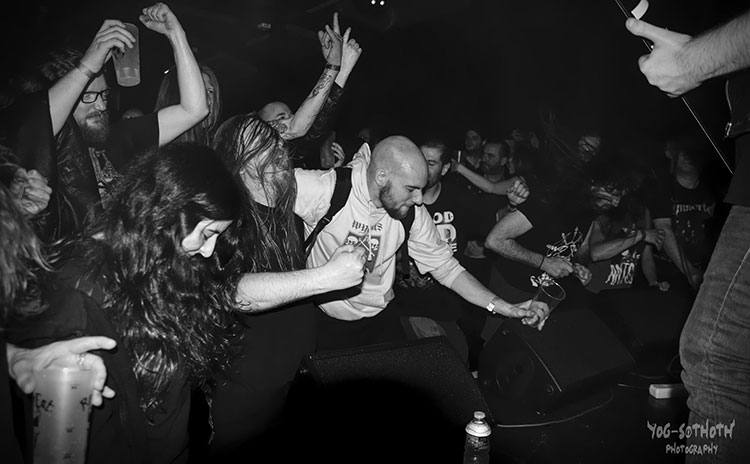 Plus d'une heure avant le début des hostilités, des groupes de jeunes et de moins jeunes, reconnaissables à leur tenue caractéristique d'authentiques métalleux, se retrouvent sur le quai et à l'entrée de l'établissement. A l'intérieur, on se restaure, on se désaltère, on bavarde, ou bien on attend confortablement 21 heures. Les « balances » sont terminées. Quatre groupes se succéderont sur la (relativement petite) scène du Rock 'n Eat. Le public, déjà nombreux, sait pourquoi il s'est déplacé ce soir, venu de l'agglomération lyonnaise, de toute la région, parfois de très loin et même du Nord de l'Europe, pour assister aux deux soirées. Finalement, ce seront plus de 300 personnes hypermotivées qui se presseront dans la salle pour ne rien perdre du spectacle. C'est aux Grenoblois de ENOKHIAN que revient l'honneur d'ouvrir la cérémonie, ils jouent ce soir leur premier concert. Le quartette de death metal compte dans ses rangs une artiste connue pour sa présence dans au moins deux autres formations, à savoir Little Angus (ELECTRIC SHOCK, LE GRAND BOUC NOIR). Les régionaux pratiquent un death teinté de black metal somme toute assez classique, mais de très bonne facture. Quoi qu'il en soit, leur set de 30 minutes s'achèvera sous les applaudissements nourris de ceux qui les connaissent et de ceux qui les découvrent, la majorité. Le deuxième groupe de cette soirée s'appelle SEPULCHRAL -FR, originaire de Lille. Après une longue interruption (1993-2015), nos vétérans pratiquent ce qu'ils nomment eux-mêmes un « death metal old school ». On les écoute avec attention et respect. Leur joie de se produire à Lyon ce soir fait plaisir à voir, une demi-heure et il faut déjà remercier le public et quitter le plateau. Belle surprise, belle découverte, ces Lillois ! Petite pause et ce sont les Danois de UNDERGANG qui investissent la scène, eux aussi sont quatre. Leur death metal ultra énergique, tendance black, comme leurs yeux grimés, déclenche aussitôt un mouvement de foule, le premier pogo de cette soirée, un vrai séisme ! Slams et pogos s'enchaîneront sans répit jusqu'à la fin du set. On peut affirmer que les Nordiques ont retourné le Rock'n Eat. Les Scandinaves sont des spécialistes reconnus au-delà de leur pays de ce style qui crée l'osmose entre la scène et la salle et l'ambiance qu'on attend d'un vrai concert de metal. Bravo UNDERGANG ! Ils ont droit, eux, à un set de 50 mn environ, follement applaudi. Précisons que leur nom (UNTERGANG en allemand) signifie,entre autres, la chute, le naufrage...Tout un programme ! C'est un quintette breton qui conclura cette soirée death metal, le groupe VENEFIXION, originaire de Rennes. Après les « stars » de UNDERGANG, on pouvait craindre une petite désaffection du public tellement excité dans la fosse, il n'en fut heureusement rien. L'enthousiasme persiste jusqu'au bout. On note dans cette formation la présence d'un guitariste qui officie également dans l'excellent groupe de thrash rennais HEXEKUTOR, lequel joua le 1er avril 2017 dans le cadre de « Lead Us Into Hell ». VENEFIXION a sorti un EP en 2015. Cette soirée aura été une belle réussite, suivie, n'en doutons pas, d'un autre grand succès le lendemain au CCO de Villeurbanne. Par ailleurs ces quatre formations à la fois semblables et différentes auront montré une fois de plus que le death metal « pur et dur » ou nuancé thrash ou black se porte bien. Il convient d'adresser un grand merci amical à Ulric, cheville ouvrière de l'événement, et à son équipe de passionnés, ainsi qu'au Rock'n Eat pour son accueil toujours aussi sympathique. * Les set-lists disponibles figurent parmi les photos ci-dessous : |