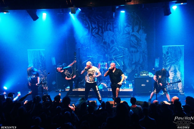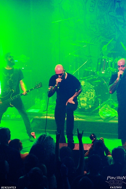 Benighted, 20 ans de carrière, 8 albums et des milliers de fans au compteur. Le public, il faut le dire, attendais surtout les stéphanois, les rois du brutal death. Accrochée au retour devant moi comme un pousse-pied à son rocher pendant la marée montante j'essaie de prendre quelques photos devant la scène qui me rentre dans les côtes entre deux pieds dans la tête et ma colonne vertébrale qui tente d'amortir les chocs. Ça faisait longtemps que Benighted n'était pas passé à Lyon et les fidèles sont là pour foutre un joyeux et gros BOR-DEL !! Surtout que le groupe a préparé quelques surprises ! Et oui, que serait un anniversaire sans cadeaux ? Quelques guests se sont donc glissés dans le line-up habituel. C'est comme ça qu'on retrouve Arno, le chanteur de Black Bomb A, Niklas de Shining et sa folie, et Sven d'Aborted pour des duos enragés avec Julien Truchan. Kévin Foley, croisé il y a deux semaines derrière ses fûts avec Lofofora, retrouve son premier amour, le métal, pour une chanson avec ses anciens compagnons de route, dont Olivier Gabriel, ancien membre également. Benighted c'est un groupe mais c'est avant tout une bande de potes de longue date. On retrouve d'ailleurs au balcon du CCO notre ami Christophe Charretier, un des membres fondateur du groupe, derrière son objectif pour filmer le set des copains. Une histoire d'amitié et d'amour entre le groupe et les fans également. Une grande générosité se ressent quand un groupe est sur scène et là c'est la cas malgré l'expression violente et l'exorcisme de la folie humaine à travers les textes hurlés, criés ou grognés dans le micro. Mélangeant anciens et nouveaux morceaux piochés dans Necrobreed, leur petit dernier, ou dans leurs albums plus anciens, il y en a pour tout le monde dans ce set. Le public est dedans du début à la fin et enchaîne les circles pit. Julien, liant le tout avec de petits gestes de chef d'orchestre.