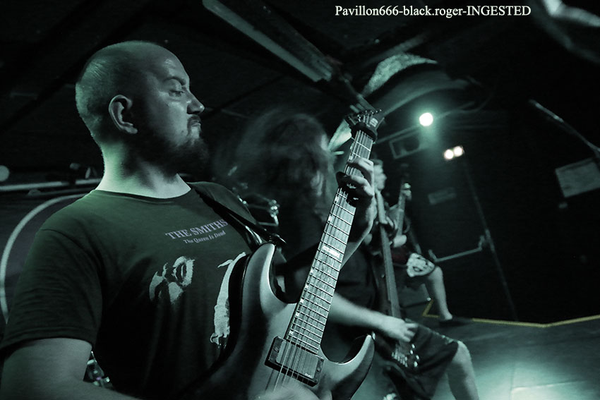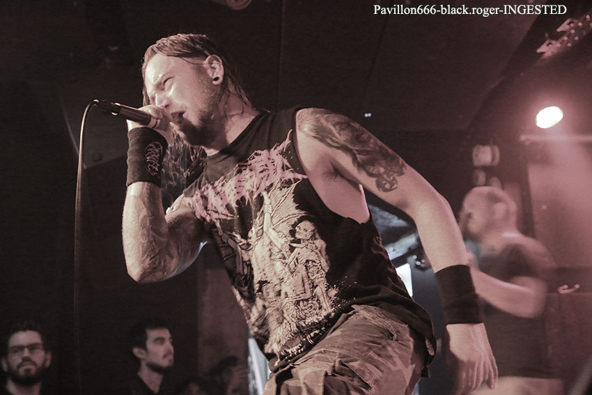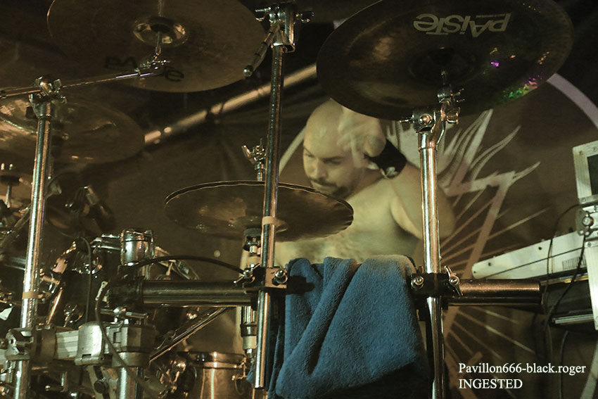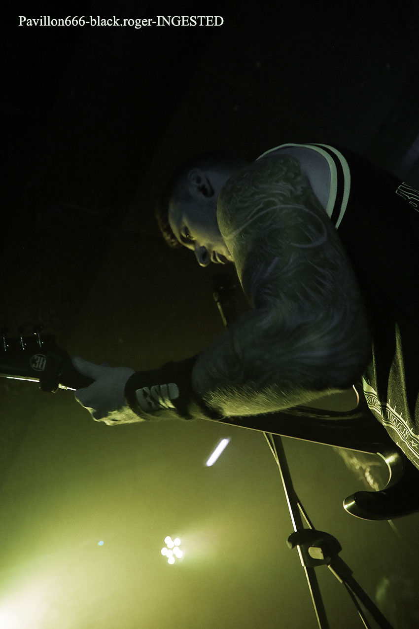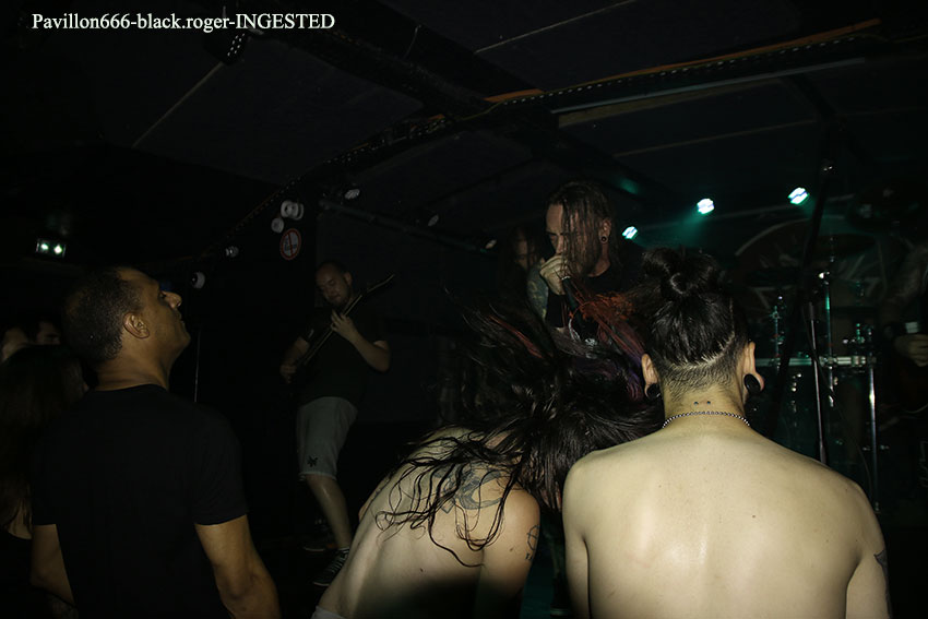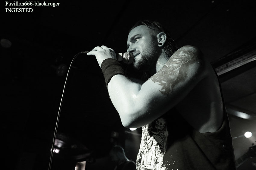 BENEATH AN OBSIDIAN SKY nous propose déjà deux enregistrements, « dead sirens » de Janvier 2016 et « leviathan » de Novembre 2017, mais en live ça donne quoi ? Eh bien, à l’aide de chorégraphies scéniques remarquables et d’un son lourd de conséquence, ça tabasse sec ! C’est donc très heavy, mais aussi brut, nerveux et rapide à l’occasion afin de faire bouger un public plutôt orienté beatdown hardcore, le death relevant des growls arrachés du frontman mais pas que. Les petits gars du Sud vont aller loin je pense car ils arrivent à nous présenter un certain brutal deathcore sortant de l’ordinaire. Ils y croient, et nous aussi, après leur prestation agitée et passionnée de ce soir qui a séduit une assistance venue pour en découdre sur du bon son. En provenance de Manchest U.K. voici maintenant les sauvages de la perfide Albion, INGESTED. Alors ici pas de compromis ni de douceurs mélodiques, on nous tranche la cervelle à l’aide d’un brutal death qui aurait copulé avec du beatdown hardcore afin de mettre au monde un bâtard démoniaque appelé slamming death-metal. Ces tueurs nés débarquent sur scène avec la ferme intention de nous en mettre plein la « g …le » notamment à l’aide de titres de leur dernier « méfait » « the level above human », mais pas que. C’est brutal, sale et féroce à la fois, c’est une leçon de slam-death bien résumée pour ceux qui ne connaissent pas encore. Et allez ça va faire mal avec un déchaînement quasi continu du duo basse/batterie, surtout batterie. Le groupe nous offre donc au travers de compositions variées un déferlement de vocaux inhumains, des riffs lame de rasoir ne boudant pas une certaine technicité. Bref, pas de linéarité dans un show intense, mais peut-être un peu court à notre avis. Nous en aurions bien repris une louche car la démonstration fut implacable dans son ensemble, ah slam quand tu nous tiens ! Alors merci les gars, que vous soyez de Montpellier ou de Manchester, vous nous avez convaincu ce soir dans un Rock n’Eat transpirant que nous remercions bien entendu pour ses concerts bien « à propos ». |