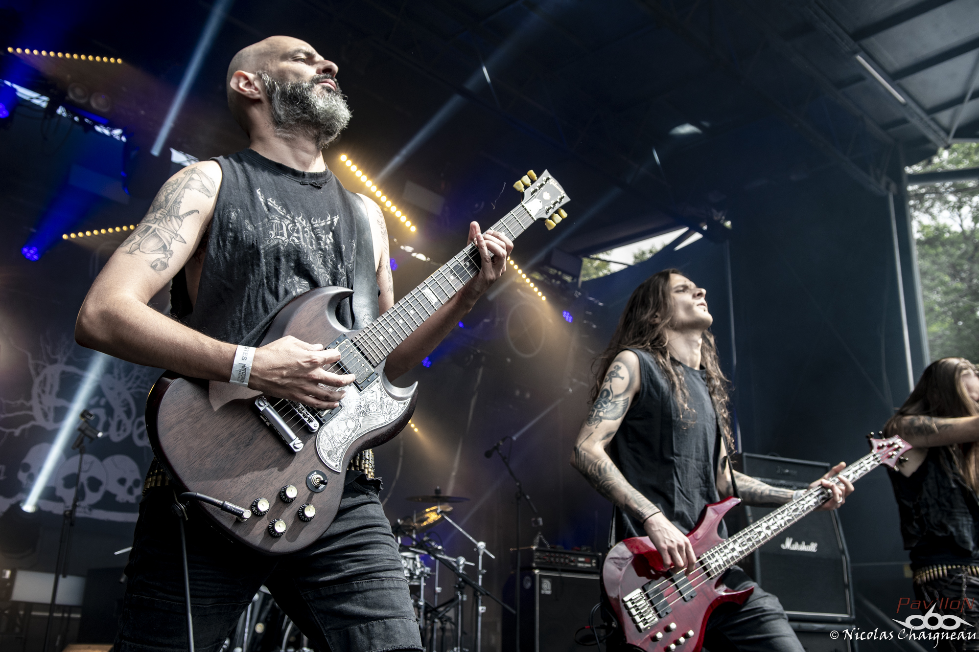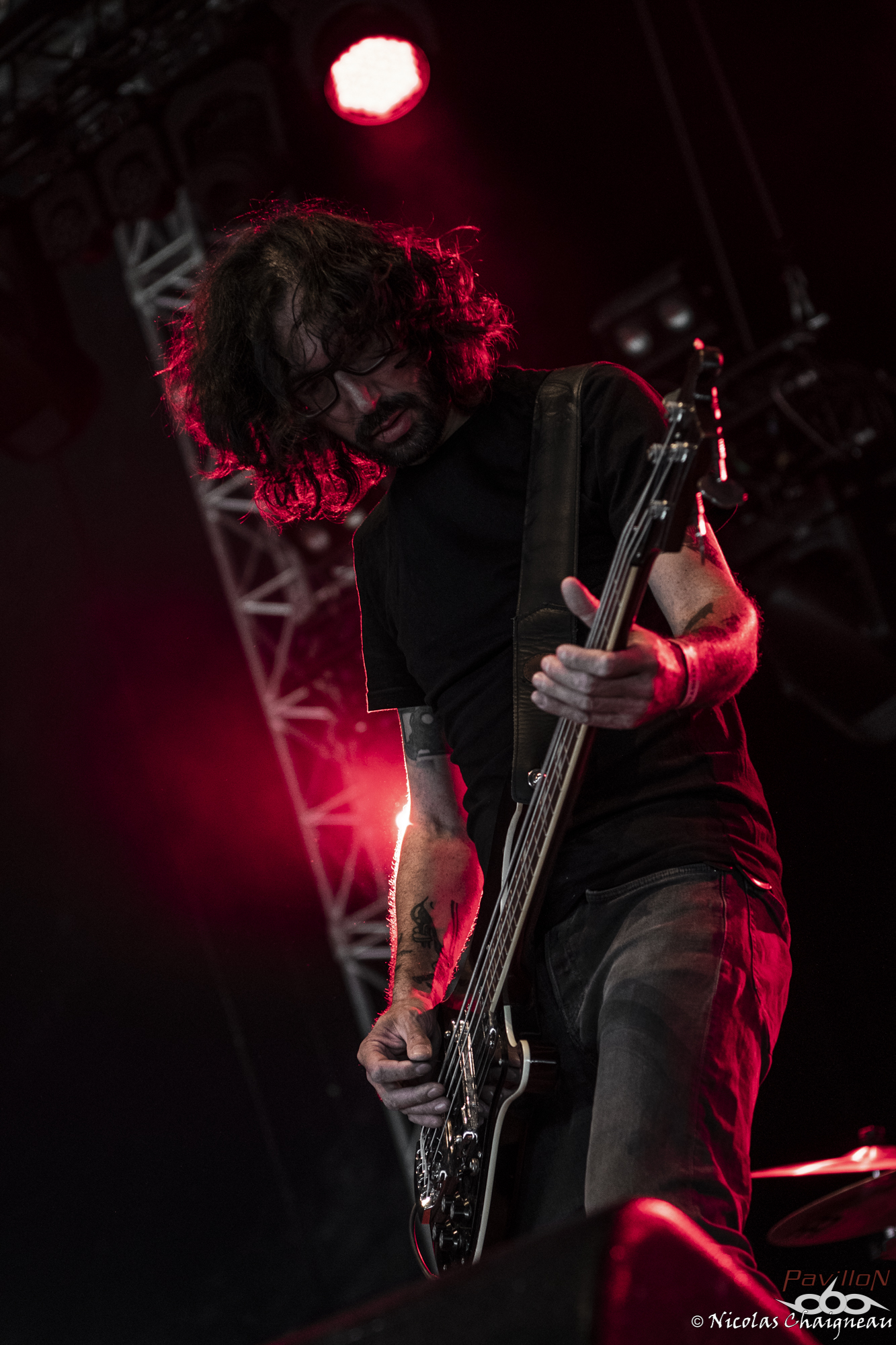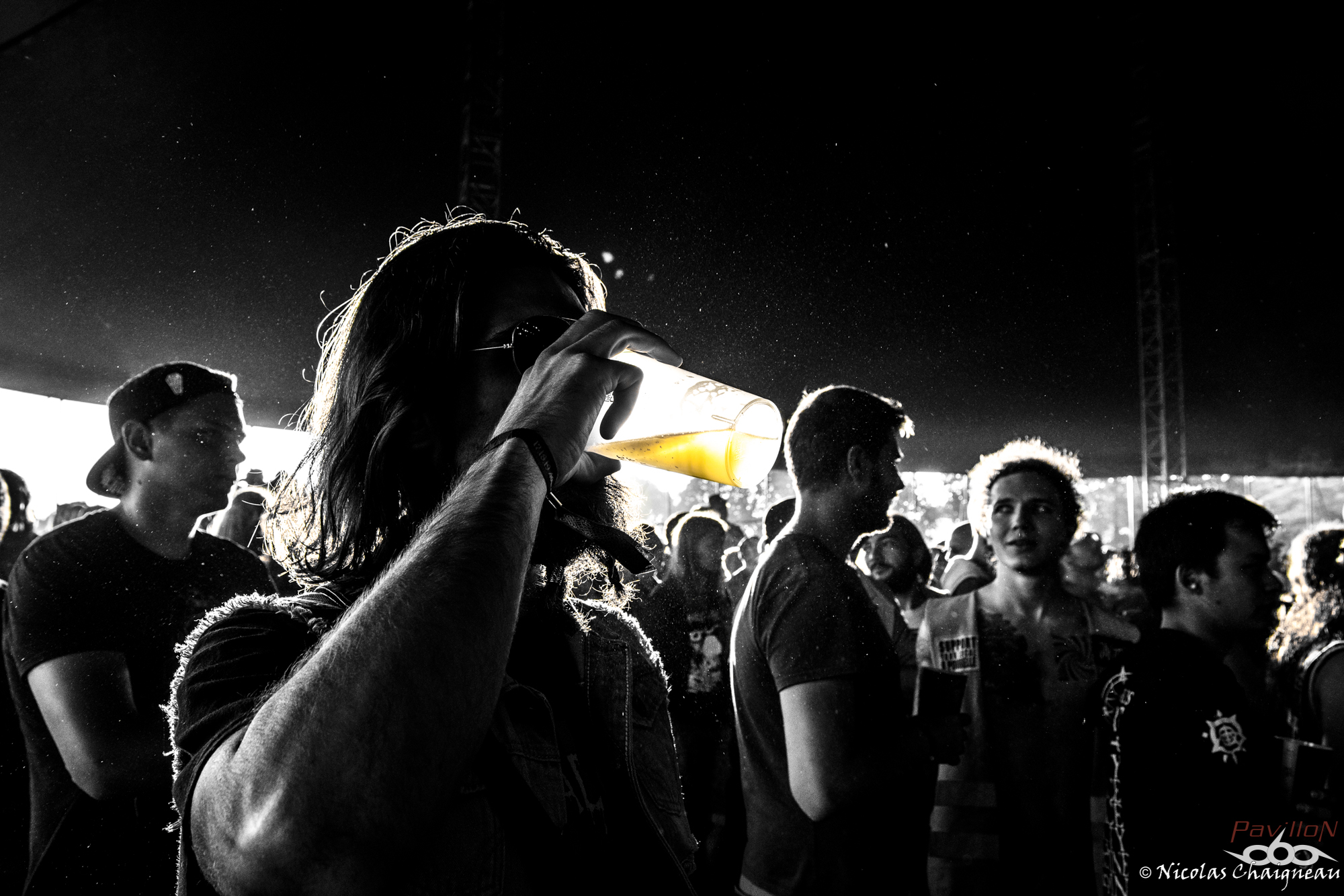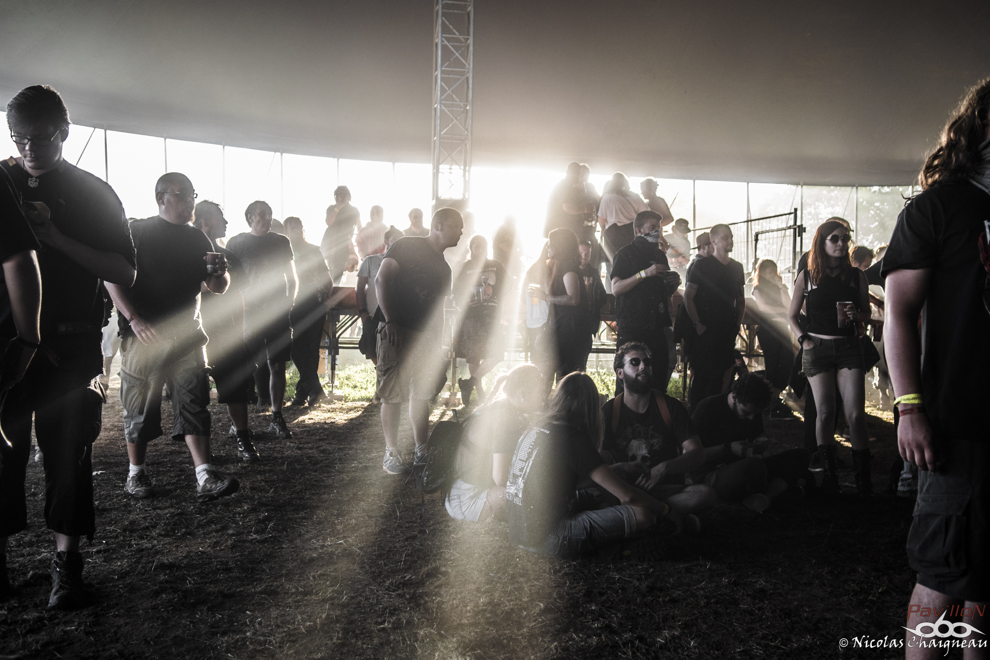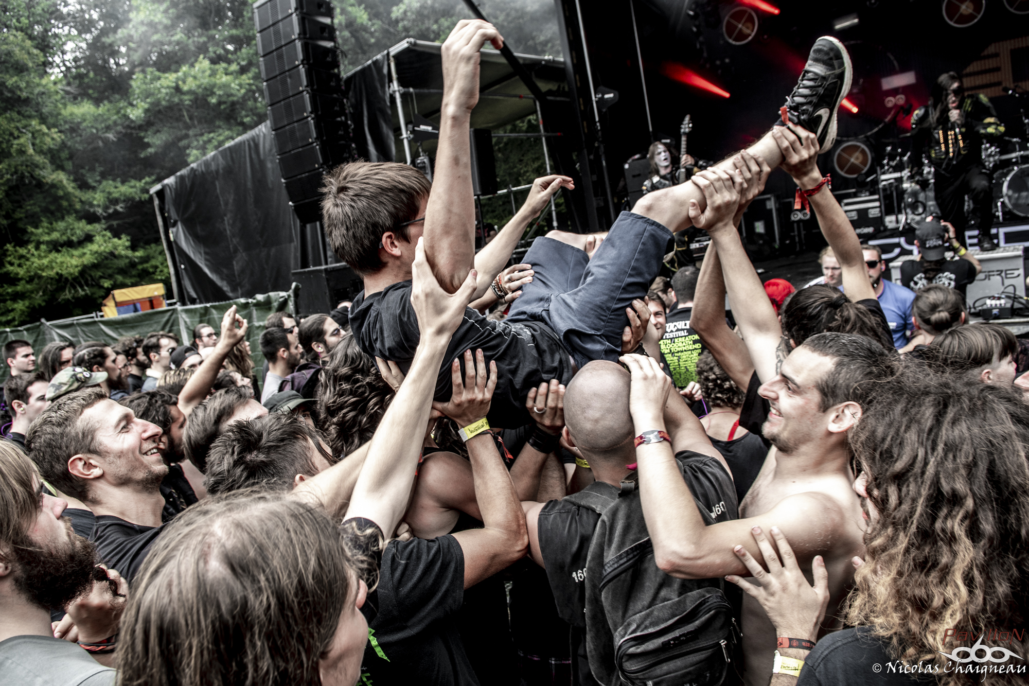 Après un rapide tour du site que j'approfondirai plus tard (il n'a quasiment pas changé), je me dirige vers la scène principale, la "Dave Mustage" pour voir The Lumberjack Feedback. Les lillois et leur sludge teinté de doom ont la tâche délicate d'ouvrir les festivités... et s'en sortent plus que bien ! Le groupe aux deux batteurs attire les premiers festivaliers. Pas très adepte du chapiteau, je décide d'aller à la petite Supositor Stage plutot que devant la Massey Ferguscene. Après tout, c'est un festival OPEN AIR ou non ? J'ai la nostalgie des éditions plus anciennes, je sais. Toujours est-il que j'y découvre Ende, au black ambiancé efficace. Le tout premier slam de ces trois jours a lieu pendant ce set, sorti d’un public encore en train de se chauffer mais motivé et dynamique. Si Ende était passé plus tard, l’ambiance aurait été très prenante dans le public, j’en suis certain. Il est très vite l’heure de retourner sous le grand chapiteau violet de la Dave Mustage voir les punkettes de Maid of Ace. Les quatre frangines britanniques viennent nous sortir un concert de punk… mollasson. Personnellement je n’ai pas accroché, il manquait un truc comme un peu de rage plutôt que seulement le look punk… ou je ne sais pas moi, de l’envie émanant des membres ? A part la chanteuse, disons le clairement les autres ont l’air de limite se faire chier sur scène, à part lors de petits éclats de pèche qui du coup semblent n’être que du jeu de scène forcé. On m’avait vendu ça comme autrement plus péchu et je repars déçu de cette performance. Par contre les Allemands de Cypecore venus sur la Supositor m’ont botté le cul. A mi chemin entre l’indus et le death, leurs morceaux nous mettent de bonnes claques. Le visuel n’est pas délaissé non plus, les membres était habillés d’armures de motocross noires couvertes de néons, maquillés au cambouis. Leur univers post-apocalyptique est bien amené sur scène et porté par un double charisme : celui puissant et dynamique du chanteur juxtaposé à celui froid et statique du guitariste et du bassiste. Sous le soleil breton le public se déchaine entre pogos et slams à tout va. D’ailleurs j’y fais aussi un tour, slam compris, bien entrainé par cette excellente découverte. Je ne perds pas une miette du show. Pas de doute, le Motocultor a bel et bien démarré ! L’ambiance retombe un peu pour le passage de Svart Crown. Non pas parce que le public n’apprécie pas (bien au contraire !) mais parce que les tropéziens envoient du lourd, du puissant qui résonne dans le sol. Peu de slams dans ce public, plutôt un grondement général d’appréciation du moment, parsemé de quelques pogos assez localisés. Même si Svart Crown est à la confluence des genres, on est plus proche d’un concert de black que de death dans le ressenti global. Pour une fois je ne vais pas me plaindre du chapiteau : dur d’imaginer un tel set en plein soleil. De retour devant ma petite Supositor Stage préférée, j’y découvre Nesseria. Bon, personnellement leur post hardcore n’est pas du tout ma came mais pour les festivaliers c’est un défouloir certain. Ce n’est pas le groupe pour lequel on verra le plus de monde assis dans l’herbe à regarder la scène mais je pense qu’ils ont leurs chances pour concourir au plus long pogo continu du weekend. La poussière commence à bien se soulever devant la petite scène et les vigiles qui y sont assignés commencent à avoir fort à faire pour rattraper les slammeurs qui sortent de nulle part. Mon estomac me rappelle à l’ordre : festival ou pas, il est temps de me sustenter ! Pour cela je dois aller chercher des tickets restauration… ce qui veut dire « attendre ». Attendre, oui. Une heure de queue qui n’avance pas pour récupérer les précieux sésames qui me permettront de satisfaire mon appétit. Je découvrirai au cours du weekend que je n’y suis pas allé au mauvais moment comme je le pensais mais que c’est globalement le temps normal. Un mauvais point pour l’organisation qui énerve tout particulièrement les festivaliers déjà assez remontés contre ce système en général (« à quand les bracelets cashless ? » entend-on un peu partout) Muni des précieux coupons orange, je me dirige vers l’un des food trucks présents cette année. Comme je sais que je finirai forcément avec une spatziflette de chez Avale et une galette-saucisse du festival à un moment ou un autre, j’opte pour le libanais… que j’ai ensuite fortement recommandé autour de moi. Il est bon de constater que l’intégration de food trucks au festival a été faite avec des commerçants proposant des produits de qualité, ça c’est un bon point ! En voyant l’attente pour le merchandising officiel, je décide par contre de ne pas m’attarder maintenant parce qu’à vue de nez j’en aurais de nouveau pour une grosse demi heure. Une bonne nouvelle pour le festival qui écoule comme des petits pains les préventes de la prochaine édition. Toutes ces péripéties m’ont tout de même fait rater le concert de Serenius et je ne vois qu’une infime partie de celui de Rendez-Vous, un show un peu hors du festival. Le quatuor plongé dans la pénombre nous produit un son électro ambiancé complètement décalé et étrange qui laisse le public à la fois perturbé et en un sens conquis… même si les festivaliers retournent très vite au metal qui les a menés à St Nolff ! D’ailleurs c’est le moment pour Devildriver de prendre possession de la Dave Mustage… et pour moi de subir pour la première fois du festival les restrictions du nombre de photographes autorisés dans le pit. Pas de photos de Devildriver dans cette chronique donc, tant pis ! J’ai été chanceux pour l’instant, on verra pour la suite. Toujours est-il que le death américain chope le Motocultor par les tripes pour le mettre sens dessus dessous ! Durant cette quasi heure de show on 