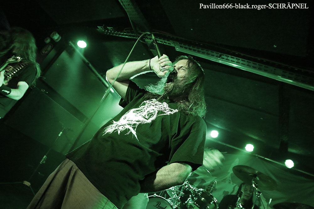 Julien Helwin, vieux briscard de la scène extrême ayant opéré notamment au sein d’Otargos et d’Agressor, s’est entouré de musiciens tenant la route (666) et qui manient avec une certaine virtuosité, accélérations brutes et mélodies empoisonnées. Un set bienvenu dans cette soirée maléfique donc avec en dernier titre une reprise de Sepultura, le fameux ‘troops of doom » qui met tout le monde d’accord.