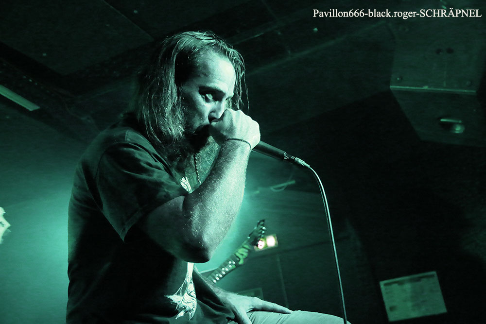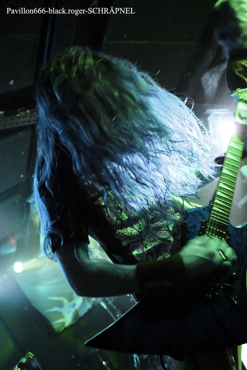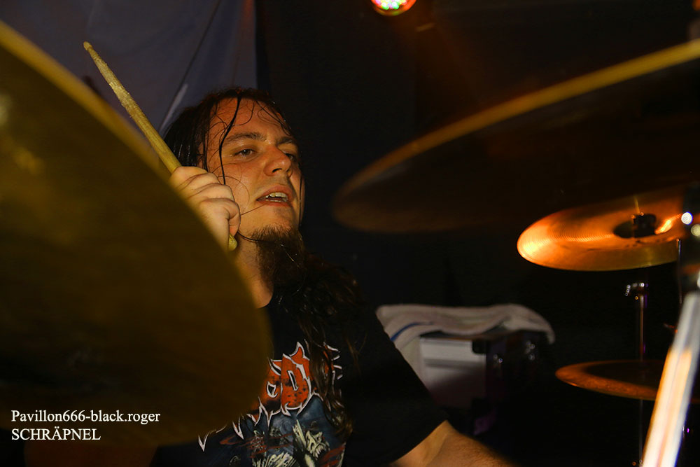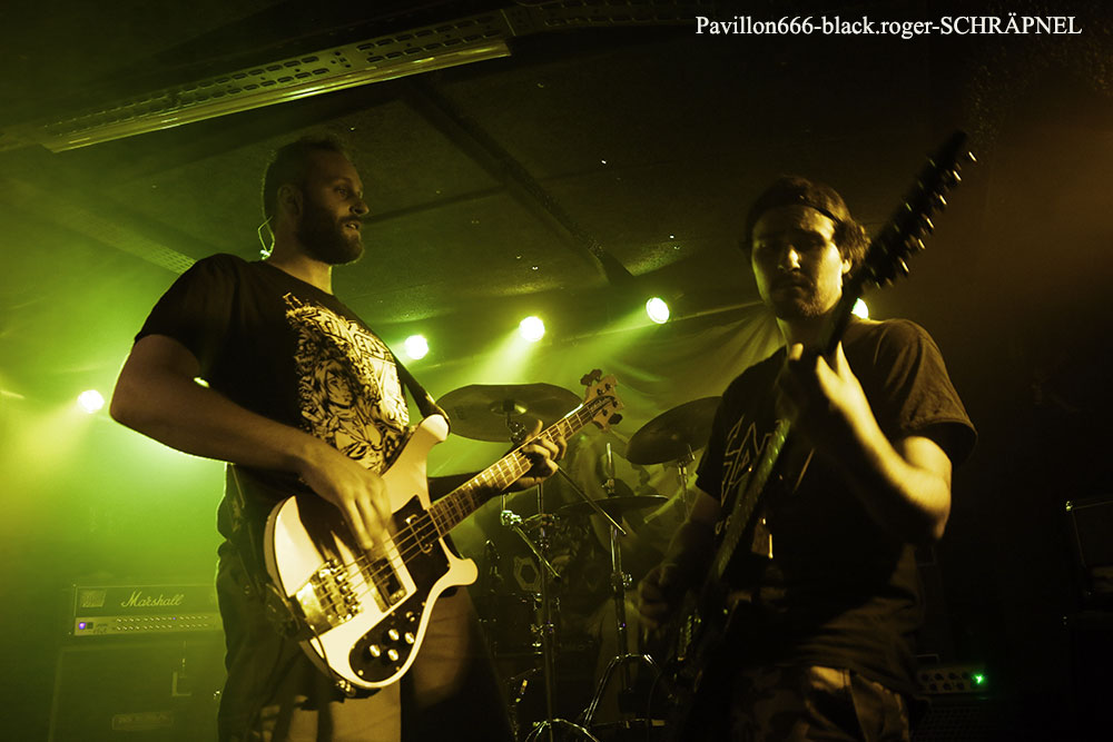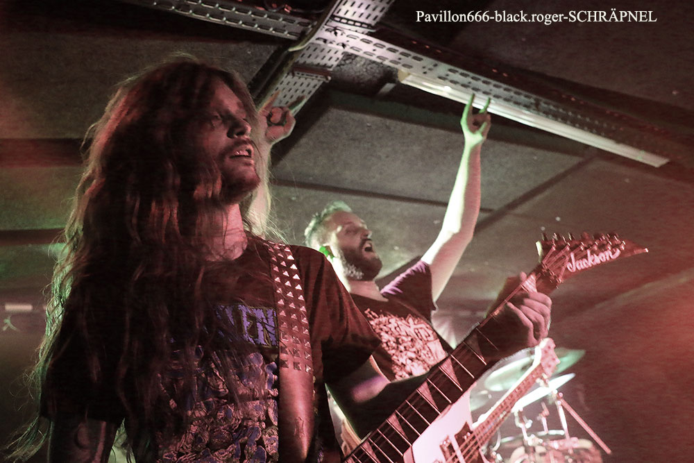 Tout d’abord, il est à peine 21 heures lorsque les Grenoblois de SCHRÄPNEL montent sur les planches afin de nous mettre un direct « in your face » sans compromis, sans faux-semblant. Leur brutal thrash ne fera pas de prisonniers ce soir le public déjà bien chaud ne pouvant s’échapper des lieux, fasciné qu’il est par les brûlots envoyés à bout portant. Car ne vous y trompez pas ce thrash là s’est laissé sodomisé par du death sans foi ni loi.