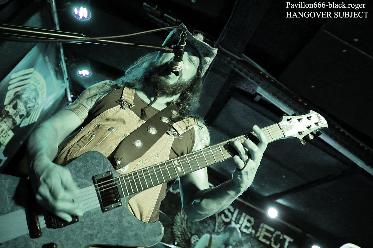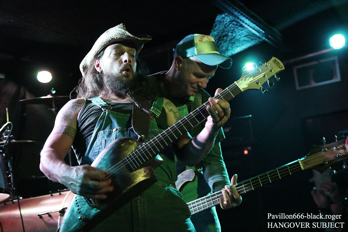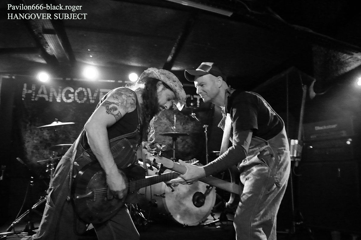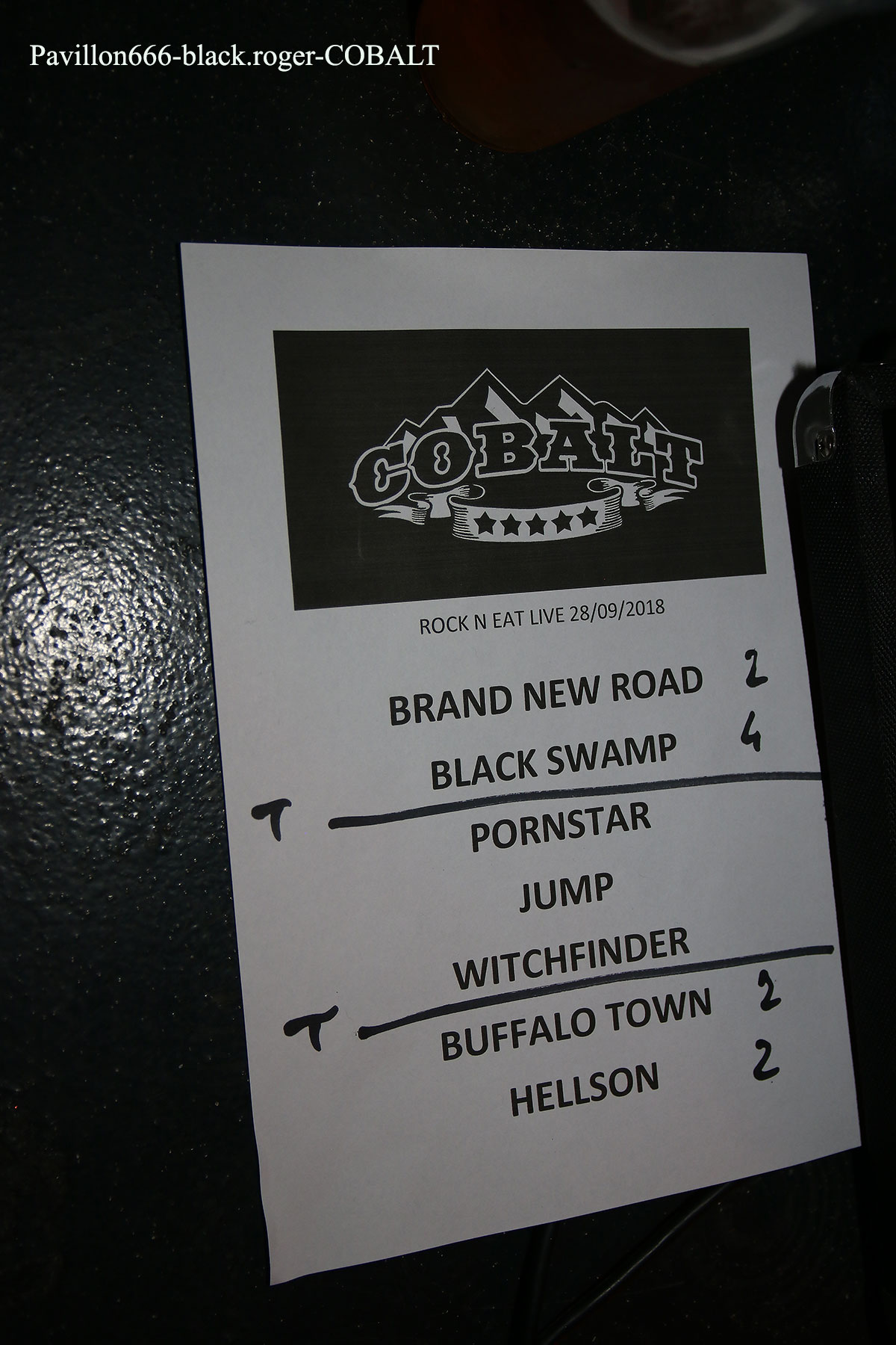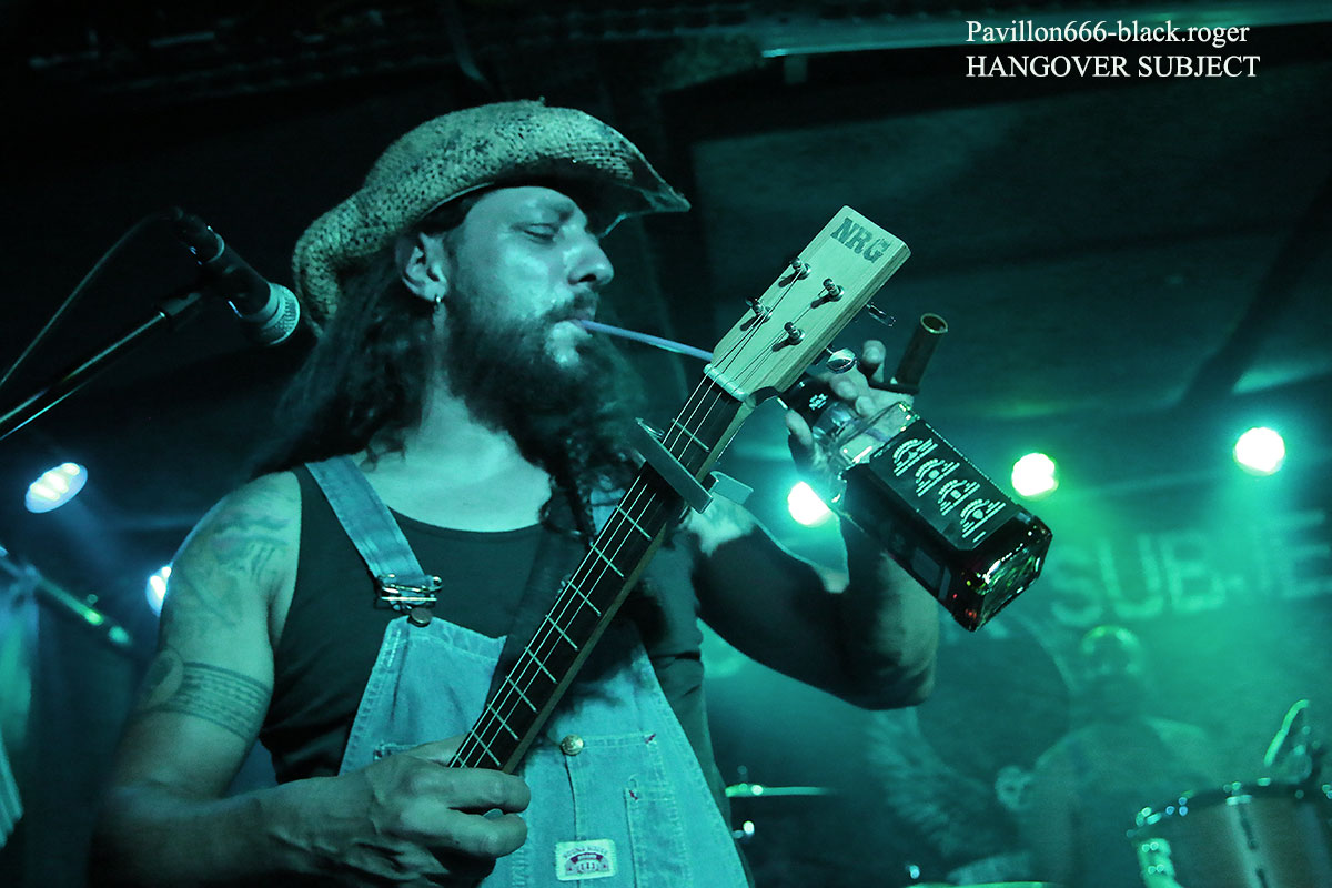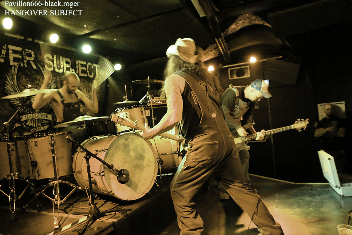 C’est le trio Isérois SUNSHADOWS qui joue en premier, se jouant de l’ombre et de la lumière à l’aide d’un rock inspiré et varié aux déclinaisons indus en fond d’écran. Ce soir c’est la première date d’une nouvelle tournée de présentation de leur EP intitulé « error 99 ». Le son est bon, les compositions remarquées, les musiciens ont le niveau, la voix est « spéciale » rappelant celle de Maynard James Keenan (Tool). Bref leur rock est accrocheur et ne laisse personne indifférent. Avec les Lyonnais de COBALT nous prenons en pleine poire un stoner gras et crasseux qui semble tout droit sorti du bayou de Louisiane ; les vocaux sont râpeux, les soli vicieux, la basse racle par terre et la batterie envoie du lourd et du plombé, génial dans le style donc. Alors « comme on bastards and let’s thrash », c’est leur mot d’ordre et on se laisse emporter, enfumer, désaltérer par du bourbon de contrebande qui vous racle la gorge et vous emprisonne l’esprit. Nous en avons eu pour nos dollars, Cobalt à le niveau, les 5 musiciens ont assuré comme des bêtes et ce fus bon. Par contre nous n’avons pas pu coller les stickers promis sur le corps de nos voisines, pas vus ! Set-list en photo. En provenance de « vers chez nous » voici maintenant le célèbre trio de hardrockin’blues HANGOVER SUBJECT. On ne présente plus ces magiciens du hard-blues au style « fermier » avec à leur actif des instruments parfois bricolés. Ces spécialistes de la « récup », écolos du blues avant l’heure vont littéralement nous prendre à la gorge et nous fasciner avec une prestation hors-norme, top niveau (pas topless). Incroyable compositions, incroyable présence scénique où l’on boit le « jack » à la paille et où l’on communique sans barrière avec un public qui adhère pleinement à leur son et qui s’agite contre la scène enfin. Chanteur à la voix rocailleuse qui change de guitare bien souvent, bassiste « en communion » avec les autres membres du trio et batteur inspiré mais implacable sur les tempi. Trois passionnés donc au service du rock tout simplement, le vrai, celui qui vous prend aux tripes. Au coin de la scène une valise ouverte tout simplement avec leurs trois albums à votre disposition, pas de « chichis ». Simplicité, efficacité, générosité, sont les maîtres mots du trio un trio qui se déguste en live comme ce soir dans un Rock n’Eat sous l’emprise du hard-blues. Quelqu’un a dit à leur propos « groupe au -dessus du lot », et c’est bien vrai, merci les gars vous revenez quand vous voulez ! Tout simplement un grand merci en guise de conclusion. Merci aux trois groupes en lice, merci au Rock n’Eat et merci au public pour l’ambiance. |
