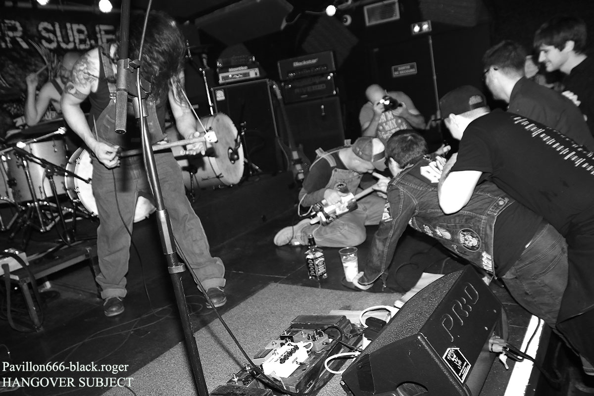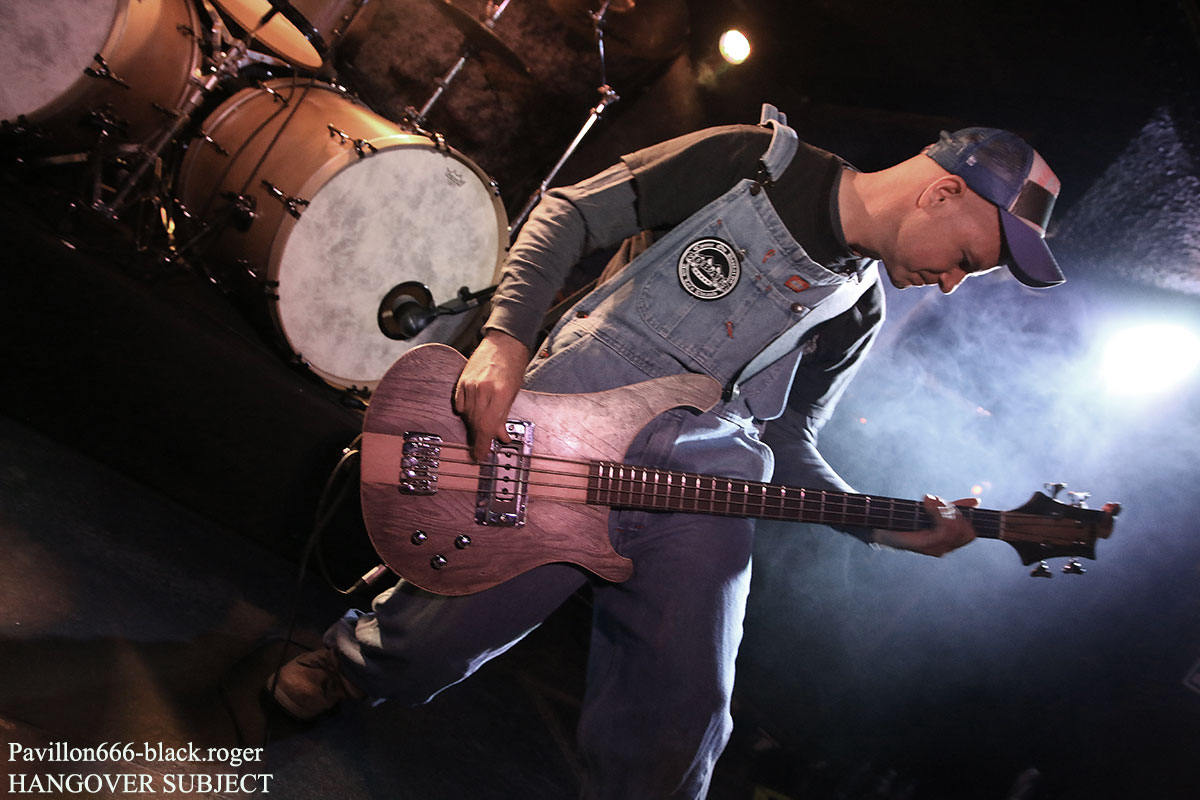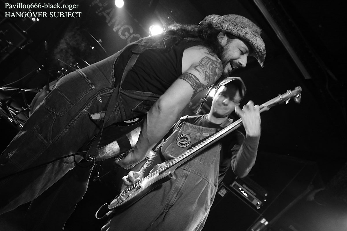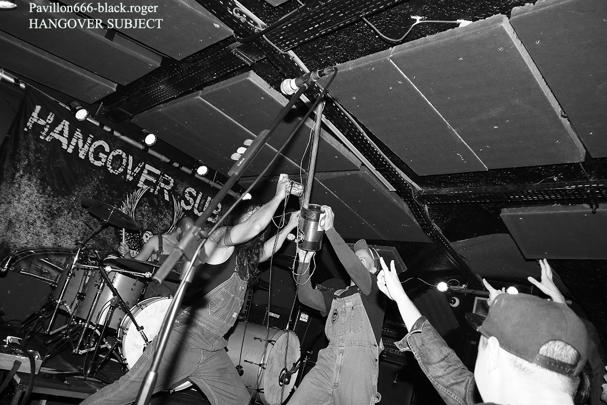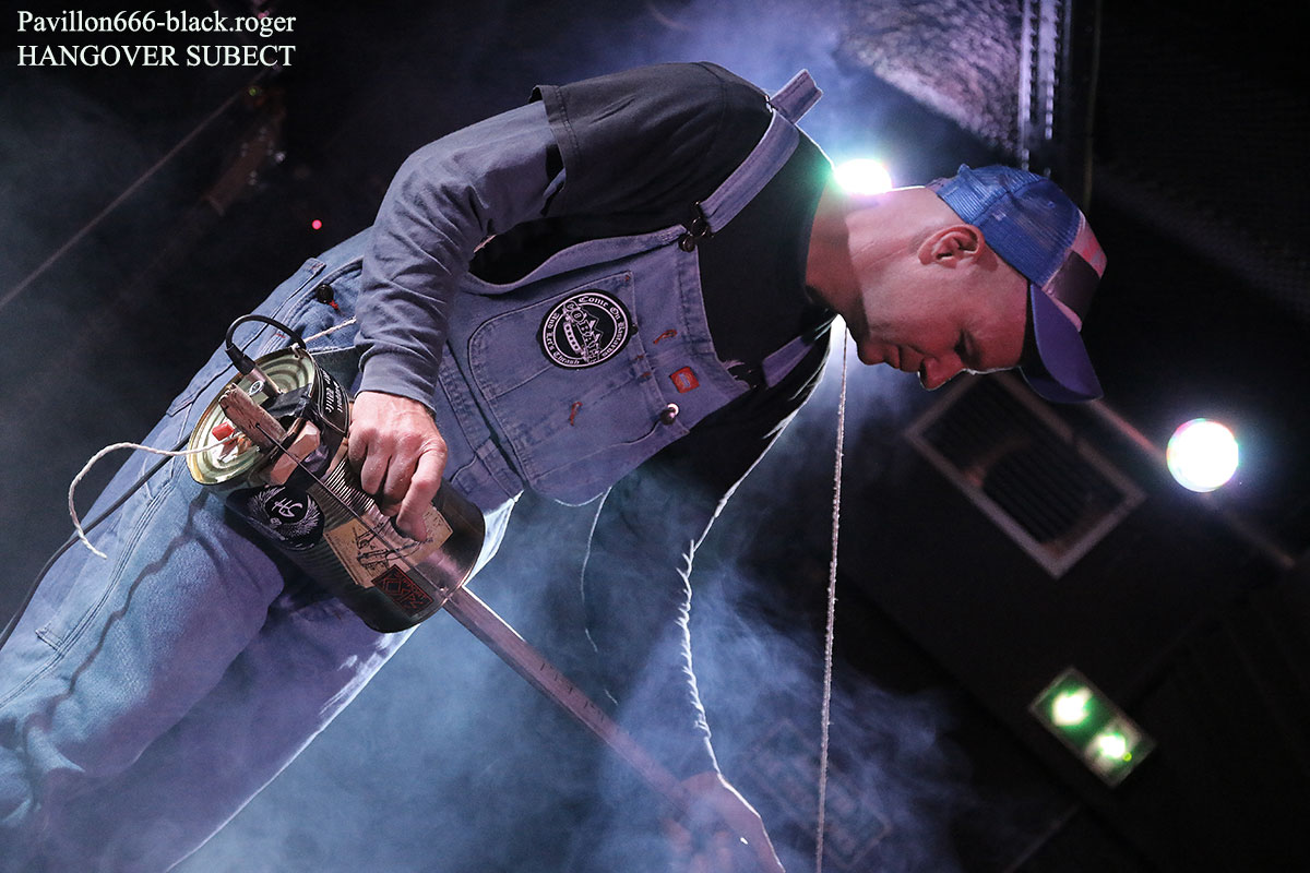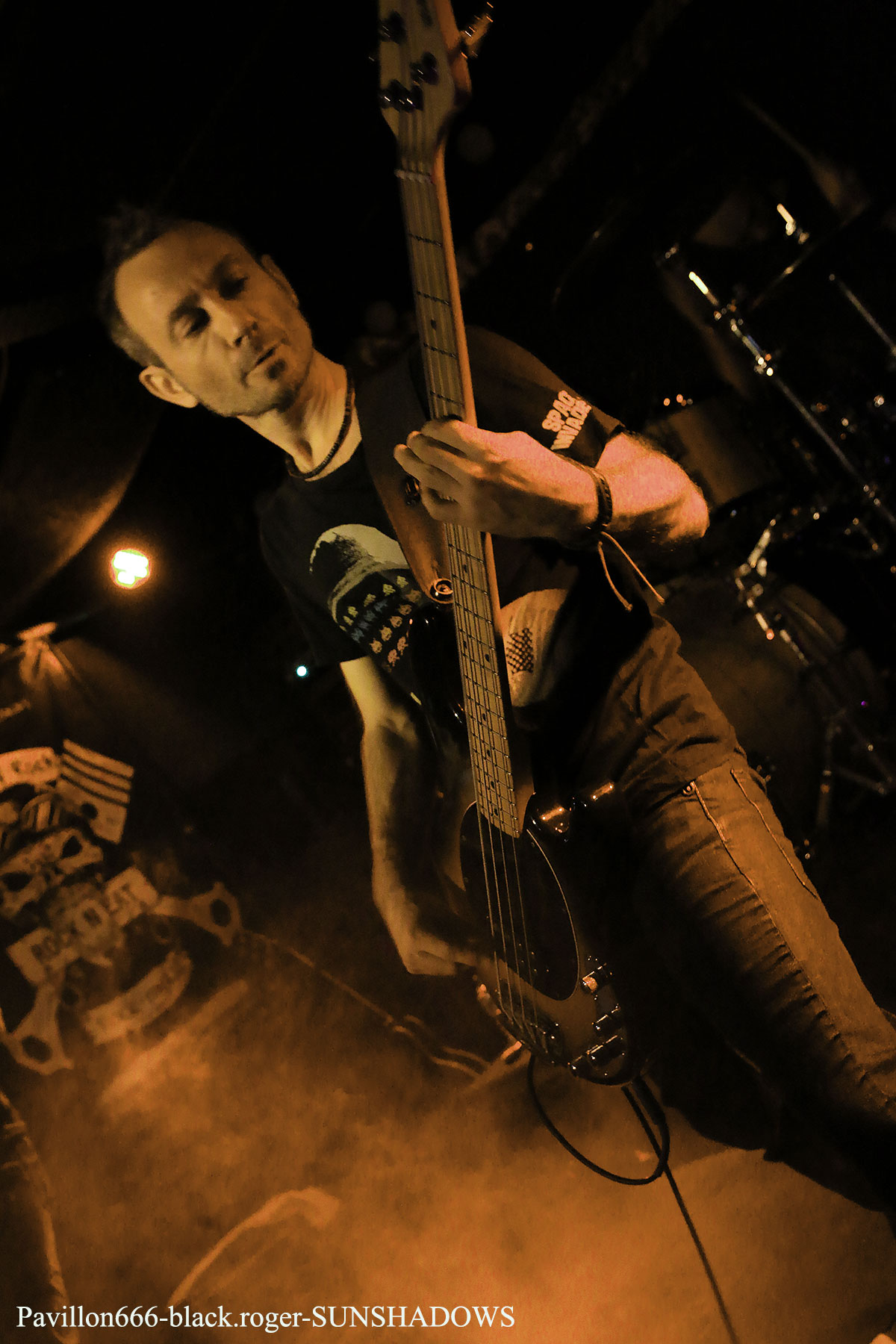 C’est le trio Isérois SUNSHADOWS qui joue en premier, se jouant de l’ombre et de la lumière à l’aide d’un rock inspiré et varié aux déclinaisons indus en fond d’écran. Ce soir c’est la première date d’une nouvelle tournée de présentation de leur EP intitulé « error 99 ». Le son est bon, les compositions remarquées, les musiciens ont le niveau, la voix est « spéciale » rappelant celle de Maynard James Keenan (Tool). Bref leur rock est accrocheur et ne laisse personne indifférent. Avec les Lyonnais de COBALT nous prenons en pleine poire un stoner gras et crasseux qui semble tout droit sorti du bayou de Louisiane ; les vocaux sont râpeux, les soli vicieux, la basse racle par terre et la batterie envoie du lourd et du plombé, génial dans le style donc. Alors « comme on bastards and let’s thrash », c’est leur mot d’ordre et on se laisse emporter, enfumer, désaltérer par du bourbon de contrebande qui vous racle la gorge et vous emprisonne l’esprit. Nous en avons eu pour nos dollars, Cobalt à le niveau, les 5 musiciens ont assuré comme des bêtes et ce fus bon. Par contre nous n’avons pas pu coller les stickers promis sur le corps de nos voisines, pas vus ! Set-list en photo. En provenance de « vers chez nous » voici maintenant le célèbre trio de hardrockin’blues HANGOVER SUBJECT. On ne présente plus ces magiciens du hard-blues au style « fermier » avec à leur actif des instruments parfois bricolés. Ces spécialistes de la « récup », écolos du blues avant l’heure vont littéralement nous prendre à la gorge et nous fasciner avec une prestation hors-norme, top niveau (pas topless). Incroyable compositions, incroyable présence scénique où l’on boit le « jack » à la paille et où l’on communique sans barrière avec un public qui adhère pleinement à leur son et qui s’agite contre la scène enfin. Chanteur à la voix rocailleuse qui change de guitare bien souvent, bassiste « en communion » avec les autres membres du trio et batteur inspiré mais implacable sur les tempi. Trois passionnés donc au service du rock tout simplement, le vrai, celui qui vous prend aux tripes. Au coin de la scène une valise ouverte tout simplement avec leurs trois albums à votre disposition, pas de « chichis ». Simplicité, efficacité, générosité, sont les maîtres mots du trio un trio qui se déguste en live comme ce soir dans un Rock n’Eat sous l’emprise du hard-blues. Quelqu’un a dit à leur propos « groupe au -dessus du lot », et c’est bien vrai, merci les gars vous revenez quand vous voulez ! Tout simplement un grand merci en guise de conclusion. Merci aux trois groupes en lice, merci au Rock n’Eat et merci au public pour l’ambiance. |