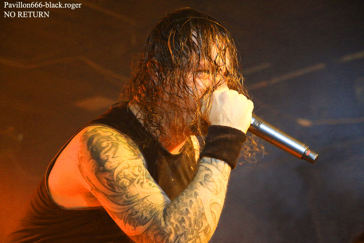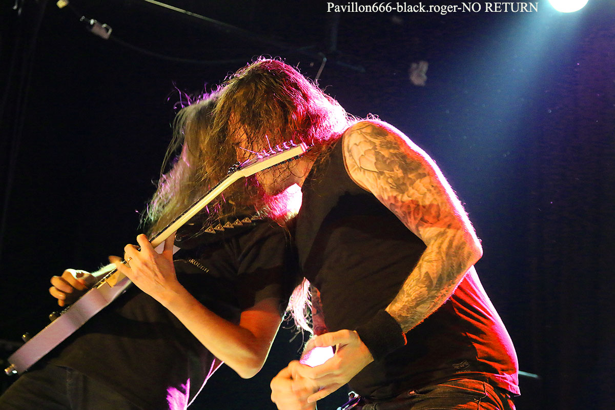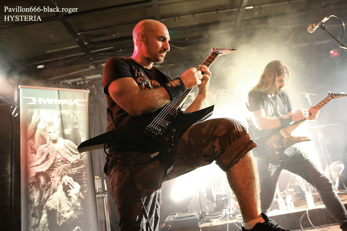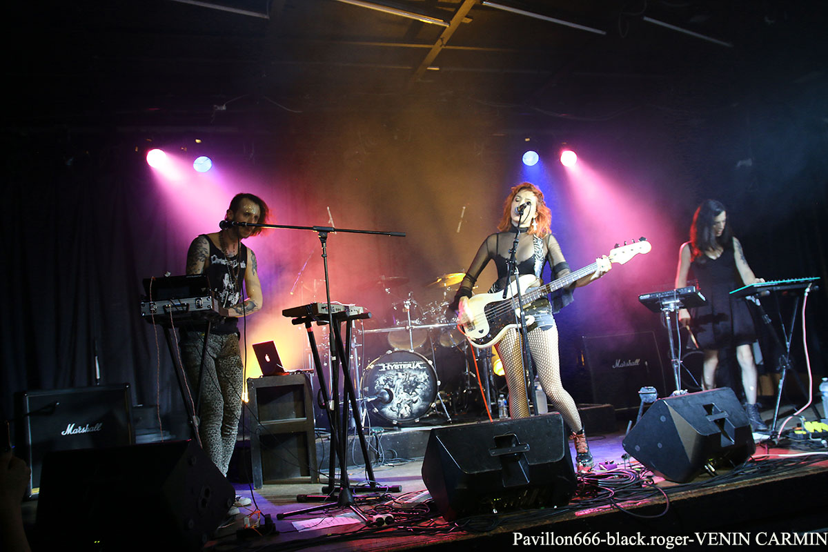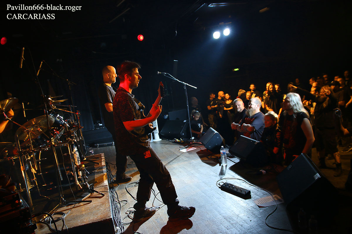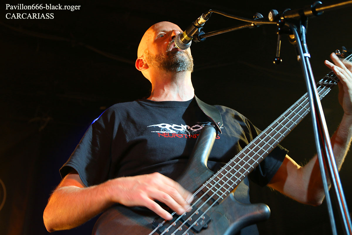Black.Roger et Der Lehrer de votre webzine préféré se sont donc rendu sur les lieux afin de vous conter par la rubrique et les photos ce week-end pas comme les autres. Voici donc tout d’abord le compte-rendu du Samedi 13 Octobre, bonne lecture ! BUG (par Roger). Avec un léger retard dû à des ennuis techniques, BUG monte sur scène dès 15heures 20 avec la ferme intention d’ouvrir le festival à l’aide de bon son rockcore (si,si, ça existe) et stoner à l’occasion propulsé avec brio par Jérémy, Luc, Frantz, et Thomas. Depuis quelques années déjà (2013) le quatuor n’a pas « bugé » et fait parler de lui dans le secteur Rhône-Alpes, et ce soir ils se lâchent pleinement afin de débuter ce premier Dark breath Fest avec un certain professionnalisme, rock tout simplement, bravo les gars vous avez assuré ! EAST (par Roger). Panachage oblige, c’est EAST de Lyon qui nous propose maintenant sa dérive cold-wave venant de l’Est (pléonasme ?). Le trio manie avec dextérité une certaine nostalgie aux penchants Gothic pourquoi pas ! C’est froid comme un hiver en voie de disparition et chaud comme un beat électro. Après « hula hoop » un nouvel EP arrive incessamment sous peu, alors si vous voulez aller plus loin avec eux, suivez-les ils le méritent. En attendant ils nous ont convaincu aujourd’hui sur la grande scène de la MJC de Bourg-en-Bresse. HYSTERIA (par Jean) Il est 17h 30, lorsque les Lyonnais de HYSTERIA entament leur set sur la scène de la MJC de Bourg-en-Bresse devant un public attentif et curieux à la fois, nettement plus nombreux qu'en début d'après-midi. Ce quatuor a derrière lui plus de vingt ans d'expérience, de multiples concerts et festivals, trois albums à son actif, bref un groupe solide au line-up stable. HYSTERIA pratique un black-death metal authentique et sans concession, on a pu les voir en tournée en France, au Sylak Open Air et au défunt RRF, non loin d'ici. Ils ont un lien particulier avec notre département, l'un des leurs y réside, ADIPOCERE, organisateur de l'événement, est domicilié à Bourg. Sylvain, le chanteur, a la voix qui convient, profonde, puissante et grave, il est efficacement entouré de Jérôme à la guitare, Adrien (nouveau venu) à la basse, et bien entendu Xavier, le batteur de haut niveau que chacun connaît. Le set comprend des morceaux issus du premier album, d'autres plus récents, tous appréciés par un public qui essaie de « bouger » devant la grande scène, esquisses de pogo, headbanging, de jeunes enfants munis de casques tentent de suivre le rythme sous l'oeil de leurs parents – futurs métalleux ? L'ambiance est là, c'est l'essentiel, les gens aiment ce côté sauvage, à la fois sombre et viril. Un bref solo de batterie, et la prestation d'HYSTERIA arrive à son terme, sous les applaudissements nourris d'un public ravi. On se souviendra de ces 45 minutes trop vite passées… VENIIN CARMIN (par Roger). Après le metal brutal d’Hysteria voici de la dark/new wave avec un trio venu de Lyon, VENIN CARMIN avec Lula, François, Valentine. Comment décrire leur prestation ? C’est un rouge baiser qui vous ensorcèle à l’aide de compositions acidulées sur des tempi prononcés et alourdis par une basse omniprésente (et une bassiste attirante). Deux machines en duo ou duel (c’est comme vous voulez !), un chant pétillant comme du champagne vous emmène dans cet univers gothico/glam/dark à paillettes et ne vous lâche plus ? Le show fut chaud, l’ambiance torride, que demander de plus, je ne vous fais pas un dessin. CARCARIASS (par Jean). Ce groupe originaire de Besançon a déjà une longue histoire derrière lui. Il a vu le jour en 1991, il a connu ensuite une traversée du désert de plusieurs années avant de faire à nouveau parler de lui pour le plus grand plaisir de ses fans, nombreux ici, ce soir. Certains m'ont affirmé avoir parcouru 300 km pour voir et entendre les Bisontins. Le trio francomtois, Raphaël à la basse et au chant, Pascal à la guitare et Bertrand à la batterie, n'ont plus vingt ans, mais jouent avec un enthousiasme communicatif. On est franchement heureux pour ces trois artistes qui donnent tout ce soir, au DBF de Bourg-en-Bresse. N'oublions pas qu'ils jouent dans la cour des grands, qu'ils ont participé au Hellfest 2017 notamment, qu'ils sont proches de LOUDBLAST et BENIGHTED, entre autres. Technique, progressif ou mélodique, voire heavy, instrumental, peu importe les appellations, ainsi CARCARIASS plaît à un large spectre d'amateurs de metal. Et surtout ne leur demandez pas de quoi traitent leurs textes ! Ni politique, ni religion, c'est clair… Batterie hyperpuissante, voix inimitable, riffs redoutables, comme un rouleau compresseur, c'est cela, CARCARIASS. « Quelle maîtrise, pour leur âge ! », expression entendue au fond de la salle, qui résume bien le spectacle, le cadeau, offert par les Bisontins aux Bressans et aux autres...Et ce qui ne gâte rien, un frontman, Raph, un homme chaleureux et plein d'humour. Leur prestation inoubliable aura duré 50 minutes. Un rappel ? Non. Dommage. NO RETURN (par Jean). A partir de 22 heures et pour plus d'une heure, le groupe de thrash connu depuis près de trente ans dans l'ensemble de l'hexagone et au-delà, à savoir NO RETURN, aura la lourde tâche et l'honneur de retenir dans la salle les spectateurs qui ont tendance, à cette heure tardive, à quitter la MJC. Par ces nombreuses adresses au public, Mick le chanteur charismatique, comme on dit un peu facilement, réussira à tenir les fans de death-thrash en haleine jusqu' à la fin du concert. Il convient de présenter la formation, fondée en 1989 dans le Val d'Oise, qui a subi de profonds remaniements. Le line-up actuel du quintette comprend Joël Barbosa à la batterie, son frère David à la basse, Alain Clément et Geoffroy Lebon à la guitare, et depuis 2013, Mick au chant. NO RETURN a joué au Hellfest, au Summer Breeze en Allemagne, pays où 