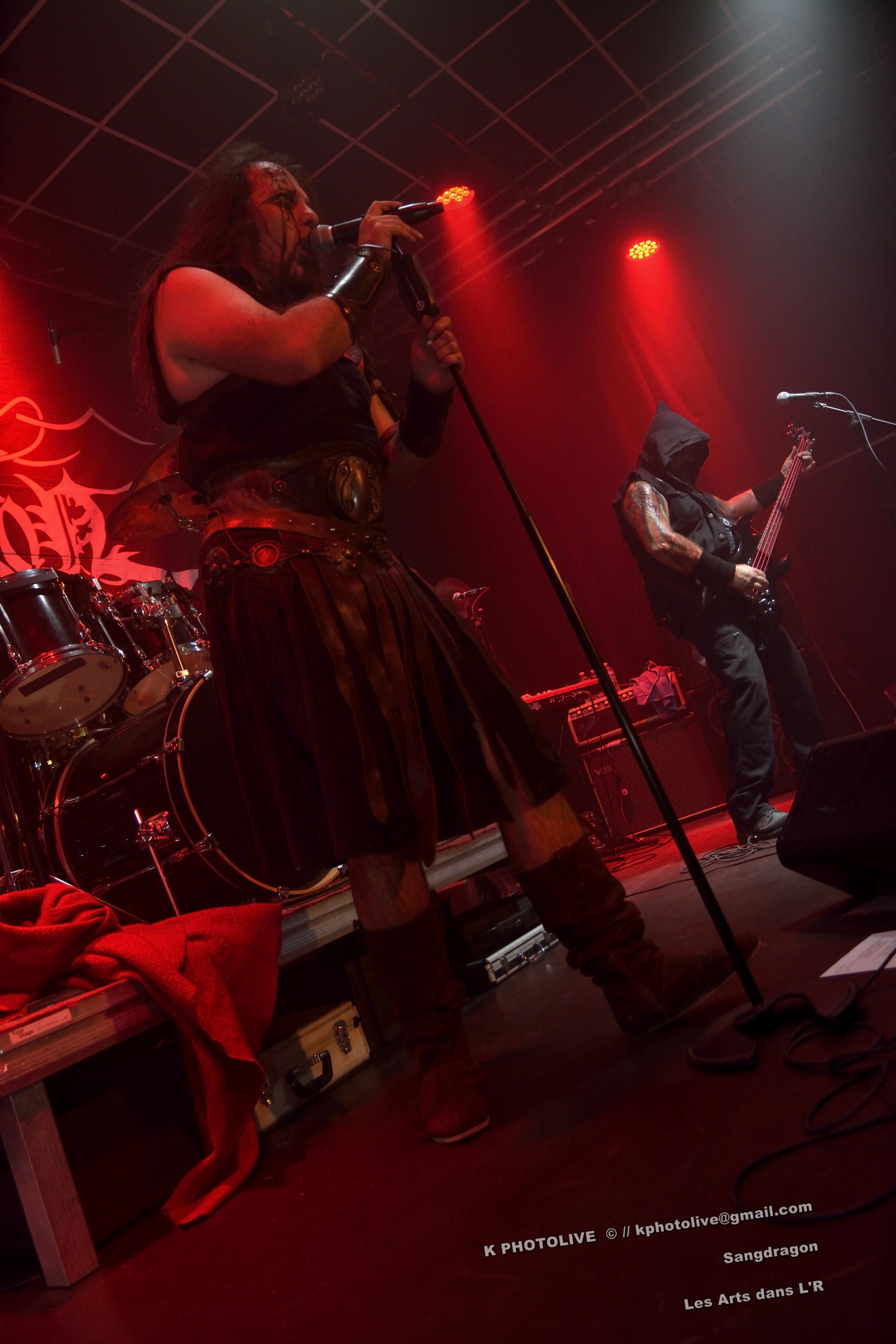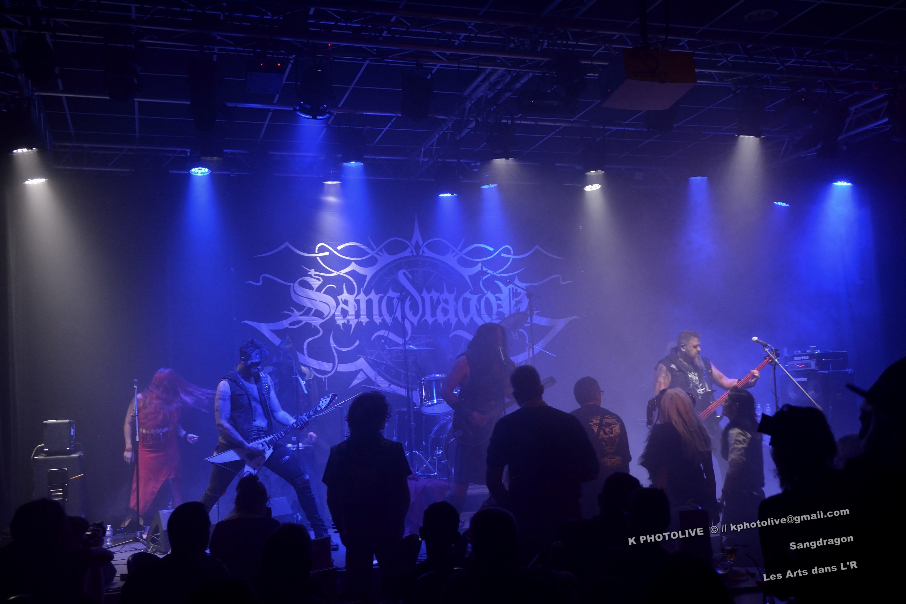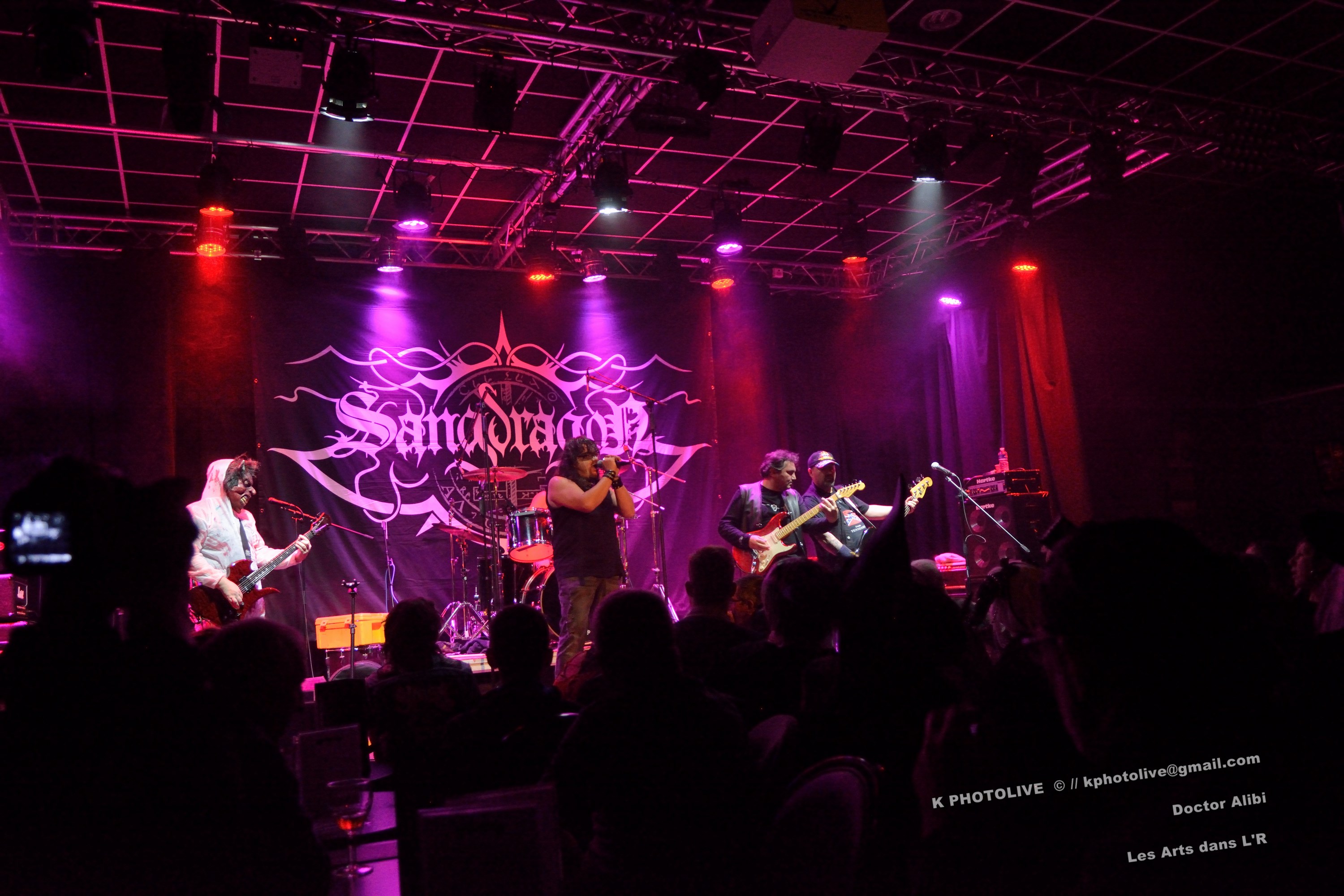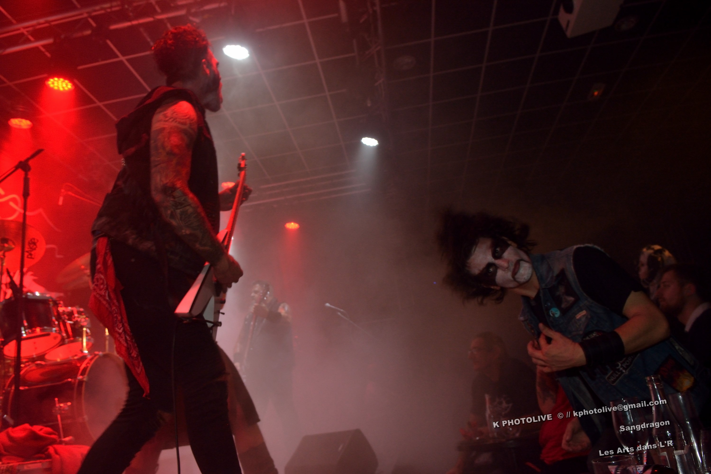 DOCTOR ALIBI est un groupe de reprises, un « coverband » né en 2015-2016, comme disent les initiés, des passionnés de hard-rock, le premier étant l'infatigable Christophe Ginet, chanteur, bien connu du côté de Leyment, entouré de ses quatre acolytes, des artistes qui ont dépassé le stade de l'adolescence, dotés d'un indéniable talent, à savoir Manu (batteur), Christophe (bassiste), Greg et Christian (guitaristes). Ils font revivre MOTÖRHEAD et l'emblématique Lemmy à travers plusieurs titres, interprètent quelques chansons des Américains NASHVILLE PUSSY (avec « Why ? 1,2,3…, par exemple), et MARILYN MANSON notamment. Tous les présents, la fourchette ou le verre à la main, s'attendaient-ils à voir et à entendre un tel spectacle en cette soirée Halloween ? Pas sûr. Quoi qu'il en soit, le quintette DOCTOR ALIBI, dans un nuage de fumée, a été chaleureusement applaudi par un public convaincu et ravi de ce set de trente minutes. (set-list en photo) Changement de plateau, mouvement dans la salle...bientôt le dessert ! Vers 21 heures 45, la musique -une autre musique !- retentit, accompagnée d'un « Sanctus ! Dominus ! » qui sonne comme venant d'outre-tombe. SANGDRAGON va jouer pendant une heure et quart son répertoire complet, des morceaux des débuts, d'autres plus récents. Mais il convient de présenter brièvement cette formation à sept têtes, qui rayonne dans la Bourgogne du Sud, la Saône-et-Loire en particulier et Mâcon avant tout, où des musiciens bien inspirés ont fondé SANGDRAGON , un groupe original, vers 2011, sur les cendres de Daemonium et Akhenaton. Les trois artisans à l'origine de la réussite de SANGDRAGON, Vincent Urbain (chant et instruments folkloriques), Will Hien (basse et chant) et Matt Asselberghs (guitare) ont été rejoints depuis 2015 par Edouard Verneret (claviers), Cynthia Marciniak (voix claire et choeurs), Denis Josserand alias Mad Joss (percussions et choeurs) et plus récemment par Paul Sordet (batterie), rapidement devenu indispensable. Les tenues médiévales, capuches et autres costumes, les épées brandies par Vincent, attirent l'attention des spectateurs, presqu'autant que le son et les mélodies, un vrai show, pour les yeux et pour les oreilles. La musique des Bourguignons s'inscrit dans la catégorie death-black symphonique et médiéval avec choeurs. Cet « équipage » génère une atmosphère de mysticisme ésotérique qu'on imagine aisément dans une cathédrale. Les voix -graves, rauques, gutturales-, les instruments, les choeurs -et le talent !-font de SANGDRAGON une formation atypique qui n'a pas de mal à plonger auditeurs et spectateurs, les yeux fermés, dans un univers magique, sorte de monde des ténèbres et, il faut le dire, d'une réelle beauté. Pas de temps mort, des chansons variées, rien de linéaire ou de répétitif, la preuve : le public est conquis, les gens se lèvent, applaudissent, tentent de « bouger » entre les tables et les chaises, frappent des mains... Pas de conflit de générations entre ces colosses que sont Vincent et Will, impressionnants sur le devant de la scène, dont l'expérience saute aux yeux, et Matt, lui aussi imposant, d'une part, et Paul, discret et tellement efficace derrière ses fûts, d'autre part, entourés de Cynthia, Denis et Edouard, déjà cités, sans qui SANGDRAGON ne serait qu'un groupe de metal classique. Un bref répit et on embraye sur un genre plus nuancé d'où ressortent nettement les claviers et les percussions, et sans préavis tout s'emballe, Matt bondit dans la salle pour quelques secondes, on s'achemine vers un beau final, une sorte d'apothéose, avec des titres comme « Final Battle » (Akhenaton) et « Game Of Thrones (Cover). Un rappel s'impose, on entendra alors « The Serpent's Wheel », une chanson de THE SEVEN GATES, ancien groupe de Vincent. « Bravo et merci ! » Les gens sont heureux, beaucoup ont découvert une musique, un style, des artistes authentiques...qui eux-mêmes sont en droit d'être fiers de leur prestation, différente de celles auxquelles on a pu assister dans certains concerts. Configuration particulière, on imagine sans peine ce qu'aurait été un »concert debout », mais n'ayons pas trop de regrets, nous étions comme au théâtre, assis. Et nous avons assisté à une belle pièce. Il convient d'adresser un grand merci à ceux et celles qui ont assuré la réussite de cette soirée « pas comme les autres », les musiciens, les bénévoles, le public, et bien sûr, le maître des lieux, Raphaël. |