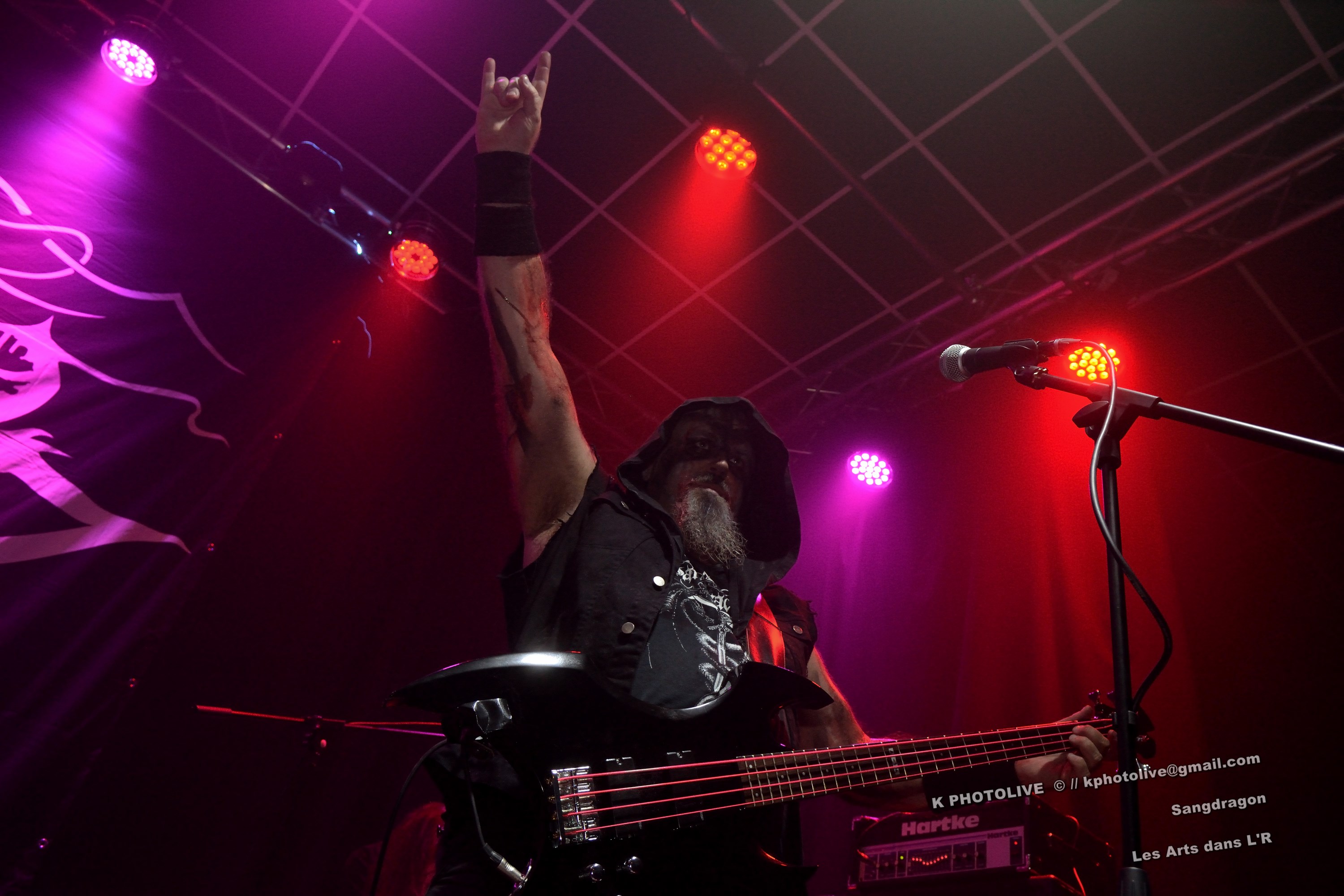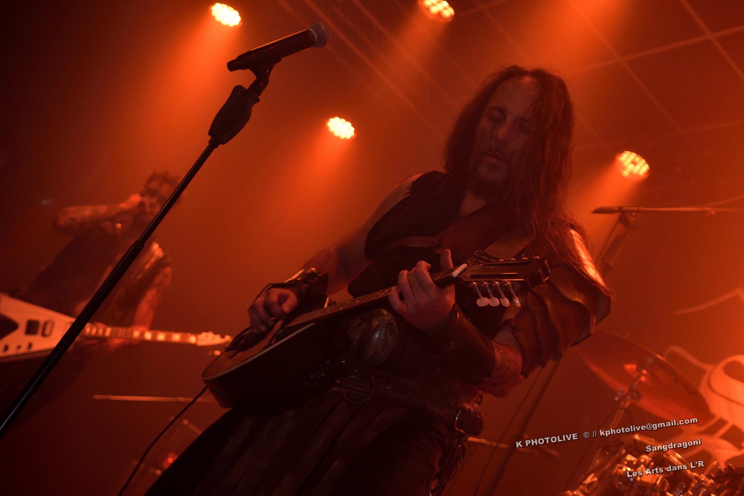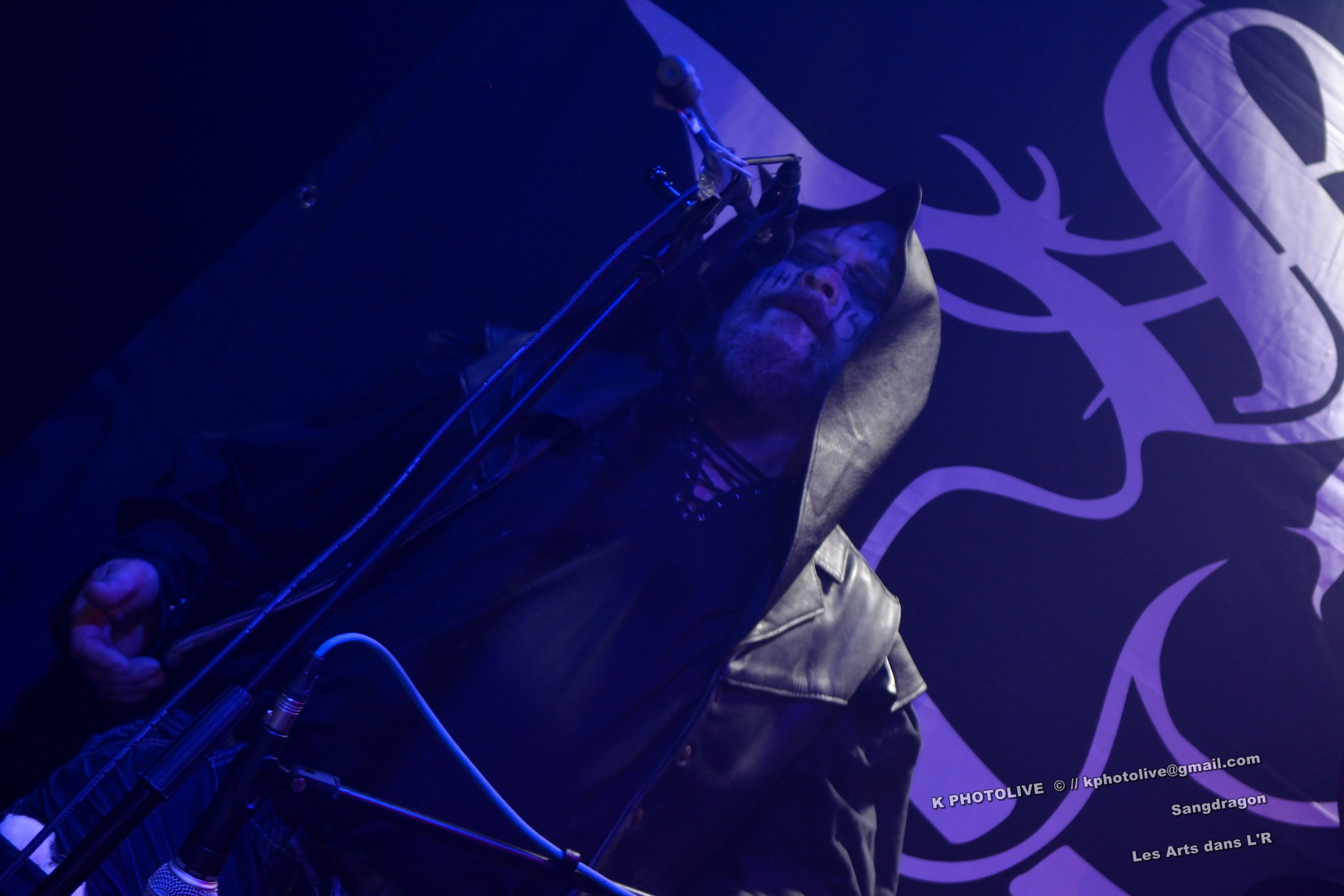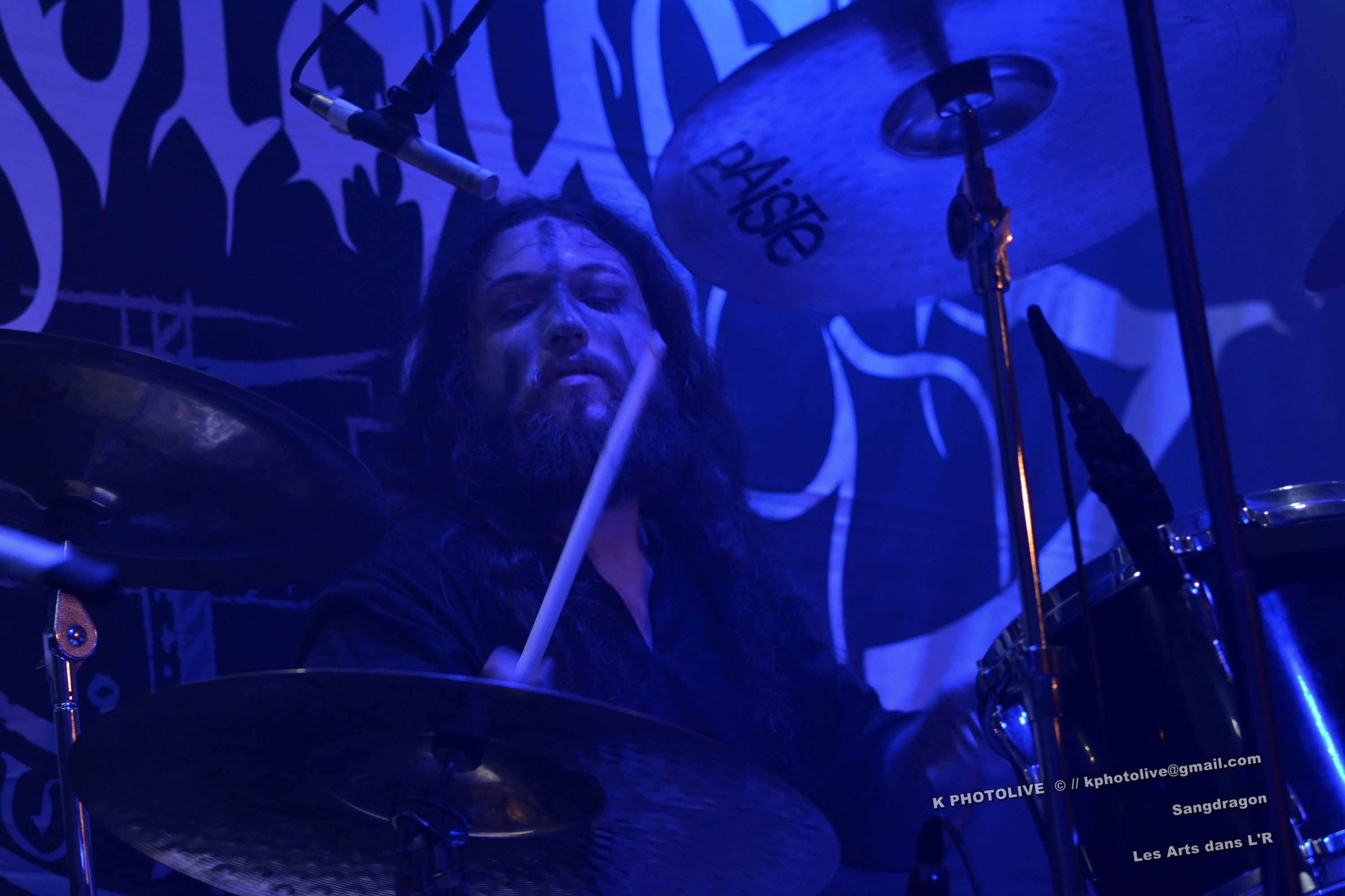 DOCTOR ALIBI est un groupe de reprises, un « coverband » né en 2015-2016, comme disent les initiés, des passionnés de hard-rock, le premier étant l'infatigable Christophe Ginet, chanteur, bien connu du côté de Leyment, entouré de ses quatre acolytes, des artistes qui ont dépassé le stade de l'adolescence, dotés d'un indéniable talent, à savoir Manu (batteur), Christophe (bassiste), Greg et Christian (guitaristes). Ils font revivre MOTÖRHEAD et l'emblématique Lemmy à travers plusieurs titres, interprètent quelques chansons des Américains NASHVILLE PUSSY (avec « Why ? 1,2,3…, par exemple), et MARILYN MANSON notamment. Tous les présents, la fourchette ou le verre à la main, s'attendaient-ils à voir et à entendre un tel spectacle en cette soirée Halloween ? Pas sûr. Quoi qu'il en soit, le quintette DOCTOR ALIBI, dans un nuage de fumée, a été chaleureusement applaudi par un public convaincu et ravi de ce set de trente minutes. (set-list en photo) Changement de plateau, mouvement dans la salle...bientôt le dessert ! Vers 21 heures 45, la musique -une autre musique !- retentit, accompagnée d'un « Sanctus ! Dominus ! » qui sonne comme venant d'outre-tombe. SANGDRAGON va jouer pendant une heure et quart son répertoire complet, des morceaux des débuts, d'autres plus récents. Mais il convient de présenter brièvement cette formation à sept têtes, qui rayonne dans la Bourgogne du Sud, la Saône-et-Loire en particulier et Mâcon avant tout, où des musiciens bien inspirés ont fondé SANGDRAGON , un groupe original, vers 2011, sur les cendres de Daemonium et Akhenaton. Les trois artisans à l'origine de la réussite de SANGDRAGON, Vincent Urbain (chant et instruments folkloriques), Will Hien (basse et chant) et Matt Asselberghs (guitare) ont été rejoints depuis 2015 par Edouard Verneret (claviers), Cynthia Marciniak (voix claire et choeurs), Denis Josserand alias Mad Joss (percussions et choeurs) et plus récemment par Paul Sordet (batterie), rapidement devenu indispensable. Les tenues médiévales, capuches et autres costumes, les épées brandies par Vincent, attirent l'attention des spectateurs, presqu'autant que le son et les mélodies, un vrai show, pour les yeux et pour les oreilles. La musique des Bourguignons s'inscrit dans la catégorie death-black symphonique et médiéval avec choeurs. Cet « équipage » génère une atmosphère de mysticisme ésotérique qu'on imagine aisément dans une cathédrale. Les voix -graves, rauques, gutturales-, les instruments, les choeurs -et le talent !-font de SANGDRAGON une formation atypique qui n'a pas de mal à plonger auditeurs et spectateurs, les yeux fermés, dans un univers magique, sorte de monde des ténèbres et, il faut le dire, d'une réelle beauté. Pas de temps mort, des chansons variées, rien de linéaire ou de répétitif, la preuve : le public est conquis, les gens se lèvent, applaudissent, tentent de « bouger » entre les tables et les chaises, frappent des mains... Pas de conflit de générations entre ces colosses que sont Vincent et Will, impressionnants sur le devant de la scène, dont l'expérience saute aux yeux, et Matt, lui aussi imposant, d'une part, et Paul, discret et tellement efficace derrière ses fûts, d'autre part, entourés de Cynthia, Denis et Edouard, déjà cités, sans qui SANGDRAGON ne serait qu'un groupe de metal classique. Un bref répit et on embraye sur un genre plus nuancé d'où ressortent nettement les claviers et les percussions, et sans préavis tout s'emballe, Matt bondit dans la salle pour quelques secondes, on s'achemine vers un beau final, une sorte d'apothéose, avec des titres comme « Final Battle » (Akhenaton) et « Game Of Thrones (Cover). Un rappel s'impose, on entendra alors « The Serpent's Wheel », une chanson de THE SEVEN GATES, ancien groupe de Vincent. « Bravo et merci ! » Les gens sont heureux, beaucoup ont découvert une musique, un style, des artistes authentiques...qui eux-mêmes sont en droit d'être fiers de leur prestation, différente de celles auxquelles on a pu assister dans certains concerts. Configuration particulière, on imagine sans peine ce qu'aurait été un »concert debout », mais n'ayons pas trop de regrets, nous étions comme au théâtre, assis. Et nous avons assisté à une belle pièce. Il convient d'adresser un grand merci à ceux et celles qui ont assuré la réussite de cette soirée « pas comme les autres », les musiciens, les bénévoles, le public, et bien sûr, le maître des lieux, Raphaël. |