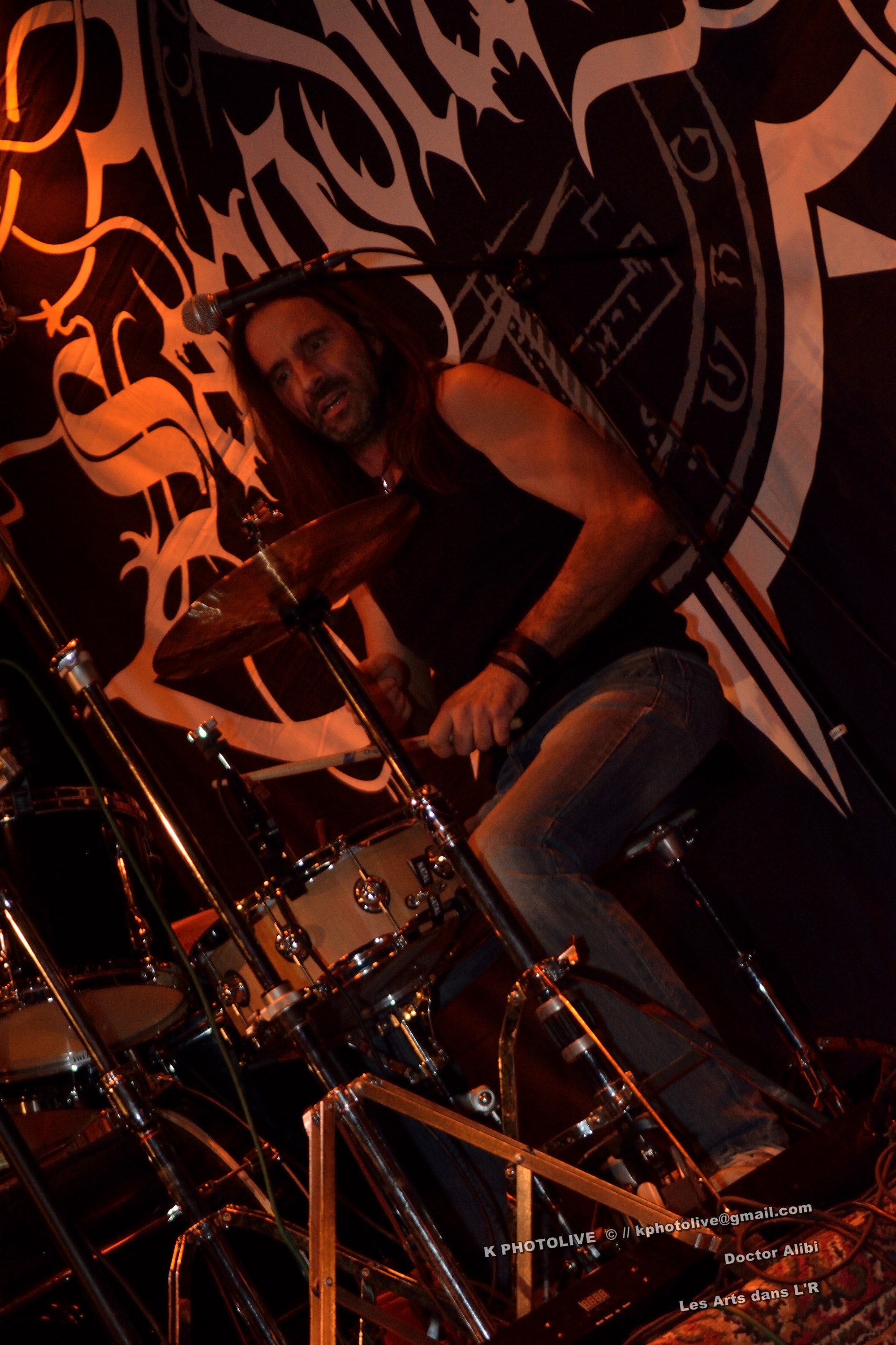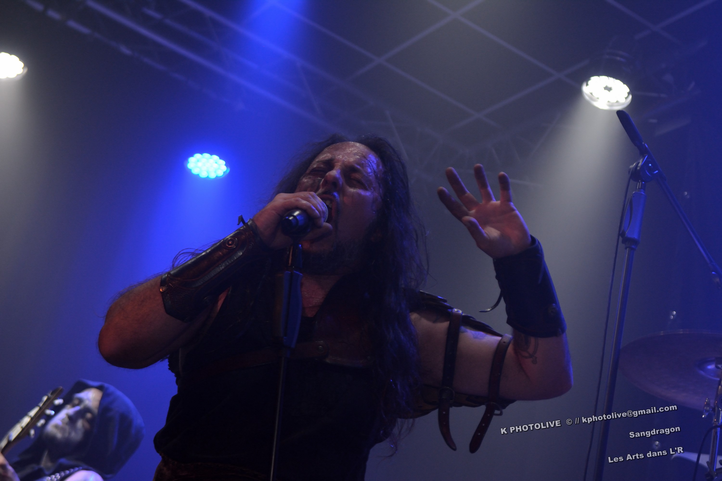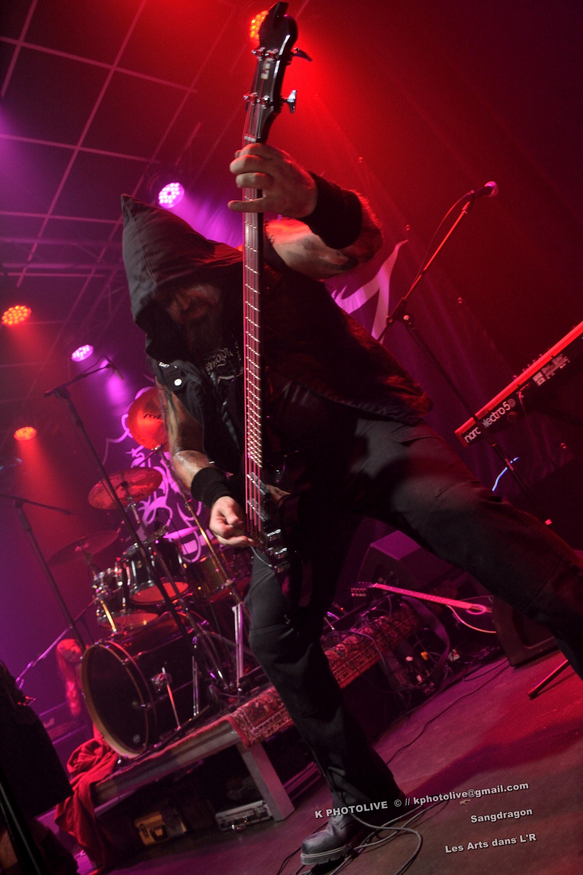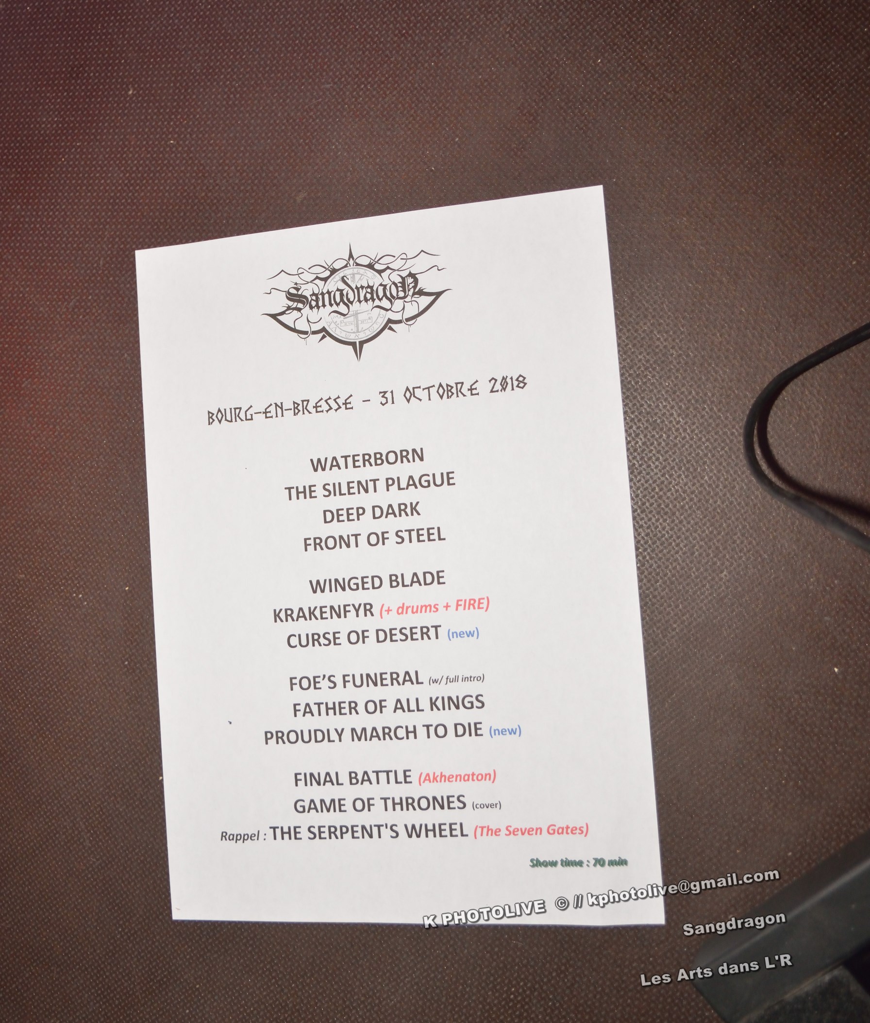 DOCTOR ALIBI est un groupe de reprises, un « coverband » né en 2015-2016, comme disent les initiés, des passionnés de hard-rock, le premier étant l'infatigable Christophe Ginet, chanteur, bien connu du côté de Leyment, entouré de ses quatre acolytes, des artistes qui ont dépassé le stade de l'adolescence, dotés d'un indéniable talent, à savoir Manu (batteur), Christophe (bassiste), Greg et Christian (guitaristes). Ils font revivre MOTÖRHEAD et l'emblématique Lemmy à travers plusieurs titres, interprètent quelques chansons des Américains NASHVILLE PUSSY (avec « Why ? 1,2,3…, par exemple), et MARILYN MANSON notamment. Tous les présents, la fourchette ou le verre à la main, s'attendaient-ils à voir et à entendre un tel spectacle en cette soirée Halloween ? Pas sûr. Quoi qu'il en soit, le quintette DOCTOR ALIBI, dans un nuage de fumée, a été chaleureusement applaudi par un public convaincu et ravi de ce set de trente minutes. (set-list en photo) Changement de plateau, mouvement dans la salle...bientôt le dessert ! Vers 21 heures 45, la musique -une autre musique !- retentit, accompagnée d'un « Sanctus ! Dominus ! » qui sonne comme venant d'outre-tombe. SANGDRAGON va jouer pendant une heure et quart son répertoire complet, des morceaux des débuts, d'autres plus récents. Mais il convient de présenter brièvement cette formation à sept têtes, qui rayonne dans la Bourgogne du Sud, la Saône-et-Loire en particulier et Mâcon avant tout, où des musiciens bien inspirés ont fondé SANGDRAGON , un groupe original, vers 2011, sur les cendres de Daemonium et Akhenaton. Les trois artisans à l'origine de la réussite de SANGDRAGON, Vincent Urbain (chant et instruments folkloriques), Will Hien (basse et chant) et Matt Asselberghs (guitare) ont été rejoints depuis 2015 par Edouard Verneret (claviers), Cynthia Marciniak (voix claire et choeurs), Denis Josserand alias Mad Joss (percussions et choeurs) et plus récemment par Paul Sordet (batterie), rapidement devenu indispensable. Les tenues médiévales, capuches et autres costumes, les épées brandies par Vincent, attirent l'attention des spectateurs, presqu'autant que le son et les mélodies, un vrai show, pour les yeux et pour les oreilles. La musique des Bourguignons s'inscrit dans la catégorie death-black symphonique et médiéval avec choeurs. Cet « équipage » génère une atmosphère de mysticisme ésotérique qu'on imagine aisément dans une cathédrale. Les voix -graves, rauques, gutturales-, les instruments, les choeurs -et le talent !-font de SANGDRAGON une formation atypique qui n'a pas de mal à plonger auditeurs et spectateurs, les yeux fermés, dans un univers magique, sorte de monde des ténèbres et, il faut le dire, d'une réelle beauté. Pas de temps mort, des chansons variées, rien de linéaire ou de répétitif, la preuve : le public est conquis, les gens se lèvent, applaudissent, tentent de « bouger » entre les tables et les chaises, frappent des mains... Pas de conflit de générations entre ces colosses que sont Vincent et Will, impressionnants sur le devant de la scène, dont l'expérience saute aux yeux, et Matt, lui aussi imposant, d'une part, et Paul, discret et tellement efficace derrière ses fûts, d'autre part, entourés de Cynthia, Denis et Edouard, déjà cités, sans qui SANGDRAGON ne serait qu'un groupe de metal classique. Un bref répit et on embraye sur un genre plus nuancé d'où ressortent nettement les claviers et les percussions, et sans préavis tout s'emballe, Matt bondit dans la salle pour quelques secondes, on s'achemine vers un beau final, une sorte d'apothéose, avec des titres comme « Final Battle » (Akhenaton) et « Game Of Thrones (Cover). Un rappel s'impose, on entendra alors « The Serpent's Wheel », une chanson de THE SEVEN GATES, ancien groupe de Vincent. « Bravo et merci ! » Les gens sont heureux, beaucoup ont découvert une musique, un style, des artistes authentiques...qui eux-mêmes sont en droit d'être fiers de leur prestation, différente de celles auxquelles on a pu assister dans certains concerts. Configuration particulière, on imagine sans peine ce qu'aurait été un »concert debout », mais n'ayons pas trop de regrets, nous étions comme au théâtre, assis. Et nous avons assisté à une belle pièce. Il convient d'adresser un grand merci à ceux et celles qui ont assuré la réussite de cette soirée « pas comme les autres », les musiciens, les bénévoles, le public, et bien sûr, le maître des lieux, Raphaël. |