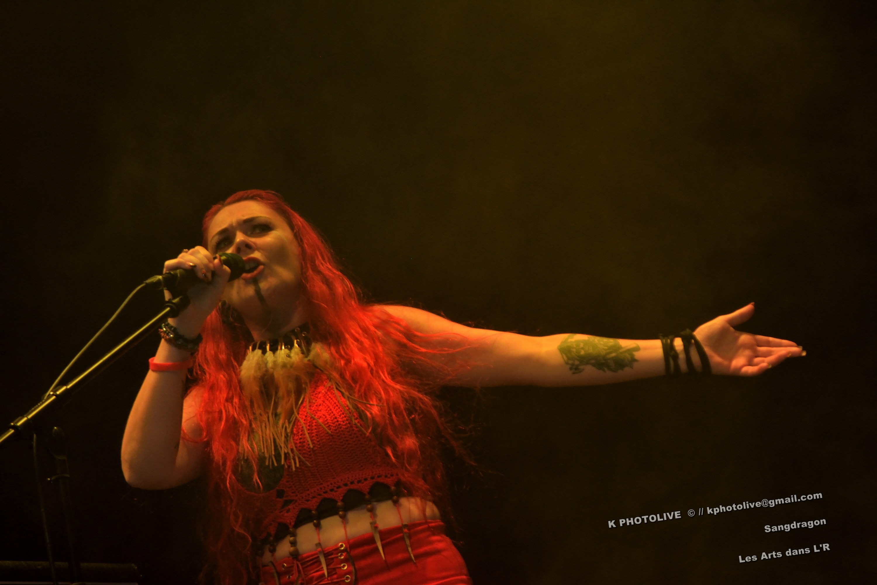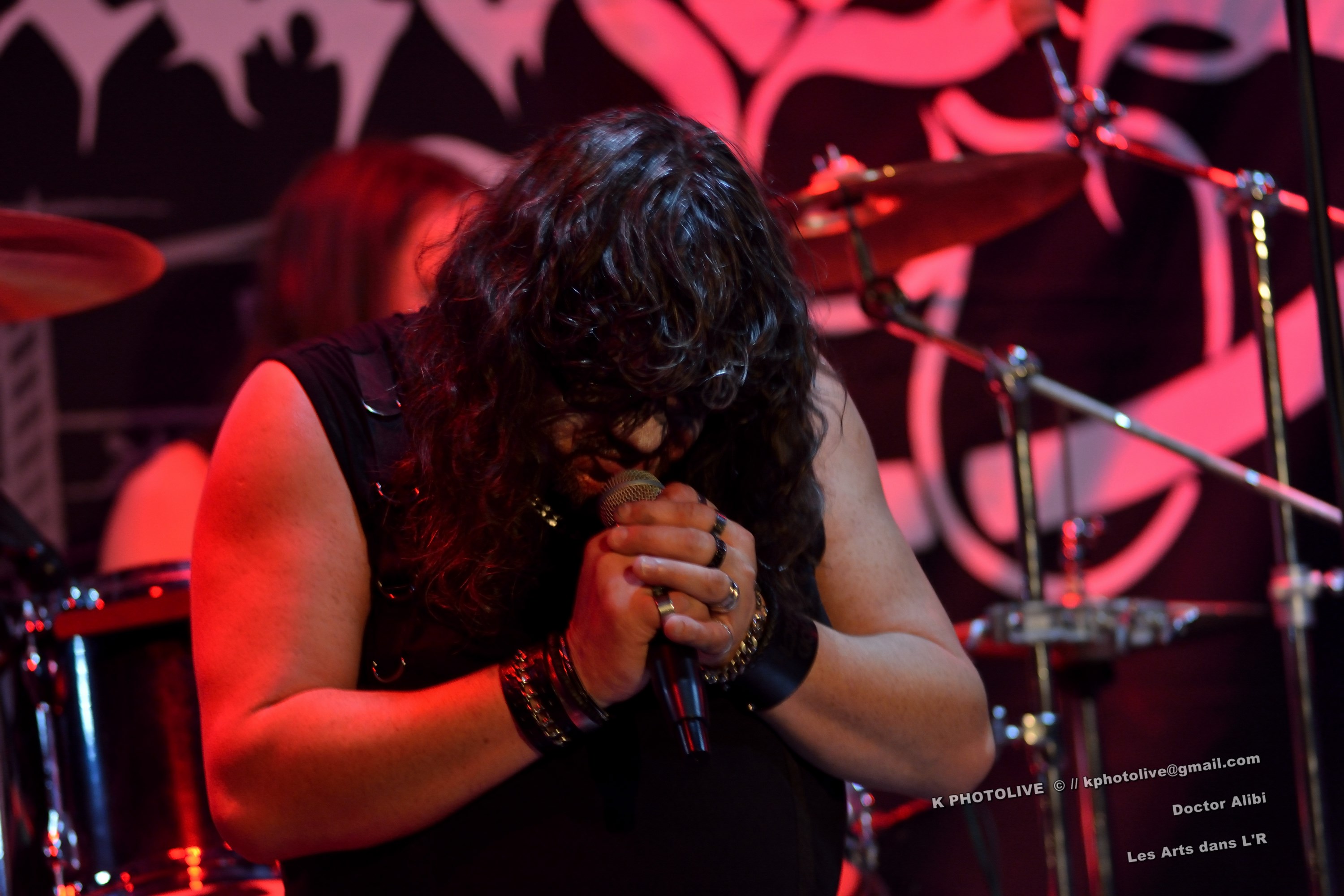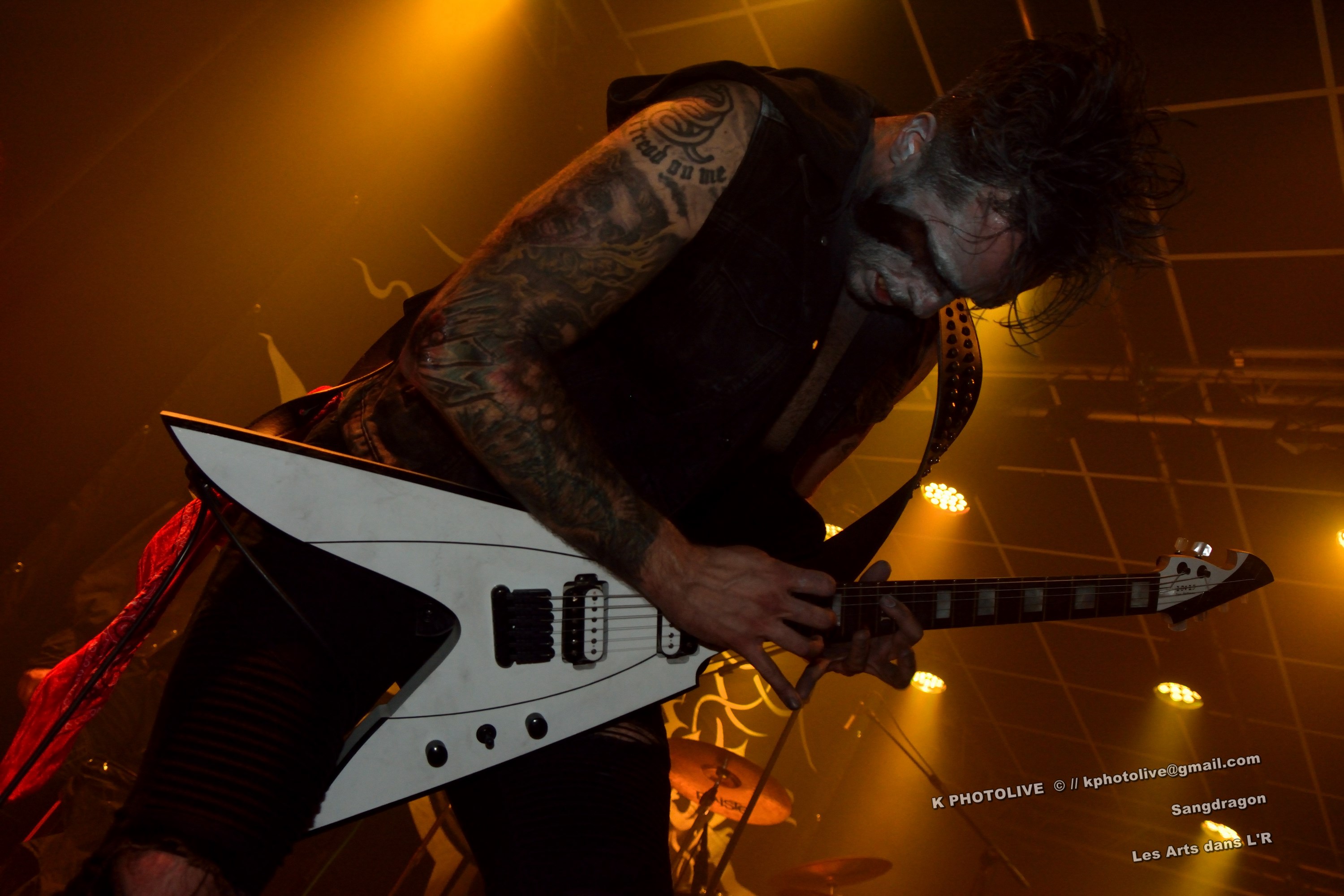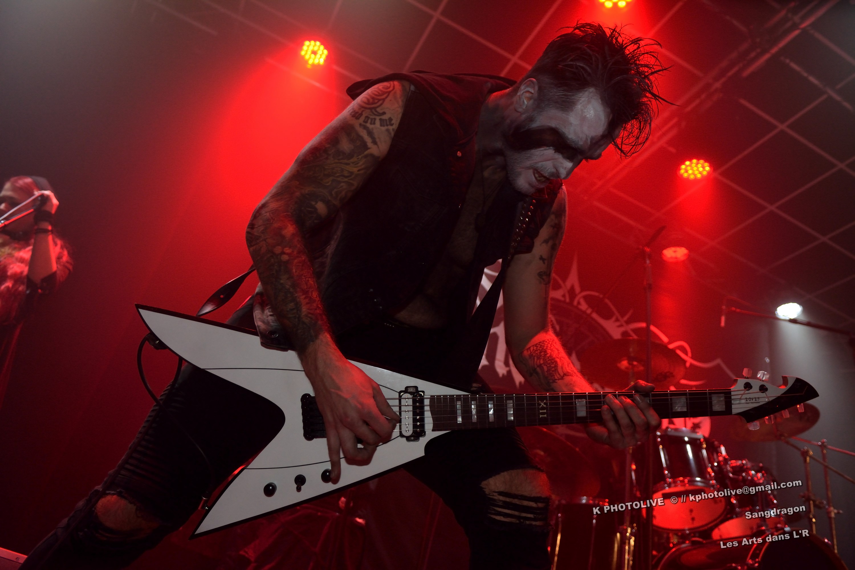 DOCTOR ALIBI est un groupe de reprises, un « coverband » né en 2015-2016, comme disent les initiés, des passionnés de hard-rock, le premier étant l'infatigable Christophe Ginet, chanteur, bien connu du côté de Leyment, entouré de ses quatre acolytes, des artistes qui ont dépassé le stade de l'adolescence, dotés d'un indéniable talent, à savoir Manu (batteur), Christophe (bassiste), Greg et Christian (guitaristes). Ils font revivre MOTÖRHEAD et l'emblématique Lemmy à travers plusieurs titres, interprètent quelques chansons des Américains NASHVILLE PUSSY (avec « Why ? 1,2,3…, par exemple), et MARILYN MANSON notamment. Tous les présents, la fourchette ou le verre à la main, s'attendaient-ils à voir et à entendre un tel spectacle en cette soirée Halloween ? Pas sûr. Quoi qu'il en soit, le quintette DOCTOR ALIBI, dans un nuage de fumée, a été chaleureusement applaudi par un public convaincu et ravi de ce set de trente minutes. (set-list en photo) Changement de plateau, mouvement dans la salle...bientôt le dessert ! Vers 21 heures 45, la musique -une autre musique !- retentit, accompagnée d'un « Sanctus ! Dominus ! » qui sonne comme venant d'outre-tombe. SANGDRAGON va jouer pendant une heure et quart son répertoire complet, des morceaux des débuts, d'autres plus récents. Mais il convient de présenter brièvement cette formation à sept têtes, qui rayonne dans la Bourgogne du Sud, la Saône-et-Loire en particulier et Mâcon avant tout, où des musiciens bien inspirés ont fondé SANGDRAGON , un groupe original, vers 2011, sur les cendres de Daemonium et Akhenaton. Les trois artisans à l'origine de la réussite de SANGDRAGON, Vincent Urbain (chant et instruments folkloriques), Will Hien (basse et chant) et Matt Asselberghs (guitare) ont été rejoints depuis 2015 par Edouard Verneret (claviers), Cynthia Marciniak (voix claire et choeurs), Denis Josserand alias Mad Joss (percussions et choeurs) et plus récemment par Paul Sordet (batterie), rapidement devenu indispensable. Les tenues médiévales, capuches et autres costumes, les épées brandies par Vincent, attirent l'attention des spectateurs, presqu'autant que le son et les mélodies, un vrai show, pour les yeux et pour les oreilles. La musique des Bourguignons s'inscrit dans la catégorie death-black symphonique et médiéval avec choeurs. Cet « équipage » génère une atmosphère de mysticisme ésotérique qu'on imagine aisément dans une cathédrale. Les voix -graves, rauques, gutturales-, les instruments, les choeurs -et le talent !-font de SANGDRAGON une formation atypique qui n'a pas de mal à plonger auditeurs et spectateurs, les yeux fermés, dans un univers magique, sorte de monde des ténèbres et, il faut le dire, d'une réelle beauté. Pas de temps mort, des chansons variées, rien de linéaire ou de répétitif, la preuve : le public est conquis, les gens se lèvent, applaudissent, tentent de « bouger » entre les tables et les chaises, frappent des mains... Pas de conflit de générations entre ces colosses que sont Vincent et Will, impressionnants sur le devant de la scène, dont l'expérience saute aux yeux, et Matt, lui aussi imposant, d'une part, et Paul, discret et tellement efficace derrière ses fûts, d'autre part, entourés de Cynthia, Denis et Edouard, déjà cités, sans qui SANGDRAGON ne serait qu'un groupe de metal classique. Un bref répit et on embraye sur un genre plus nuancé d'où ressortent nettement les claviers et les percussions, et sans préavis tout s'emballe, Matt bondit dans la salle pour quelques secondes, on s'achemine vers un beau final, une sorte d'apothéose, avec des titres comme « Final Battle » (Akhenaton) et « Game Of Thrones (Cover). Un rappel s'impose, on entendra alors « The Serpent's Wheel », une chanson de THE SEVEN GATES, ancien groupe de Vincent. « Bravo et merci ! » Les gens sont heureux, beaucoup ont découvert une musique, un style, des artistes authentiques...qui eux-mêmes sont en droit d'être fiers de leur prestation, différente de celles auxquelles on a pu assister dans certains concerts. Configuration particulière, on imagine sans peine ce qu'aurait été un »concert debout », mais n'ayons pas trop de regrets, nous étions comme au théâtre, assis. Et nous avons assisté à une belle pièce. Il convient d'adresser un grand merci à ceux et celles qui ont assuré la réussite de cette soirée « pas comme les autres », les musiciens, les bénévoles, le public, et bien sûr, le maître des lieux, Raphaël. |