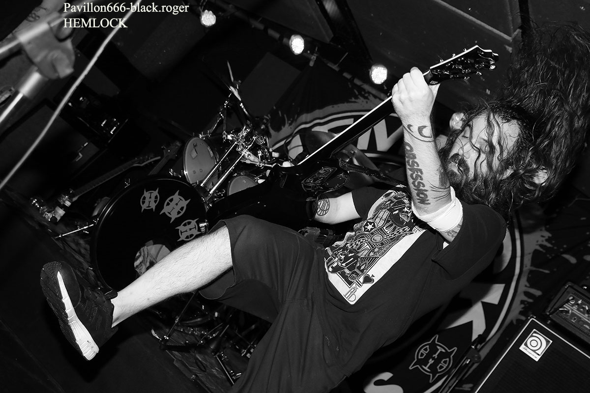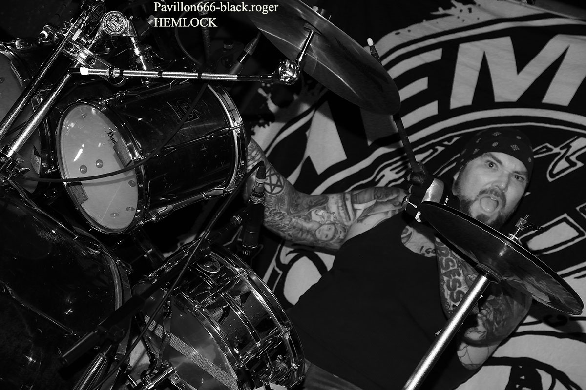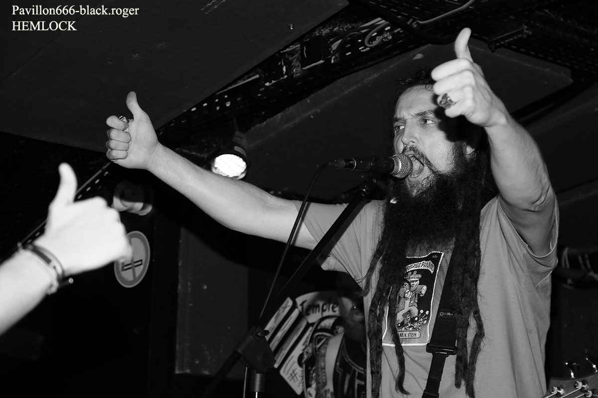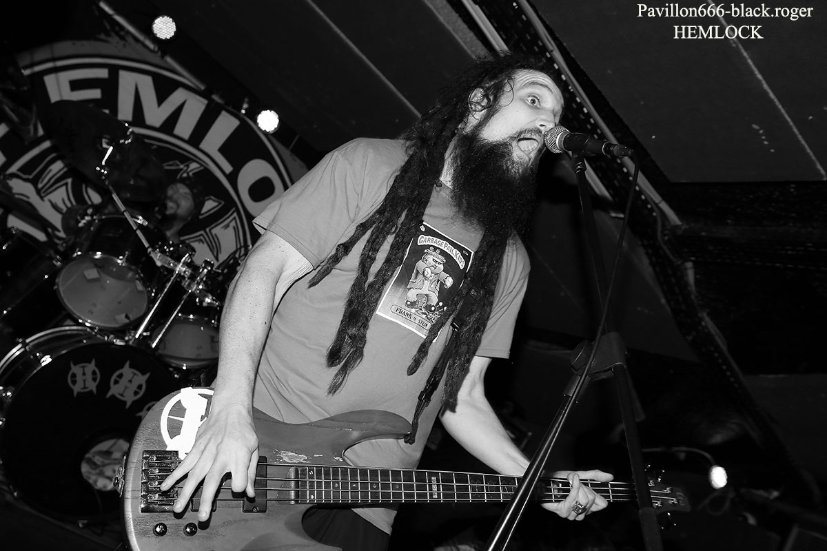 Déjà 7 années au compteur pour FACE 2 FAKE qui progresse d’année en année. Il est vrai que les musiciens de ce groupe ne sont pas nés de la dernière pluie rap-metal car ayant officié dans d’autres formations métalliques auparavant. Les ayant vu en action ici-même il y a peu de temps je constate que leur fusion rock-electro-hip hop a de la gueule maintenant et même si la grosse influence de Rage Against The Machine est omniprésente, leurs compositions tirent leur épingle du jeu. Et puis, la présence scénique de ces Lyonnais fait le reste, du coup le nombreux public déjà présent se laisse happer par leur show d’une rare intensité. Merci les gars vous revenez quand vous voulez. Set-list en photo Les « ricains » d’HEMLOCK prennent la suite sur les planches du Rock N’Eat pour un set, que dis-je, une performance physique et musicale puissante mais non dénuée d’un certain humour provocant. Plus de vingt années que ces thrashers fous sillonnent la planète avec sous leurs bras, pas moins de 9 albums dont le petit dernier intitulé « XXV » de 2018 qu’ils veulent nous faire « avaler » comme le micro du chanteur durant le set. Une pensée me traverse l’esprit subitement, comment n’ai-je pas découvert ce groupe jusqu’à présent ? C’est génial ce qu’il font, ils jouent comme des dieux, ne se prennent pas au sérieux, mélangent allègrement tous les styles de metal ou presque, passant du thrash à la Slayer au death old-school d’un Obituary en passant par la case dub/reggae. Alors nous avons dégusté dans tous les sens du terme avec ce groupe formé notamment par les frères Smith, Chad (chant/basse) et Brian (batterie). Une conclusion s’impose donc, formation à voir et revoir sans modération, ce fus incroyable ce soir. Set-list en photo HED.PE, c’est une longue histoire qui débute en 1994 sous l’impulsion de Jahred Shane un incroyable frontman d’une formation qui a transformé son punk originel en neo mais pas seulement. Avec Hed.Pe c’est le voyage à la Jamaîque aussi avec ce mélange improbable de reggae, rock, punk avec subitement des envois délires flirtant avec le hard-rock, voire le metal. Et puis il y a cette voix, cette présence, ce charisme de Jahred qui se promène sur les sons en fusion tel un équilibriste déjanté. Le tout sur des airs qui puent le groove, un groove qui fait transpirer les fans et tout autre public qui a mis le doigt dans l’engrenage de la fusion punk/hip hop. Les musiciens qui accompagnent ce soir Jahred sont un guitariste au doigté punk, un bassiste remarqué dans ses propos aventureux et un batteur tout ébouriffé par les mouvements complexes du groove et de plus très inspiré. Ce show nous a paru court au final surtout pour les fans ultimes qui ont pris ce soir leur « dose », mais le concert fut magique et mouvementé (chaloupé aussi), alors merci Hed.Pe ce fus hors du temps ce soir. Sert-list en photo. Merci au Rock n’eat live, merci aux musiciens des trois formations en lice, et bien entendu merci à ce nombreux public qui a rempli notre club préféré, on recommence quand ? |