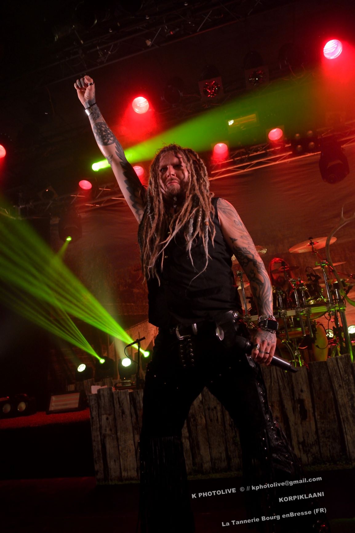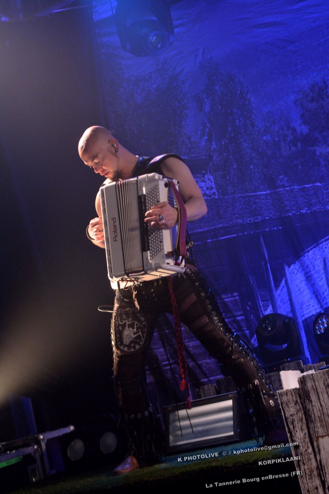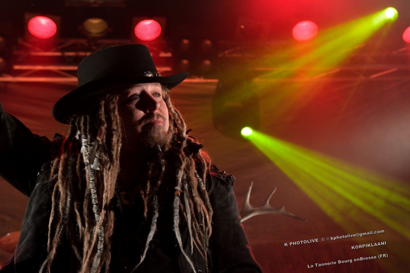 Il est bientôt 21heures lorsque « la bande » de KORPIKLAANI, officielle tête d'affiche, déjà 25 ans au compteur, investit la scène, attendue avec impatience par ses nombreux fans. Originaires de Lahti, ville située à environ 100 km au Nord d'Helsinki, en lisière de la Laponie, leur nom signifie « clan de la forêt ». KORPIKLAANI compte parmi les groupes de metal ou proches de ce genre musical qui donnent le plus de concerts au plan international. On remarque d 'emblée la présence de divers types d'instruments, accordéon, violoncelle et les longues dreads du chanteur et leader Jonne Järvelä et l'imposante silhouette du bassiste aux pieds nus, Jaarko Aaltonen.