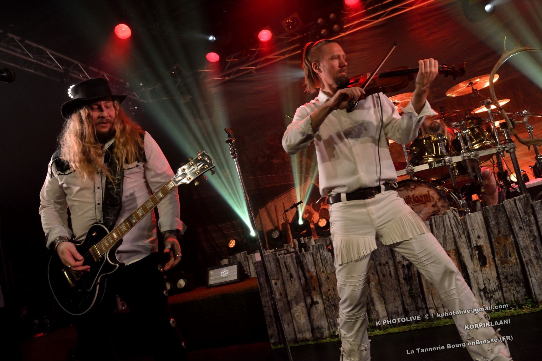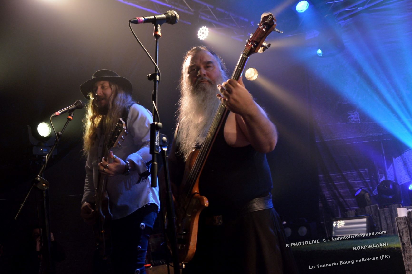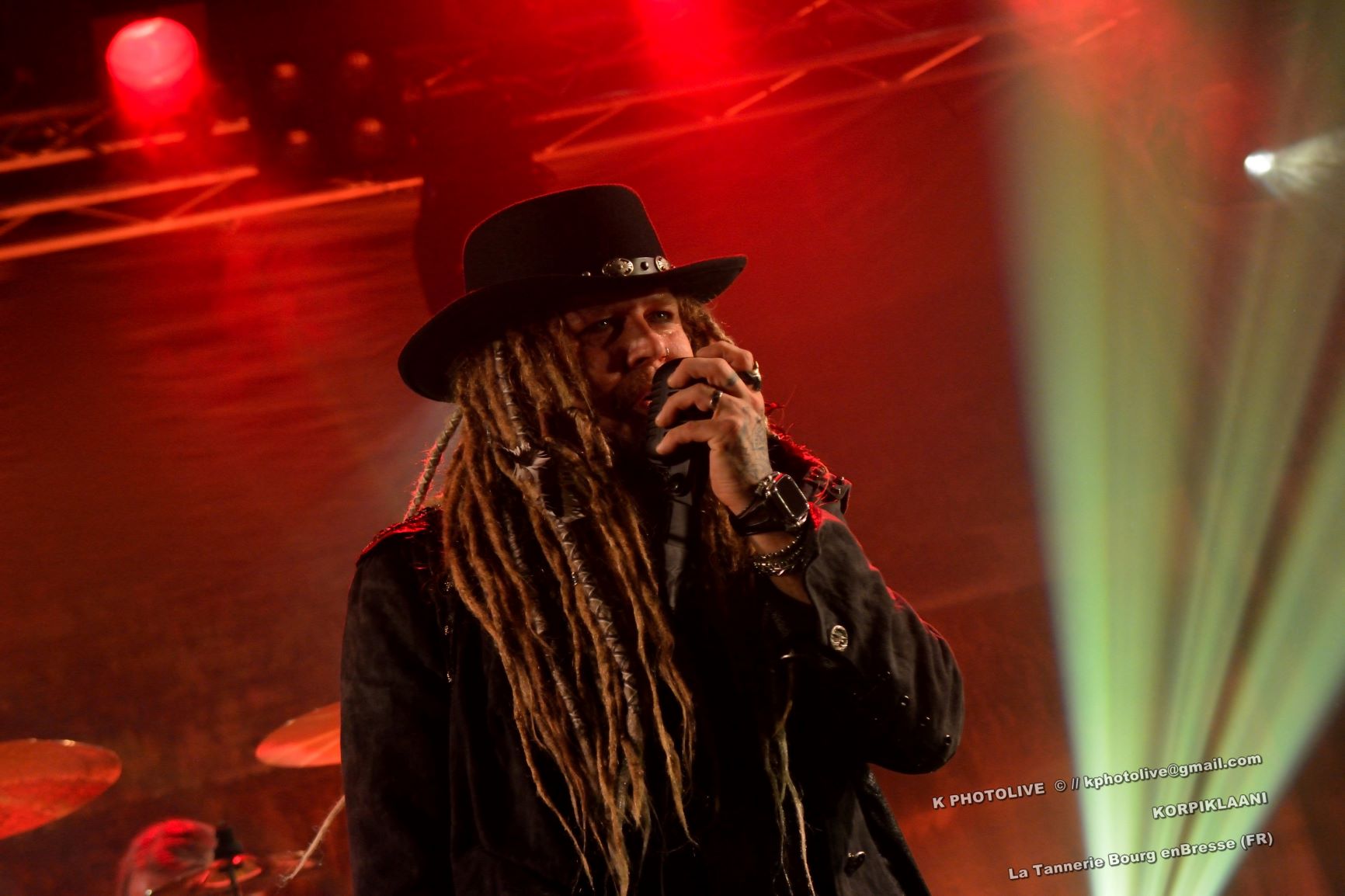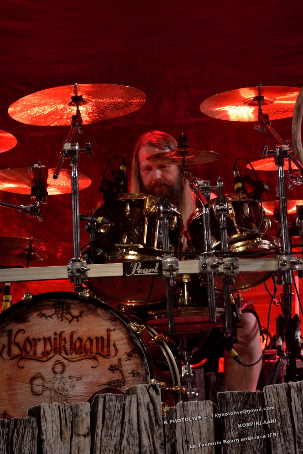 Il est bientôt 21heures lorsque « la bande » de KORPIKLAANI, officielle tête d'affiche, déjà 25 ans au compteur, investit la scène, attendue avec impatience par ses nombreux fans. Originaires de Lahti, ville située à environ 100 km au Nord d'Helsinki, en lisière de la Laponie, leur nom signifie « clan de la forêt ». KORPIKLAANI compte parmi les groupes de metal ou proches de ce genre musical qui donnent le plus de concerts au plan international. On remarque d 'emblée la présence de divers types d'instruments, accordéon, violoncelle et les longues dreads du chanteur et leader Jonne Järvelä et l'imposante silhouette du bassiste aux pieds nus, Jaarko Aaltonen.