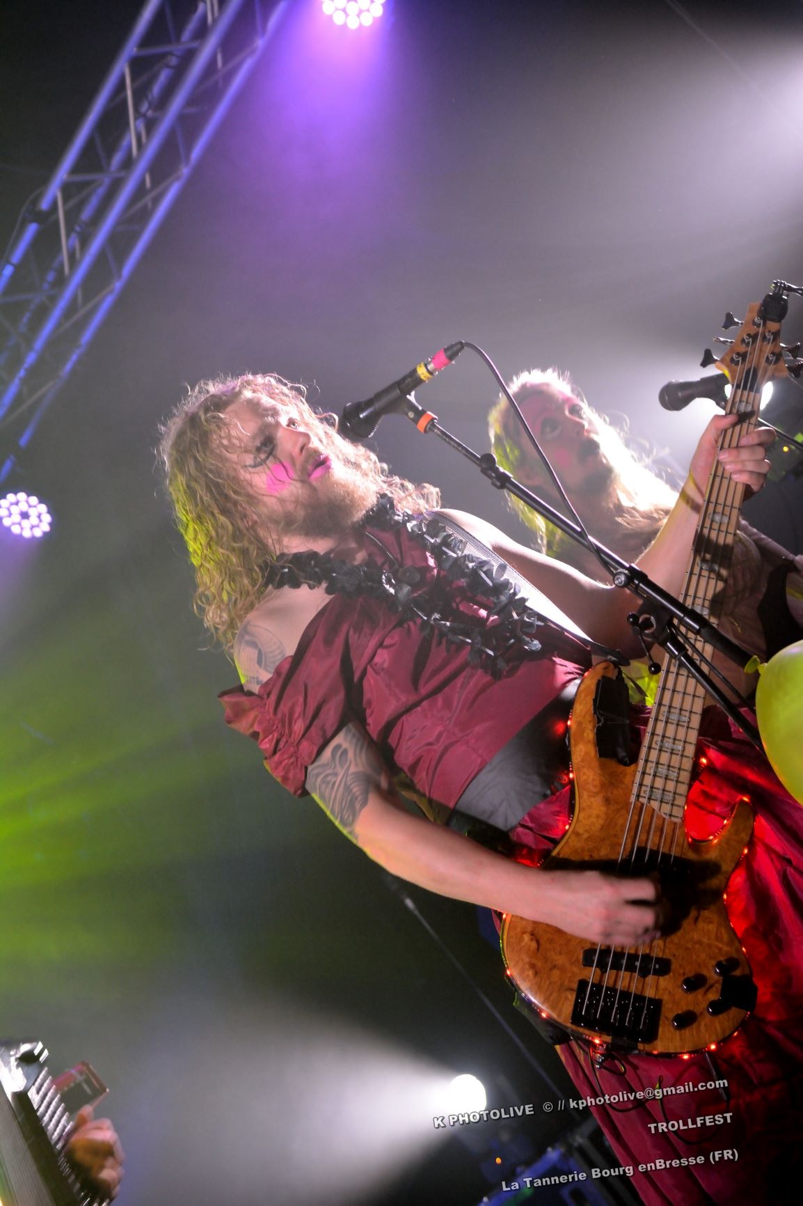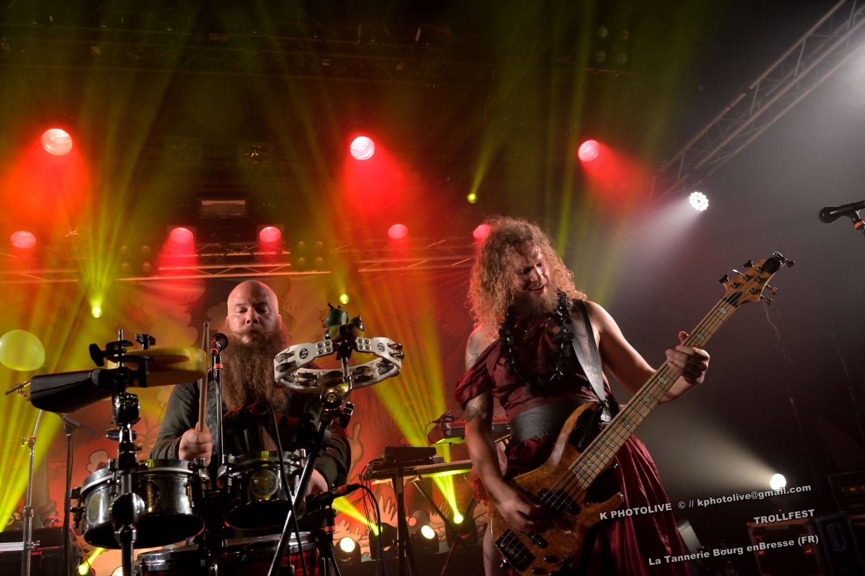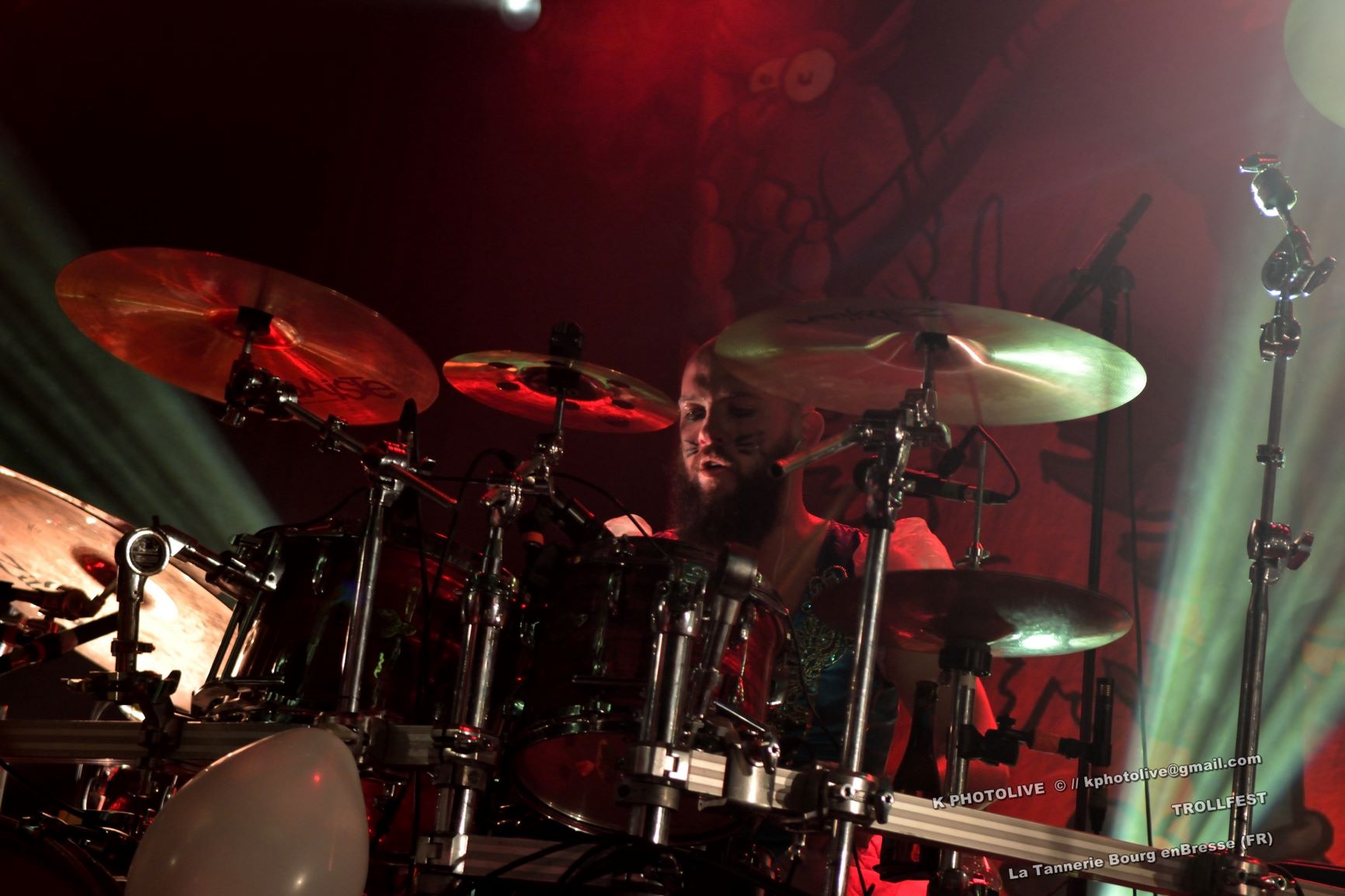 Dès 17 heures 30, devant un public composé de jeunes et de moins jeunes, masculin et féminin, les sept musiciens de TROLLFEST, formation qui a vu le jour en 2003, barbes et cheveux longs, accoutrements colorés ou bariolés débarquent avec tambour et trompette sur la grande scène de la Tannerie, décorée de ballons multicolores et autres fanfreluches. Le ton est donné, on joue, on chante (dans un mélange approximatif de norvégien et d'allemand!), on danse, c'est le grand Carnaval, tous les instruments sont là, batterie et guitares bien entendu, mais aussi accordéon, claviers, saxo, percussions, l'ensemble sous l'autorité bienveillante du chanteur-maître de cérémonie, « Trollmannen », qui s'adresse au public, lui ordonne de s'asseoir (« sit down »), de se lever, de se préparer à un wall of death géant, et même de défiler en cercle en chantant « A la queue leuleu... » ! Ce frontman charismatique avait auparavant jeté sur la foule (en délire!) sa huppe de ballons multicolores. Les gens sont aux anges, les plus excités se jettent contre les barrières métalliques installées exceptionnellement devant la scène, les grands enfants s'amusent, bref, on assiste à un numéro interactif (et folklorique) scène-salle parfaitement réussi, qui s'achèvera au bout d'une heure par un « waf,waf,waf » qui illustre bien l'esprit festif de TROLLFEST. Les amateurs de jolis textes et les metalleux de stricte obédience n'auront pas fait le bon choix, chacun son style ! TROLLFEST n'est pas FINNTROLL. Rappelons que le groupe d'Oslo s'était déjà fait remarquer au SYLAK OPEN AIR 2017.