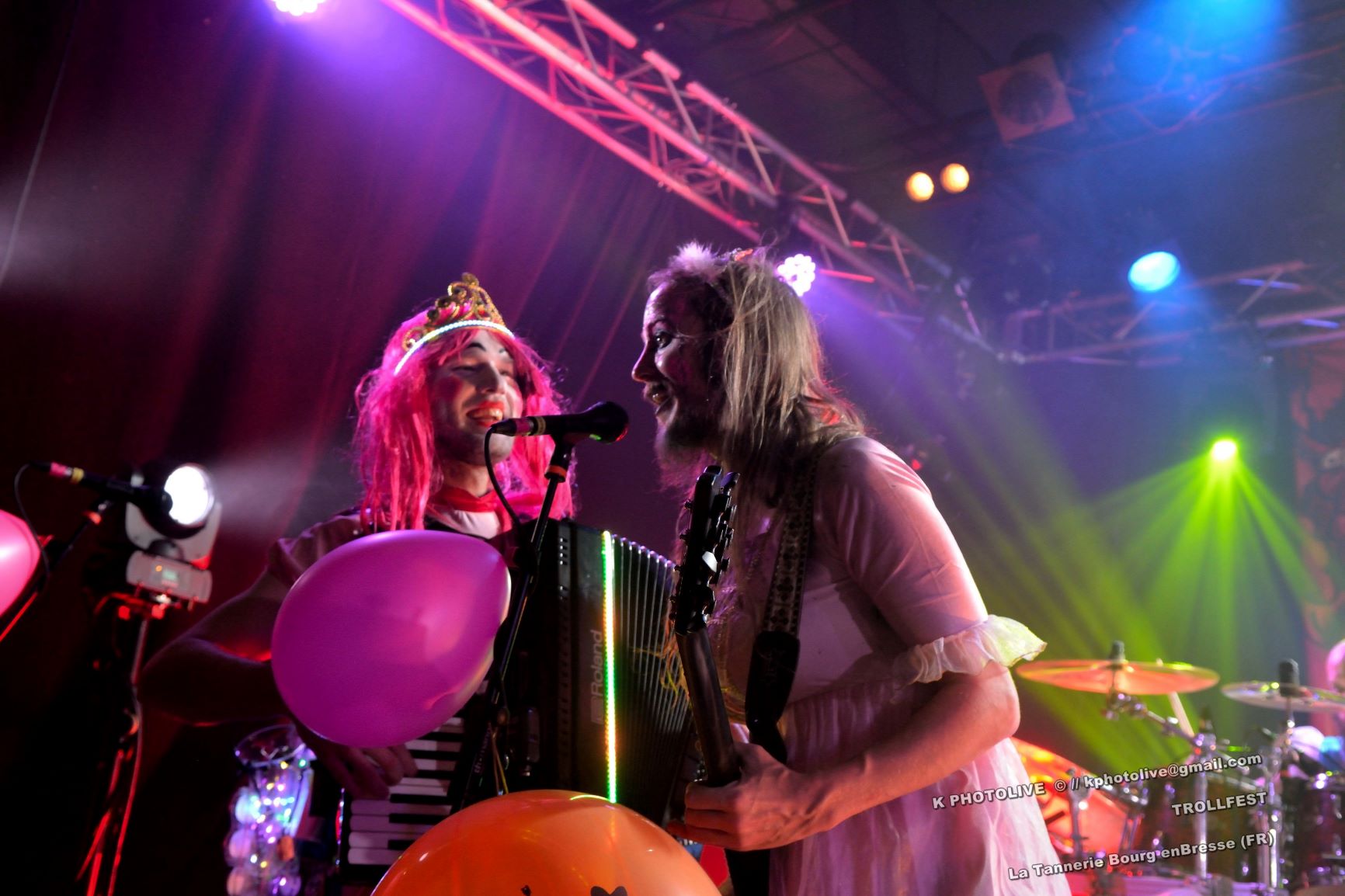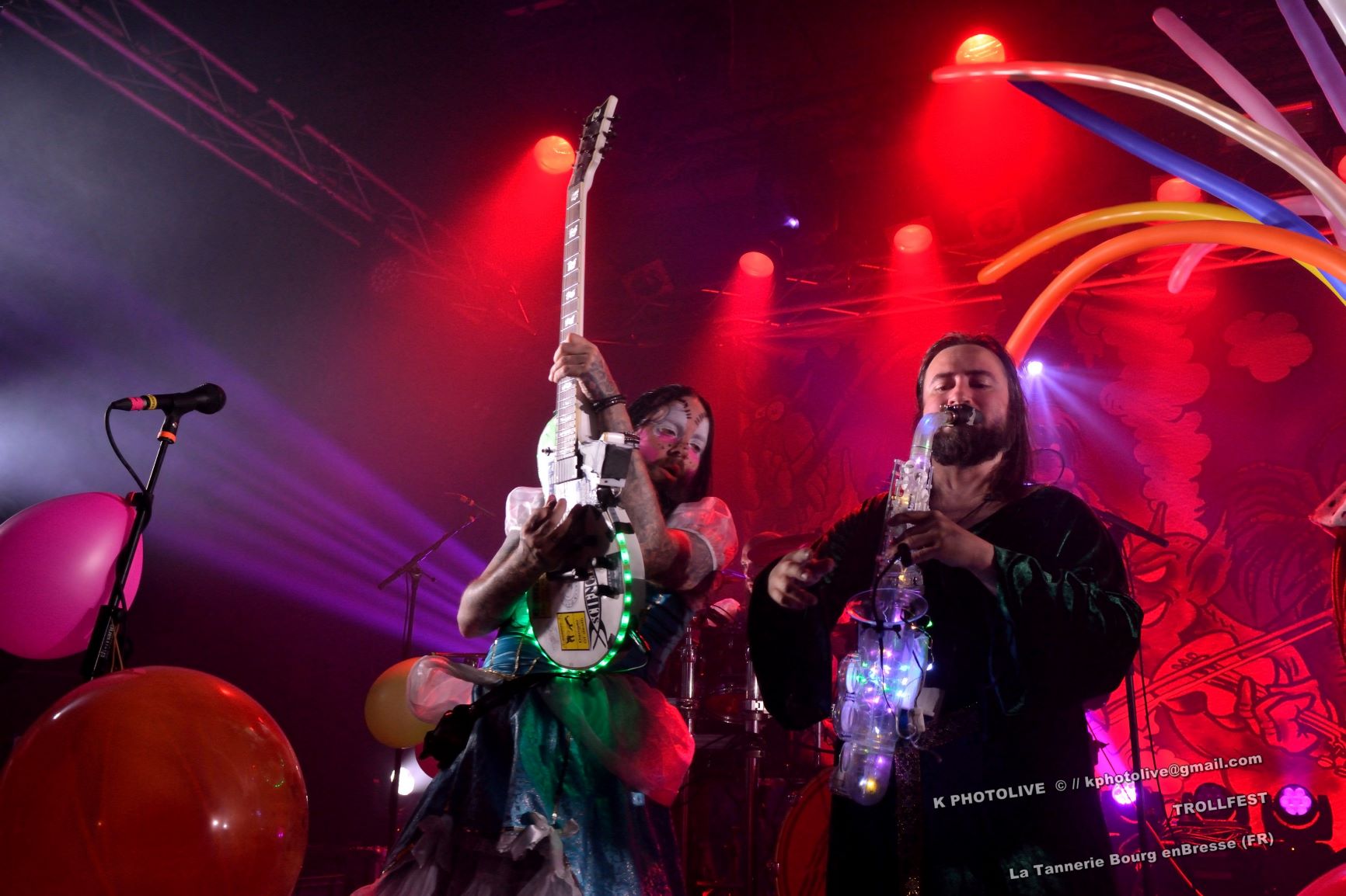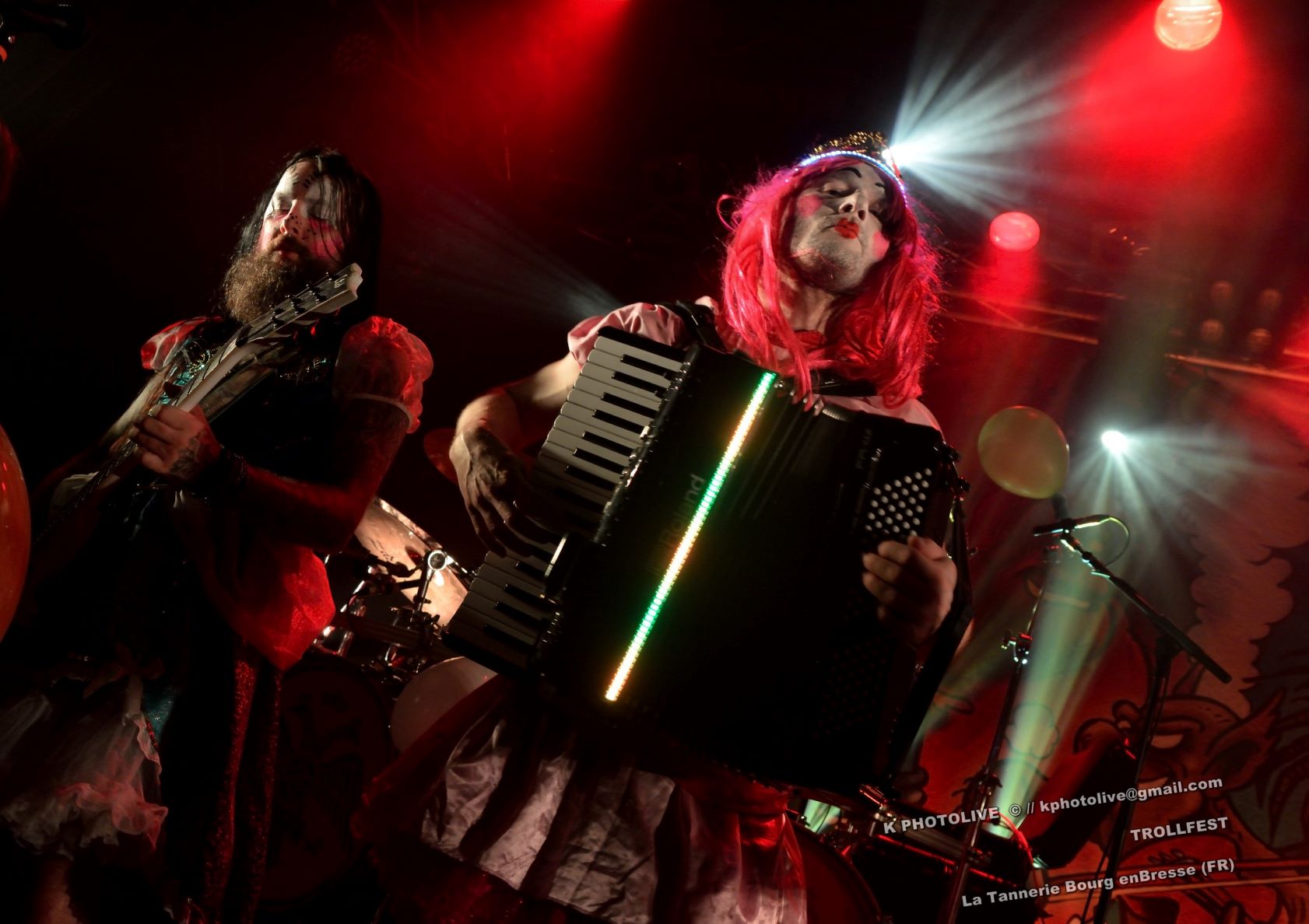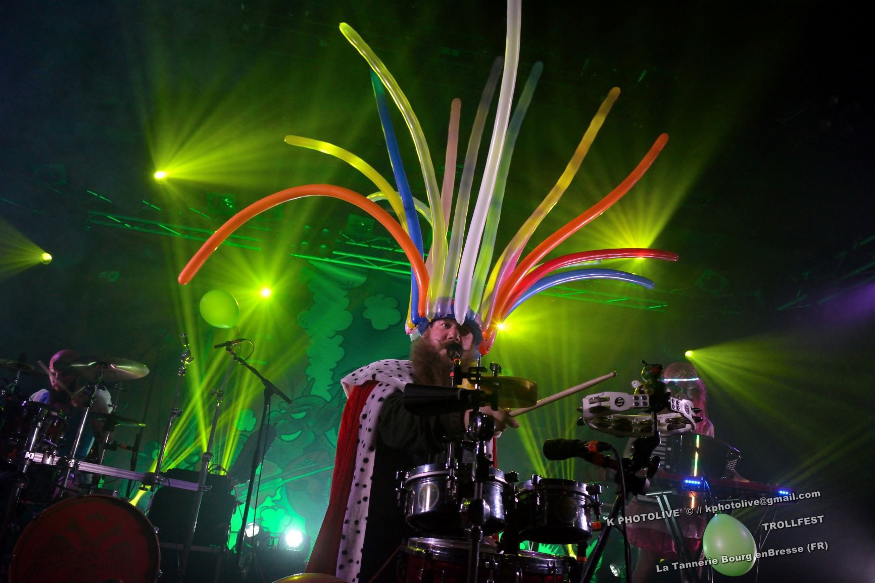 Dès 17 heures 30, devant un public composé de jeunes et de moins jeunes, masculin et féminin, les sept musiciens de TROLLFEST, formation qui a vu le jour en 2003, barbes et cheveux longs, accoutrements colorés ou bariolés débarquent avec tambour et trompette sur la grande scène de la Tannerie, décorée de ballons multicolores et autres fanfreluches. Le ton est donné, on joue, on chante (dans un mélange approximatif de norvégien et d'allemand!), on danse, c'est le grand Carnaval, tous les instruments sont là, batterie et guitares bien entendu, mais aussi accordéon, claviers, saxo, percussions, l'ensemble sous l'autorité bienveillante du chanteur-maître de cérémonie, « Trollmannen », qui s'adresse au public, lui ordonne de s'asseoir (« sit down »), de se lever, de se préparer à un wall of death géant, et même de défiler en cercle en chantant « A la queue leuleu... » ! Ce frontman charismatique avait auparavant jeté sur la foule (en délire!) sa huppe de ballons multicolores. Les gens sont aux anges, les plus excités se jettent contre les barrières métalliques installées exceptionnellement devant la scène, les grands enfants s'amusent, bref, on assiste à un numéro interactif (et folklorique) scène-salle parfaitement réussi, qui s'achèvera au bout d'une heure par un « waf,waf,waf » qui illustre bien l'esprit festif de TROLLFEST. Les amateurs de jolis textes et les metalleux de stricte obédience n'auront pas fait le bon choix, chacun son style ! TROLLFEST n'est pas FINNTROLL. Rappelons que le groupe d'Oslo s'était déjà fait remarquer au SYLAK OPEN AIR 2017.