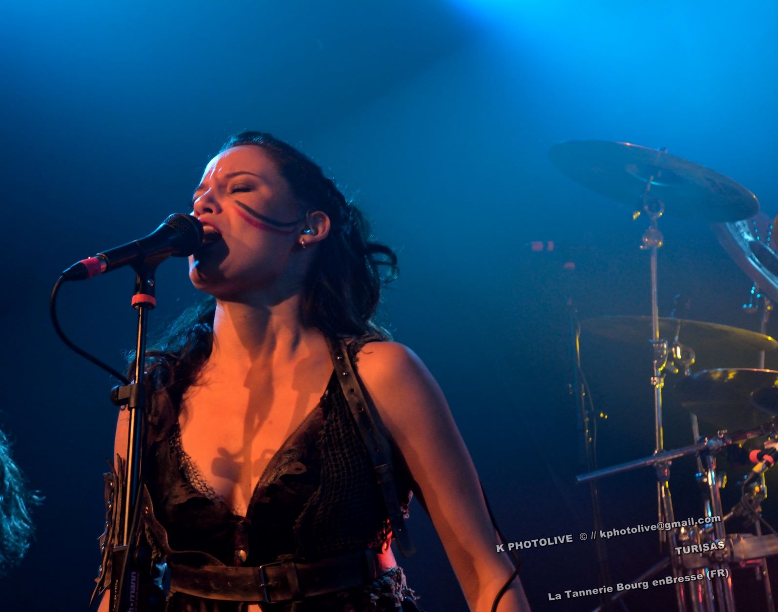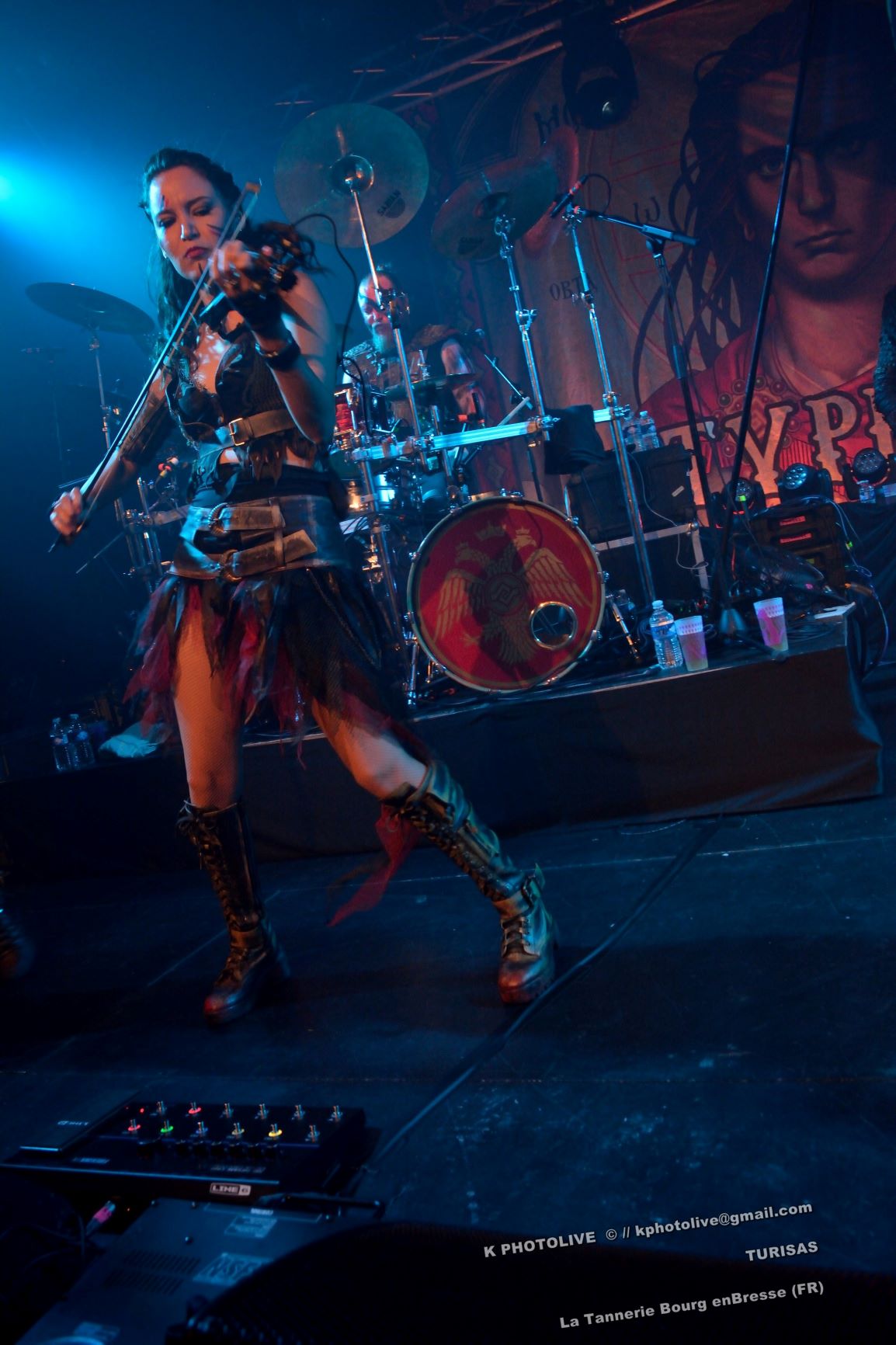 Vêtus de cuirs cloutés, visages couverts de « sang », nos six guerriers, dont une guerrière , séduisante valkyrie, s'inspirent du folklore nordique et de la mythologie finnoise. Les hommes ressemblent à des ogres, seule la brillante violoniste offre un visage humain. A plusieurs reprises, Mathias, le chanteur et animateur du groupe, s'efforce de prononcer, de sa voix grave, « Bourkenbresse », tandis que le public enthousiaste et joyeux s'agite de plus en plus. Jamais de répit dans la fosse, pogos et slams se succèdent, colonnes de fumée, confetti, le spectacle est total, magnifique...Cette osmose entre les artistes et les spectateurs constitue la force de TURISAS qui reste un authentique groupe de metal. La dernière partie de leur set d'une heure et demie fait plus ou moins penser à une chorale dont la musique résonne dans une cathédrale – on invoque le ciel, le dieu Odin ?- La séquence qui suit sonne comme un délicieux « dessert musical ». Mention très bien aux Finlandais...qui n'avaient pu jouer que 23 minutes au HELLFEST 2011 !