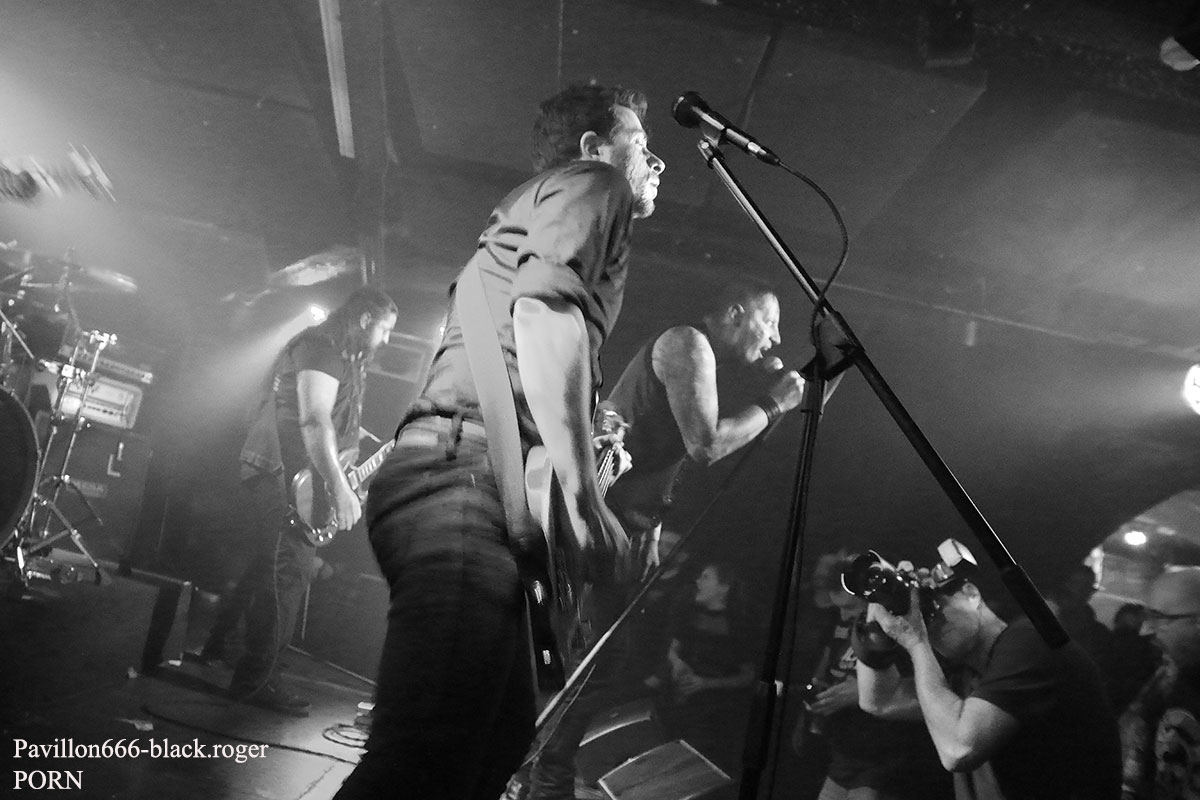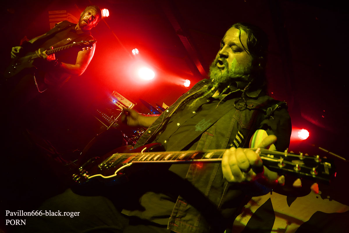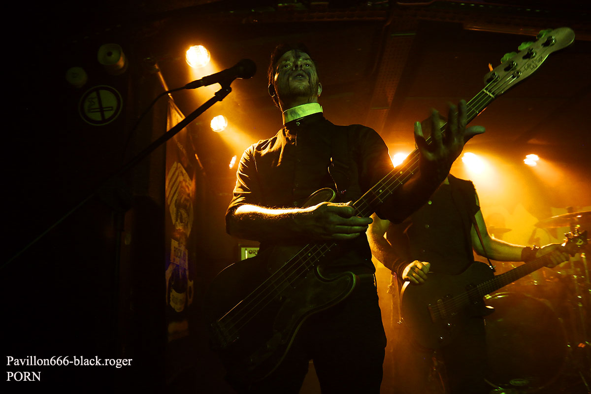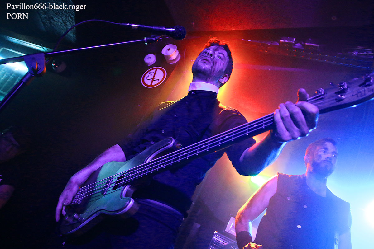 « Sex, Drugs & Rosenkruz », voici la devise de ceux de ROSENKREUZ tout simplement ! Et l’entrée en scène se fait avec l’arrivée du frontman et du guitariste tenant la laisse qui conduit leurs compagnes, surprise ! Puis tout démarre avec le « prêche » de l’Abbé SM qui depuis son pupitre harangue l’assistance et lui inflige des « punitions ». Le sermon durera au moins 45 minutes durant lesquelles les titres mortels allant de "MDMA » à « crystal city » en passant par « die », « libertine lover » et « she’s lost » nous seront jetés en pâture sur une chorégraphie scénique incroyablement vivace ou vivante, c’est comme vous voulez. Rosenkreuz fascine de plus en plus un public de plus en plus concerné par leur musique et par leur attitude c’est un fait et c’est largement mérité. Bien qu’inspiré au départ par des formations comme The Sisters of Mercy, pour n’en citer qu’une, Rosenkreuz a su au fil du temps, au fil des compositions et au fil de ses « live » créer sa propre identité, il n’y a pas photo. Alors si vous voulez aller plus loin avec eux écoutez en boucle leur EP « infinite » et bien entendu ne ratez pas leurs présences scéniques cela va de soi. Ce soir ils ont enfoncé le clou rouillé de leur musique dans nos cervelles de dégénérés et ce fus bien (qui a dit comme d’habitude ?). Set-List en photo. Après Rosenkreuz, voici PORN qui vient nous présenter son nouvel opus intitulé « the darkest of human desires act II » (2019) qui fait partie d’une trilogie débutée en 2017 avec l’album « the ogre inside act I ». Pour la petite histoire, je me souviens de la prestation du groupe en Janvier 2011 au transbordeur de Lyon en première partie de Murderdolls, Porn faisant dans le « murder-rock » tout semblait bien senti. Mais le « hic », c’est que je n’avais pas spécialement accroché à leur set ce soir-là, pourquoi, je ne sais pas. En tous cas ce soir je vais profiter à fond de leur « live » huit ans après, avec satisfaction j’espère. Leur « murder-rock » mélancolique que l’on pourrait situer quelque part entre Marilyn Manson, Type O Negative et même The Sister of Mercy (encore) reste triste dans son ensemble et même si par moments les guitares semblent s’énerver on retombe bien vite dans des ambiances gluantes à souhait ce qui n’est pas pour déplaire à l’auditoire goth de ce soir. En vingt années d’existence Porn a bien évolué après des périodes où le groupe semblait se chercher encore. Maintenant le répertoire est solide, les musiciens sont peu loquaces mais leur musique parle pour eux. Nous avons apprécié le nouveau venu derrière les fûts, Lucas, qui officie également dans les Lyonnais de Buy Jupiter, et a marqué ce soir la prestations avec son jeu « plombé » et bien organique en même temps. Bref, ce soir Porn a gagné à être connu et reconnu enfin après tout ce temps passé en studio et en concerts depuis une vingtaine d’années donc, est-ce la maturité ? Oui je pense car nous avons apprécié sans faux-semblants leur set donné devant un public qui semblait acquit à leur cause, et ce fus bien (bis repetita).. Set-list en photo. Soirée pas comme les autres donc, mais soirée réussie à tous les niveaux. Remerciements donc aux organisateurs, Rock n’Eat et public cela va s’en dire ! |