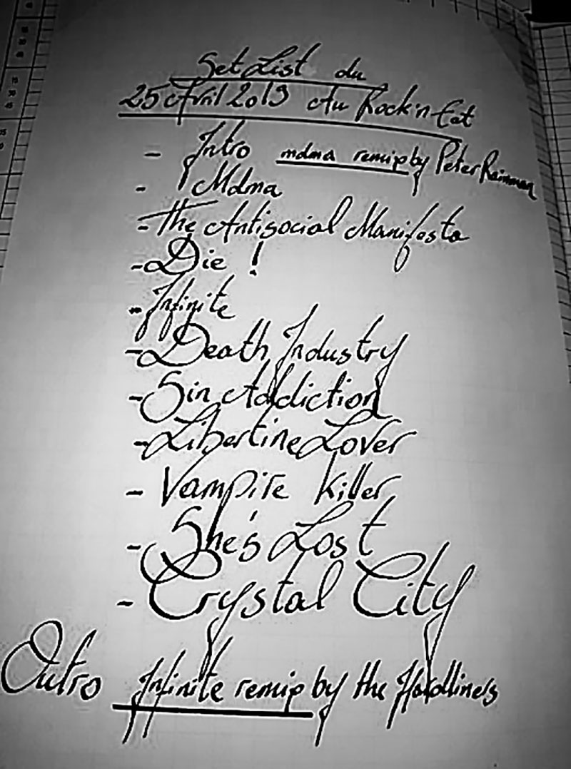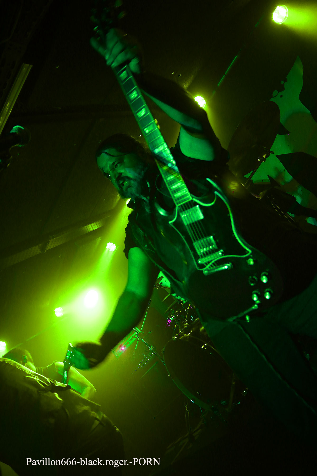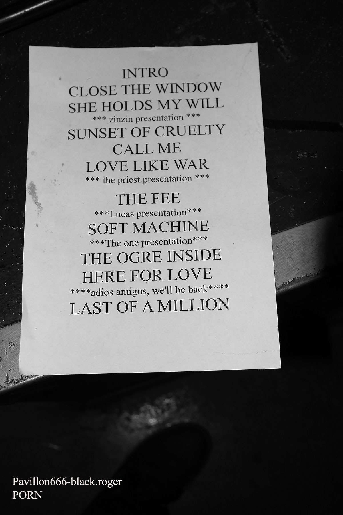 « Sex, Drugs & Rosenkruz », voici la devise de ceux de ROSENKREUZ tout simplement ! Et l’entrée en scène se fait avec l’arrivée du frontman et du guitariste tenant la laisse qui conduit leurs compagnes, surprise ! Puis tout démarre avec le « prêche » de l’Abbé SM qui depuis son pupitre harangue l’assistance et lui inflige des « punitions ». Le sermon durera au moins 45 minutes durant lesquelles les titres mortels allant de "MDMA » à « crystal city » en passant par « die », « libertine lover » et « she’s lost » nous seront jetés en pâture sur une chorégraphie scénique incroyablement vivace ou vivante, c’est comme vous voulez. Rosenkreuz fascine de plus en plus un public de plus en plus concerné par leur musique et par leur attitude c’est un fait et c’est largement mérité. Bien qu’inspiré au départ par des formations comme The Sisters of Mercy, pour n’en citer qu’une, Rosenkreuz a su au fil du temps, au fil des compositions et au fil de ses « live » créer sa propre identité, il n’y a pas photo. Alors si vous voulez aller plus loin avec eux écoutez en boucle leur EP « infinite » et bien entendu ne ratez pas leurs présences scéniques cela va de soi. Ce soir ils ont enfoncé le clou rouillé de leur musique dans nos cervelles de dégénérés et ce fus bien (qui a dit comme d’habitude ?). Set-List en photo. Après Rosenkreuz, voici PORN qui vient nous présenter son nouvel opus intitulé « the darkest of human desires act II » (2019) qui fait partie d’une trilogie débutée en 2017 avec l’album « the ogre inside act I ». Pour la petite histoire, je me souviens de la prestation du groupe en Janvier 2011 au transbordeur de Lyon en première partie de Murderdolls, Porn faisant dans le « murder-rock » tout semblait bien senti. Mais le « hic », c’est que je n’avais pas spécialement accroché à leur set ce soir-là, pourquoi, je ne sais pas. En tous cas ce soir je vais profiter à fond de leur « live » huit ans après, avec satisfaction j’espère. Leur « murder-rock » mélancolique que l’on pourrait situer quelque part entre Marilyn Manson, Type O Negative et même The Sister of Mercy (encore) reste triste dans son ensemble et même si par moments les guitares semblent s’énerver on retombe bien vite dans des ambiances gluantes à souhait ce qui n’est pas pour déplaire à l’auditoire goth de ce soir. En vingt années d’existence Porn a bien évolué après des périodes où le groupe semblait se chercher encore. Maintenant le répertoire est solide, les musiciens sont peu loquaces mais leur musique parle pour eux. Nous avons apprécié le nouveau venu derrière les fûts, Lucas, qui officie également dans les Lyonnais de Buy Jupiter, et a marqué ce soir la prestations avec son jeu « plombé » et bien organique en même temps. Bref, ce soir Porn a gagné à être connu et reconnu enfin après tout ce temps passé en studio et en concerts depuis une vingtaine d’années donc, est-ce la maturité ? Oui je pense car nous avons apprécié sans faux-semblants leur set donné devant un public qui semblait acquit à leur cause, et ce fus bien (bis repetita).. Set-list en photo. Soirée pas comme les autres donc, mais soirée réussie à tous les niveaux. Remerciements donc aux organisateurs, Rock n’Eat et public cela va s’en dire ! |