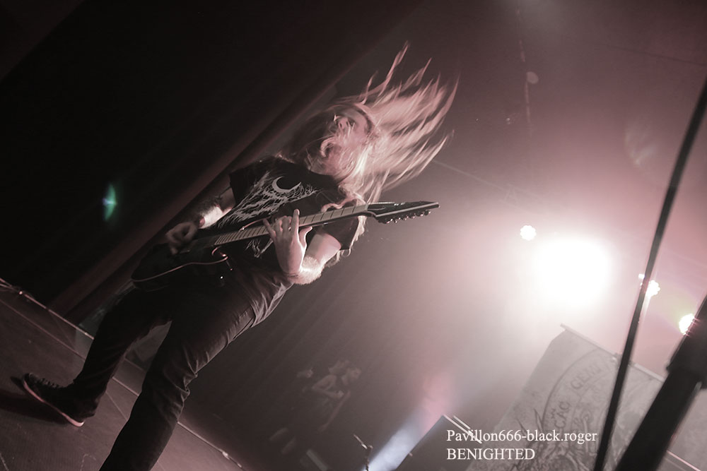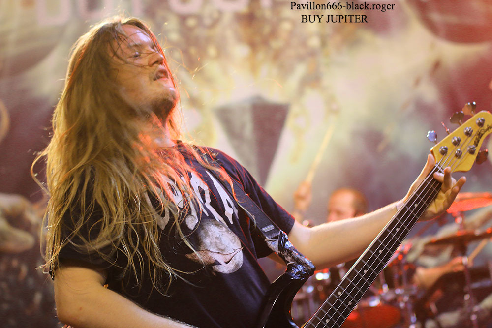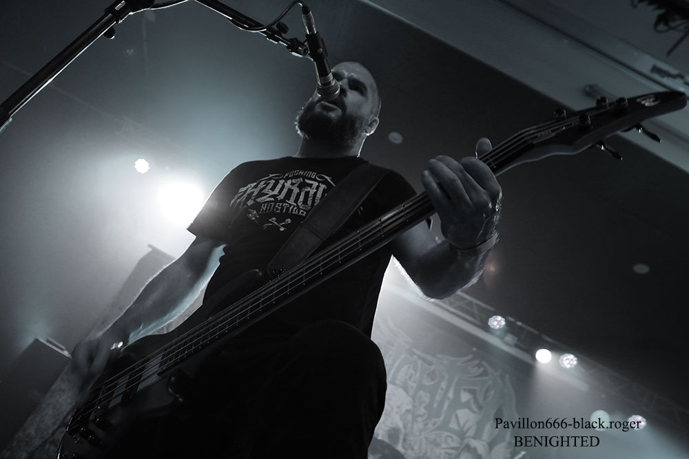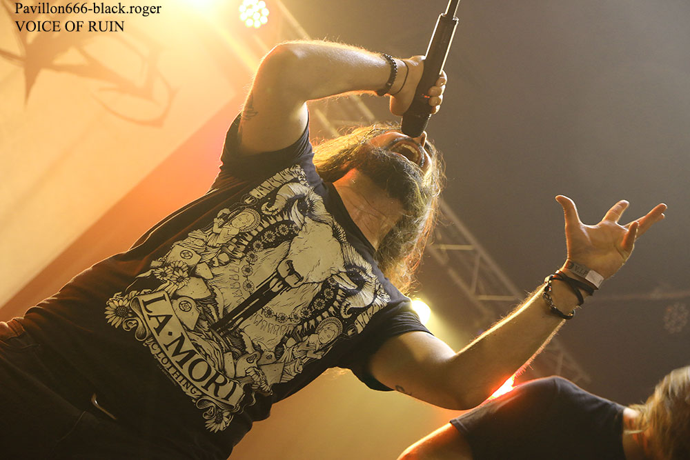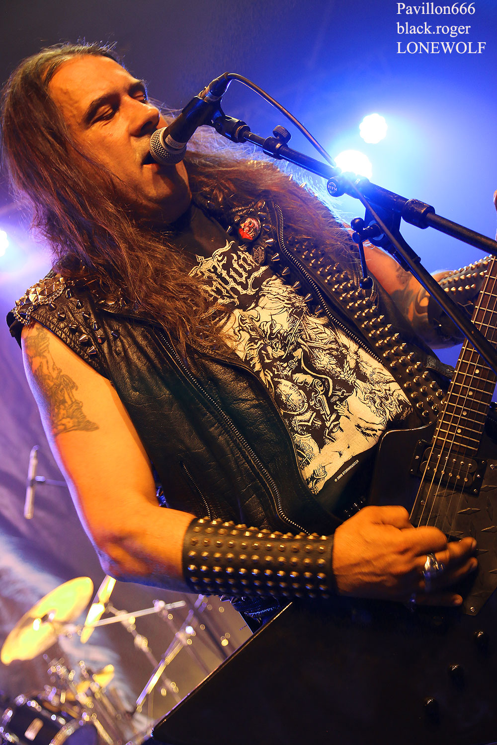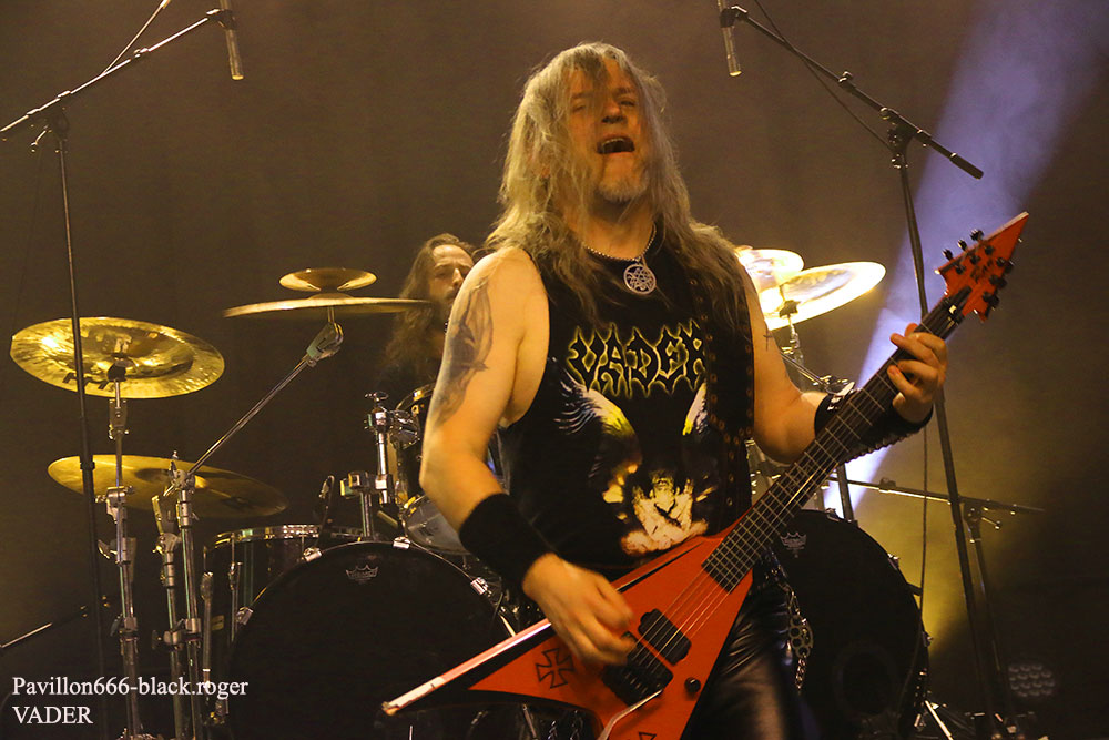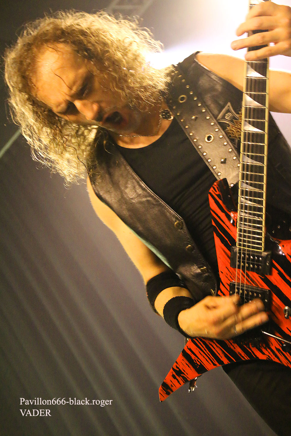 Au menu de cette journée, du thrash, du death, du metal dit « moderne », du heavy-mertaaaal, du brutal death/grind, du pagan et une légende du metal de la mort en tête d’affiche. Ce samedi, il faisait chaud, très chaud, aussi bien dans la salle que dehors dans une ambiance festive où l’on pouvait déguster grillades et chili même en version vegan, le tout arrosé de boissons houblonnés bien entendu. Et puis, dès 14 heures 9 groupes, Français, Suisse, Italien, Russe et Polonais se sont succédé sur, la belle scène des lieux où son et lights bien maîtrisés nous en ont mis plein la vue et les oreilles. MONOLYTH, BUY JUPITER, VOICE OF RUIN, ULTRA-VIOLENCE, LONEWOLF, DESTINITY, BENIGHTED, ARKONA et VADER ont, chacun dans leur style, assuré comme des bêtes (de scène) contribuant ainsi à pérenniser ce festival tout simplement. Voici donc quelques mots, quelques lignes pour traduire le ressenti de Pavillon666 tout au long de cette journée exceptionnelle dans le milieu metal, mais pas que ! Ouverture des portes à 13 heures et première formation en lice dès 14 heures, en l’occurrence ceux de MONOLYTH qui nous viennent de la région parisienne. Une douzaine d’années au compteur, deux albums sous leurs bras au service du thrash/death mélodique, ces musiciens ont vraiment envie de se faire connaitre et reconnaitre il me semble. Ils tournent beaucoup actuellement et le set proposé aujourd’hui fus court mais intense comme l’ont dit dans ces cas-là. Une découverte donc qui demande à être confirmée par la suite, un metal sorti des sentiers battus cela s’apprécie. BUY JUPITER de Lyon prend la suite pour un show très chaud, tout simplement chaotique en fait dans tous les sens du terme. Ces « gones » pratiquent un metal extrême, progressif et alambiqué, comme le ferai un certain Meshuggah, sauf qu’ici l’urgence du punk fait surface bien souvent dans des compositions où un certain post-hardcore, post-quelque chose si vous voulez, vous prend à la gorge et ne vous lâche plus tout simplement. Mais en live, c’est une autre histoire car leurs titres prennent une autre dimension (spatiale ?) notamment avec la présence intenable d’un frontman qui en fait des tonnes sur scène et dans le public évidemment. Bref, métalleux cardiaques ou sujets à l’arythmie faites bien attention car Buy Jupiter ne vous est pas conseillé. Mais pour tous les autres quelle aventure musicale (leur set bien entendu), énorme tout simplement. Si vous vous lez aller plus loin avec eux écoutez et digérez donc leur nouvel EP « éclipse » vous m’en direz des nouvelles ! Les « petits Suisses » de VOICE OF RUIN ne sont pas venus à Montagny ce premier jour de Juin pour nous faire gouter au chocolat au lait (Suisse), mais pour nous « purger » et nous « purifier » à l’aide d’un metal qualifié au départ de metalcore fermier. Mais c’était bien réducteur car en fait nos vaudois mixent à merveille thrash et death saupoudré de « core » et groovy à souhait. Les envolées et soli guitaristiques vous laminent la matière grise le tout soutenu par une rythmique d’enfer qui cogne, qui frappe là où ça fait mal (ou bien, c’est selon). Randy, en frontman passionné vous met un direct « in your face » afin de vous faire digérer le tout. Donc encore une fois nous en avons pris plein la « g…le » et ce fus bien (qui a dit comme d’habitude ?). Pas le temps de reprendre ses esprits que déjà les transalpins d’ULTRA-VIOLENCE viennent sur scène afin de nous tabasser ce qui nous sert de cervelle avec leur thrash old-school, sans faux semblants, sans faux plis, sans concession. Ceux de Turin au Piémont ne font pas dans la dentelle c’est certain et tournent actuellement afin de nous présenter entre autre leur troisième album intitulé « operation misdirection » (2018). Et en live leur thrash sort tout « riffs » dehors et nous griffe les conduits auditifs, alors comme tout bon thrash qui se respecte on va dire que ça valait le « cou ». Pas de surprise donc mais une efficacité à toute épreuve, violente donc, avec une rythmique à décorner un troupeau de buffles en rut, on aime tout simplement. Après le thrash, voici le heavy-metal, mais pas n’importe lequel, celui des vétérans du style LONEWOLF originaires de Grenoble qui restent fidèles au style depuis presque trente années au compteur. Les isérois nous proposent donc un power-metal épique à souhait. Leurs compositions sont toujours aussi inspirées, c’est propre, carré, mais en live cela manque un peu de présence c’est tout ce que l’ont peu leur reprocher. En tous cas les amateurs du genre semblent avoir bien apprécié et c’est tant mieux. Beaucoup de gens s’étaient déplacé aussi afin de revoir DESTINITY. Un Destinity qui renait de ses cendres et qui repart au combat du metal après avoir fait un « galop d’éssai » concluant dernièrement au Ninkasi de Lyon, comme quoi tout peut arriver, et c’est tant mieux. Oui, tant mieux car nos héros locaux avaient laissé une trace indélébile dans le paysage death-mélodique à l’aide de quatre albums remarqués et plus de 400 concerts donnés à travers toute l’Europe. Alors oui, fans de Dark Tranquillity et In Flames (des débuts), bref du metal dit de « Göteborg » en Suède vous avez aimé Destinity, vous avez regretté leur séparation il y a quelques années, alors réjouissez-vous Destinity reviens plus fort que jamais et leur prestation de ce soir à Montagny a enfoncé le clou, définitivement ! Pour les amateurs de brutal death/grind, BENIGHTED monte sur les planches du Trait d’Union afin de vous coller contre les murs encore une fois, et sans préavis. Benighted qui a trainé ses « growls » et poussé ses « gruiks » jusqu’aux « states » est là devant vous ce soir, alors « let the blood spill between my broken teeth », vous n’aviez pas mis votre « protège-dent ? Alors tant pis pour vo