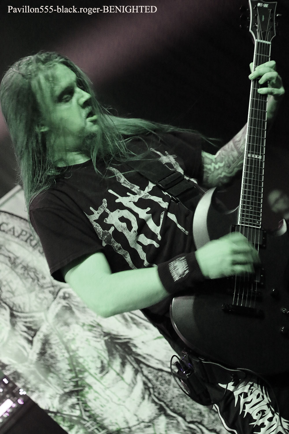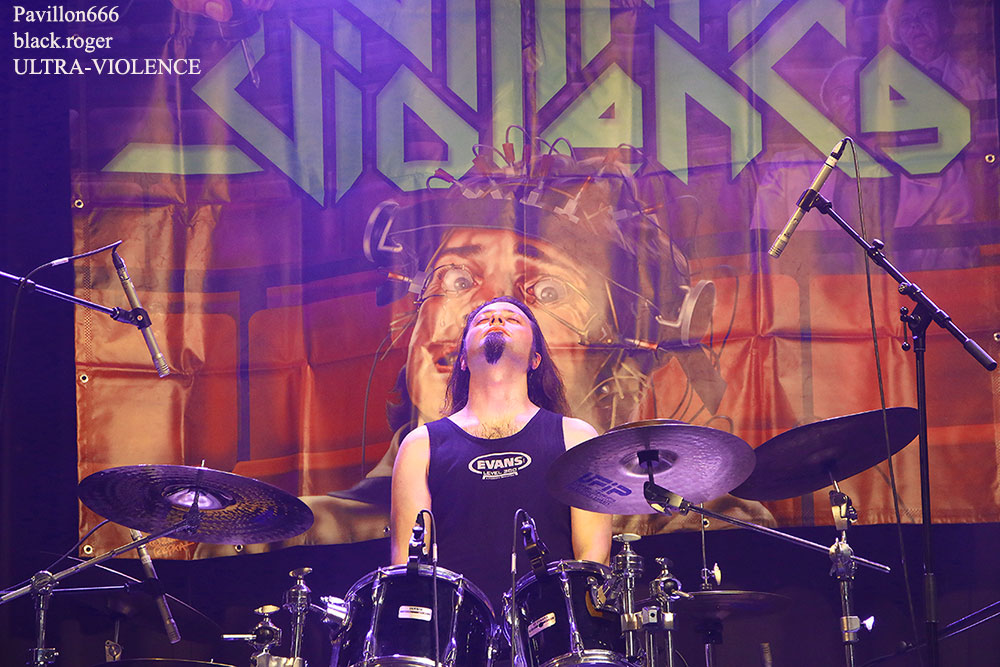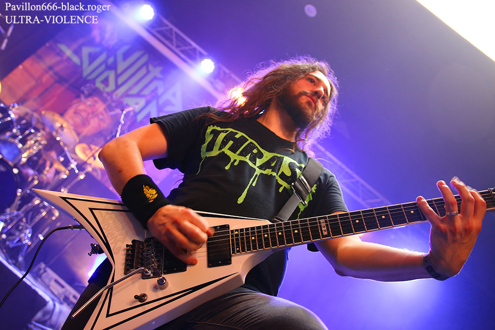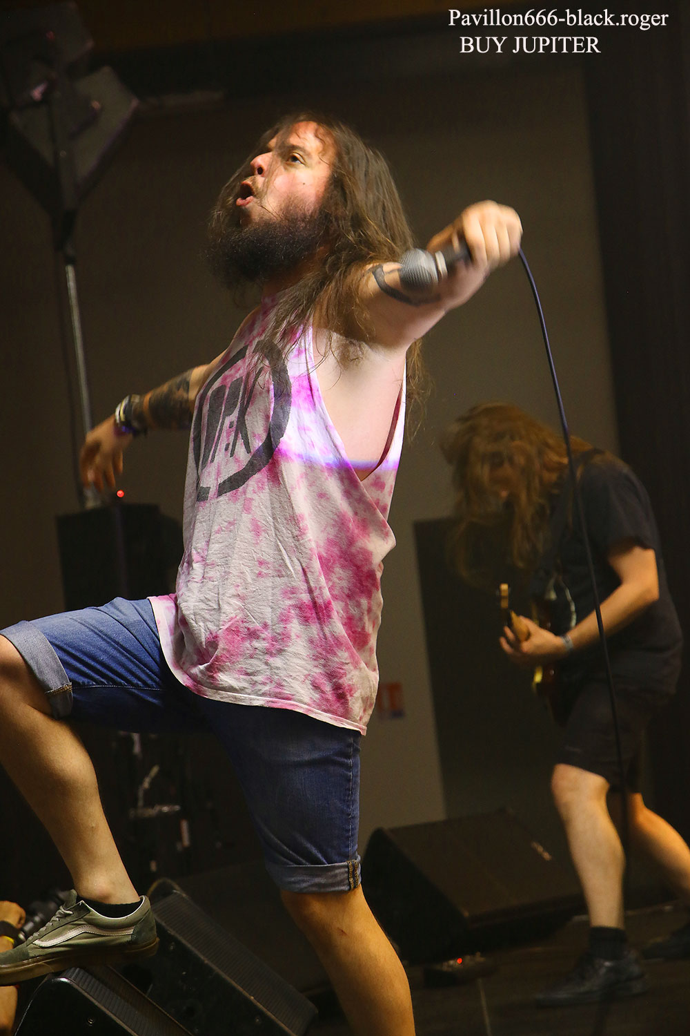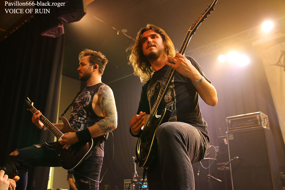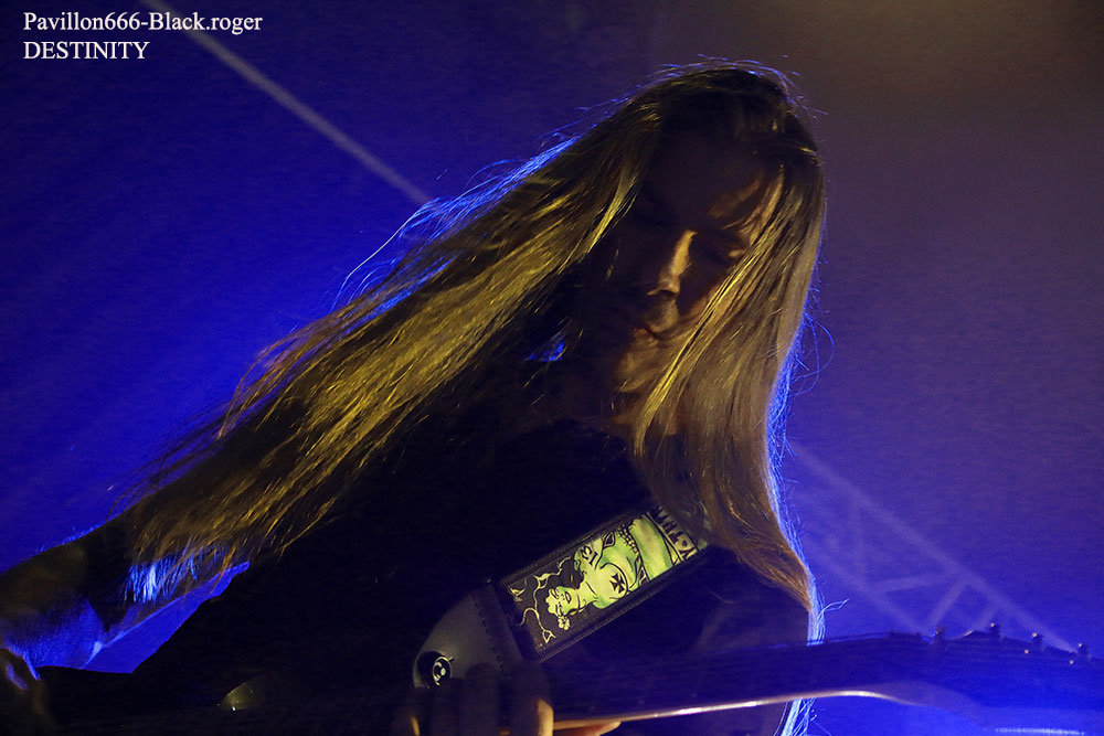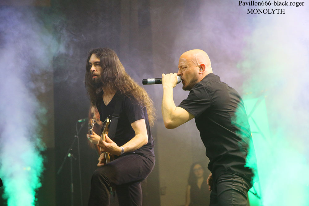 Au menu de cette journée, du thrash, du death, du metal dit « moderne », du heavy-mertaaaal, du brutal death/grind, du pagan et une légende du metal de la mort en tête d’affiche. Ce samedi, il faisait chaud, très chaud, aussi bien dans la salle que dehors dans une ambiance festive où l’on pouvait déguster grillades et chili même en version vegan, le tout arrosé de boissons houblonnés bien entendu. Et puis, dès 14 heures 9 groupes, Français, Suisse, Italien, Russe et Polonais se sont succédé sur, la belle scène des lieux où son et lights bien maîtrisés nous en ont mis plein la vue et les oreilles. MONOLYTH, BUY JUPITER, VOICE OF RUIN, ULTRA-VIOLENCE, LONEWOLF, DESTINITY, BENIGHTED, ARKONA et VADER ont, chacun dans leur style, assuré comme des bêtes (de scène) contribuant ainsi à pérenniser ce festival tout simplement. Voici donc quelques mots, quelques lignes pour traduire le ressenti de Pavillon666 tout au long de cette journée exceptionnelle dans le milieu metal, mais pas que ! Ouverture des portes à 13 heures et première formation en lice dès 14 heures, en l’occurrence ceux de MONOLYTH qui nous viennent de la région parisienne. Une douzaine d’années au compteur, deux albums sous leurs bras au service du thrash/death mélodique, ces musiciens ont vraiment envie de se faire connaitre et reconnaitre il me semble. Ils tournent beaucoup actuellement et le set proposé aujourd’hui fus court mais intense comme l’ont dit dans ces cas-là. Une découverte donc qui demande à être confirmée par la suite, un metal sorti des sentiers battus cela s’apprécie. BUY JUPITER de Lyon prend la suite pour un show très chaud, tout simplement chaotique en fait dans tous les sens du terme. Ces « gones » pratiquent un metal extrême, progressif et alambiqué, comme le ferai un certain Meshuggah, sauf qu’ici l’urgence du punk fait surface bien souvent dans des compositions où un certain post-hardcore, post-quelque chose si vous voulez, vous prend à la gorge et ne vous lâche plus tout simplement. Mais en live, c’est une autre histoire car leurs titres prennent une autre dimension (spatiale ?) notamment avec la présence intenable d’un frontman qui en fait des tonnes sur scène et dans le public évidemment. Bref, métalleux cardiaques ou sujets à l’arythmie faites bien attention car Buy Jupiter ne vous est pas conseillé. Mais pour tous les autres quelle aventure musicale (leur set bien entendu), énorme tout simplement. Si vous vous lez aller plus loin avec eux écoutez et digérez donc leur nouvel EP « éclipse » vous m’en direz des nouvelles ! Les « petits Suisses » de VOICE OF RUIN ne sont pas venus à Montagny ce premier jour de Juin pour nous faire gouter au chocolat au lait (Suisse), mais pour nous « purger » et nous « purifier » à l’aide d’un metal qualifié au départ de metalcore fermier. Mais c’était bien réducteur car en fait nos vaudois mixent à merveille thrash et death saupoudré de « core » et groovy à souhait. Les envolées et soli guitaristiques vous laminent la matière grise le tout soutenu par une rythmique d’enfer qui cogne, qui frappe là où ça fait mal (ou bien, c’est selon). Randy, en frontman passionné vous met un direct « in your face » afin de vous faire digérer le tout. Donc encore une fois nous en avons pris plein la « g…le » et ce fus bien (qui a dit comme d’habitude ?). Pas le temps de reprendre ses esprits que déjà les transalpins d’ULTRA-VIOLENCE viennent sur scène afin de nous tabasser ce qui nous sert de cervelle avec leur thrash old-school, sans faux semblants, sans faux plis, sans concession. Ceux de Turin au Piémont ne font pas dans la dentelle c’est certain et tournent actuellement afin de nous présenter entre autre leur troisième album intitulé « operation misdirection » (2018). Et en live leur thrash sort tout « riffs » dehors et nous griffe les conduits auditifs, alors comme tout bon thrash qui se respecte on va dire que ça valait le « cou ». Pas de surprise donc mais une efficacité à toute épreuve, violente donc, avec une rythmique à décorner un troupeau de buffles en rut, on aime tout simplement. Après le thrash, voici le heavy-metal, mais pas n’importe lequel, celui des vétérans du style LONEWOLF originaires de Grenoble qui restent fidèles au style depuis presque trente années au compteur. Les isérois nous proposent donc un power-metal épique à souhait. Leurs compositions sont toujours aussi inspirées, c’est propre, carré, mais en live cela manque un peu de présence c’est tout ce que l’ont peu leur reprocher. En tous cas les amateurs du genre semblent avoir bien apprécié et c’est tant mieux. Beaucoup de gens s’étaient déplacé aussi afin de revoir DESTINITY. Un Destinity qui renait de ses cendres et qui repart au combat du metal après avoir fait un « galop d’éssai » concluant dernièrement au Ninkasi de Lyon, comme quoi tout peut arriver, et c’est tant mieux. Oui, tant mieux car nos héros locaux avaient laissé une trace indélébile dans le paysage death-mélodique à l’aide de quatre albums remarqués et plus de 400 concerts donnés à travers toute l’Europe. Alors oui, fans de Dark Tranquillity et In Flames (des débuts), bref du metal dit de « Göteborg » en Suède vous avez aimé Destinity, vous avez regretté leur séparation il y a quelques années, alors réjouissez-vous Destinity reviens plus fort que jamais et leur prestation de ce soir à Montagny a enfoncé le clou, définitivement ! Pour les amateurs de brutal death/grind, BENIGHTED monte sur les planches du Trait d’Union afin de vous coller contre les murs encore une fois, et sans préavis. Benighted qui a trainé ses « growls » et poussé ses « gruiks » jusqu’aux « states » est là devant vous ce soir, alors « let the blood spill between my broken teeth », vous n’aviez pas mis votre « protège-dent ? Alors tant pis pour vo