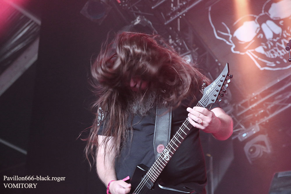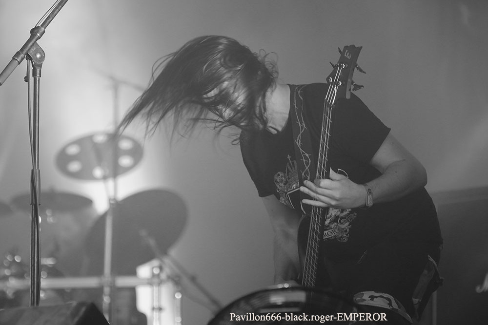 Et le set commence, brutal, avec les tricotages complexes des deux guitaristes et la rythmique qui s’abbat sur nous comme une chape de plomb. Les « growls » et les hurlements vous mettent mal à l’aise, mais que c’est bon, délectable et morbide à souhait, on aime, que dis-je on adore.
