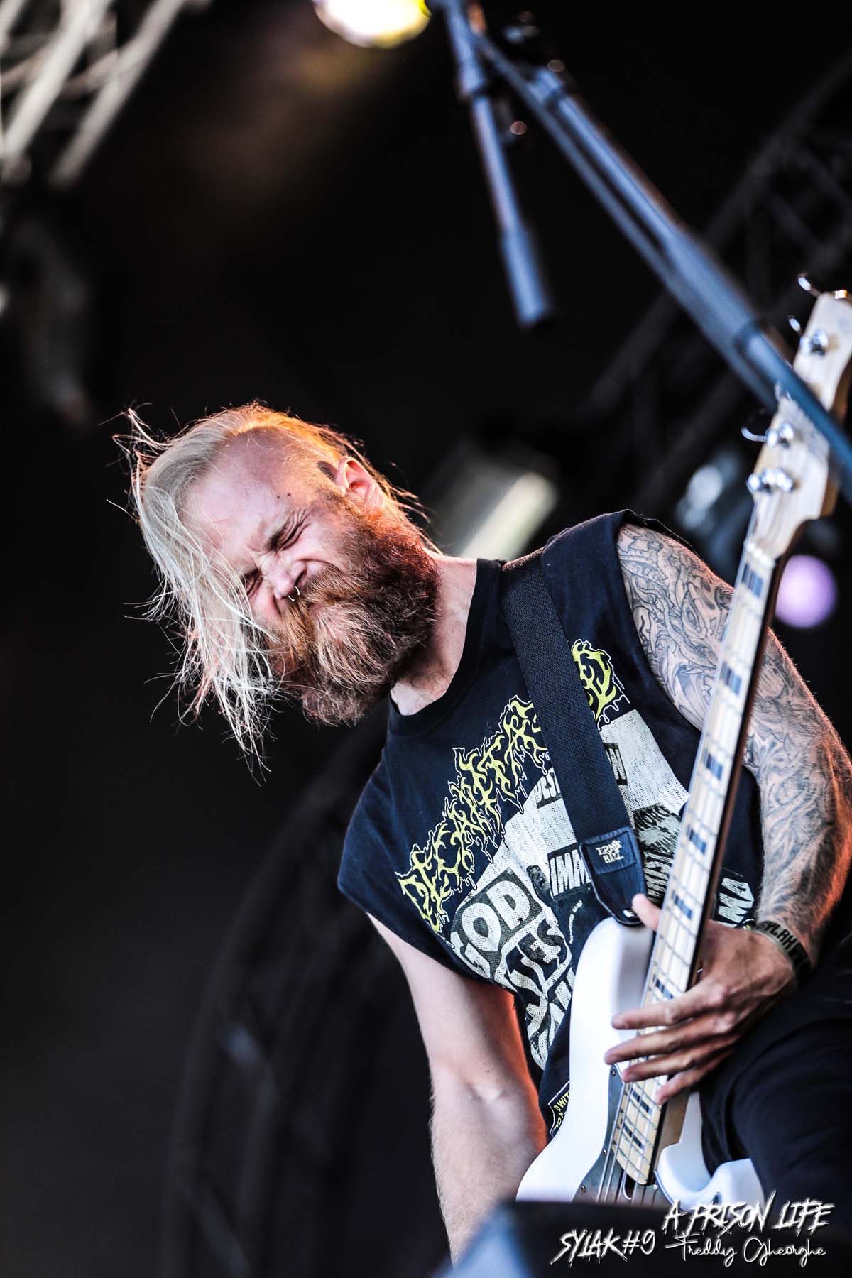 Du HardCore bien fat, puissant et frontal pour démarrer ce dimanche sous vos applaudissements avec PRISON LIFE, combo bisontin qui fleure bon le XHCX des nineties ! Le quatuor dont les membres affichent un put1 de charisme, n’est pas venu au SYLAK pour enfiler des perles ! Pas de mollesse, pas de finesse, du brut de fonderie envoyé sans détour dans nos faces ahuries de bon matin ! Faut dire qu’avec des morceaux comme « Your life is a prison » ou encore « Choose the caliber », le style est en phase et propice à la violence musicale made in Franche-Comté ! Bien emmené par Jean-Phi (frontman / chanteur), PRISON LIFE livre une excellente prestation, aussi remarquée qu’appréciée par un public démonstratif aux premières heures ! Cette édition du SYLAK aura fait une part belle au XHCX et franchement, qui va s’en plaindre ?! A découvrir urgemment !