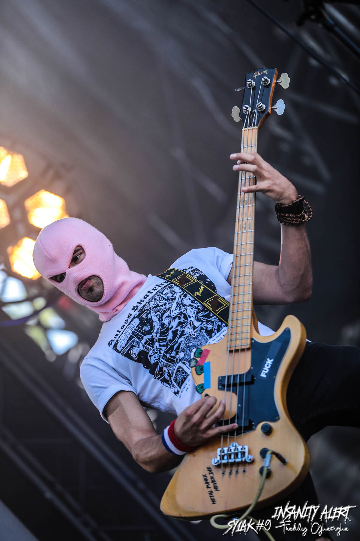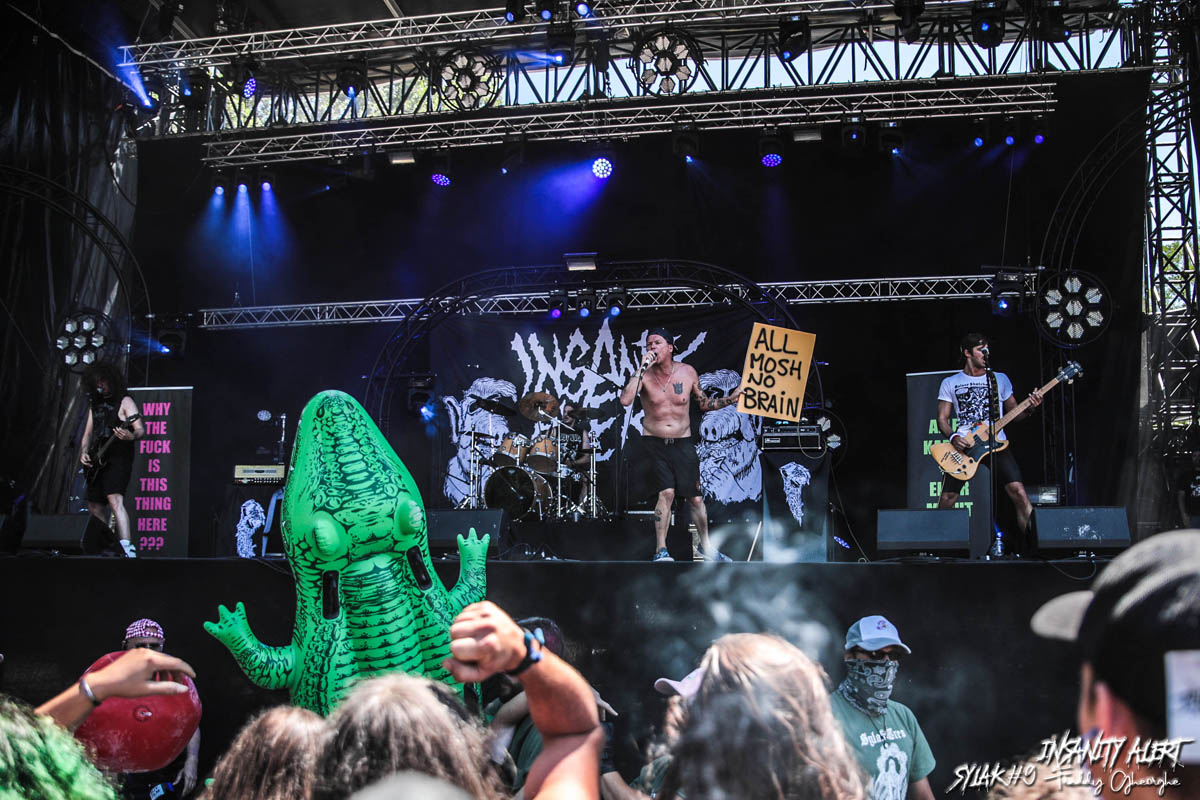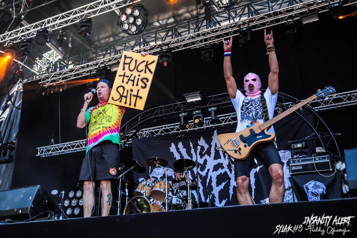 Après avoir retourné le ROCK’N’EAT il y a peu, INSANITY ALERT est de retour dans la région pour répandre son All Mosh – No brain Thrash Crossover, visiblement très attendu par une foule d’ores et déjà conquise et ne demandant qu’à en découdre ! Faut dire que la folie déjantée autrichienne s’y prête bien et les bougres ont une forme olympique qu’ils vont mettre à contribution pour renverser le SYLAK ! Tout y passe, des masques loufoques aux traditionnels panneaux indicateurs, des pas de danse Piccolo à l’humour dévastateur (auf französich bitte !) pour que le mosh pit ne sache plus où il habite sur chacun des morceaux qui font tous mouche ! Délire total et total chaos dans la fosse sur « All mosh no brain », « Metal punx never die » et le célèbre « Run to the pit » version revisitée du morceau presque éponyme d’IRON MAIDEN ! Inutile de vous dire que pour bon nombre de festivaliers, INSANITY ALERT restera comme le groupe qu’il ne fallait pas louper lors de cette édition ! Et franchement, ce n’est pas moi qui vais vous dire le contraire !